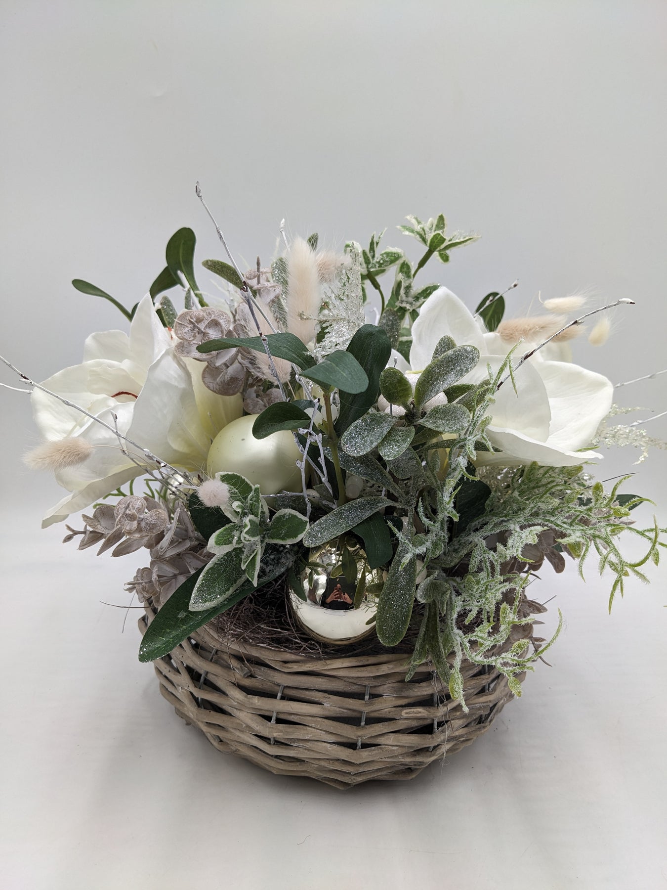 Tischgesteck im Korb, Kugeln, Misteln, Amaryllis, Salbei, Eukalypthus und Gräser, Farbe: weiß, grün, Höhe: ca. 31 cm, Durchmesser: ca. 25 cm, 3628-2025