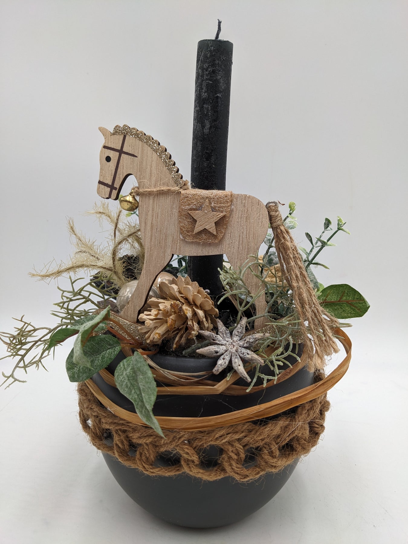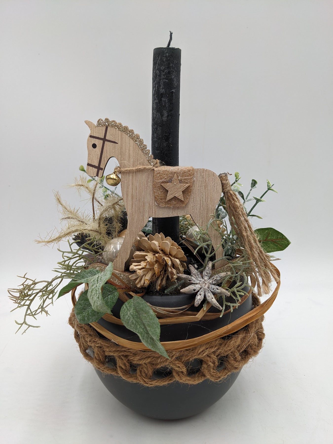 Tischgesteck im Topf mit Kerze, Kugeln, Anis, Zapfen, Schaukelpferd, Blätter und Gräser, Farbe: schwarz, natur, Höhe: ca. 28 cm, Durchmesser: ca. 14 cm, 3604-2025