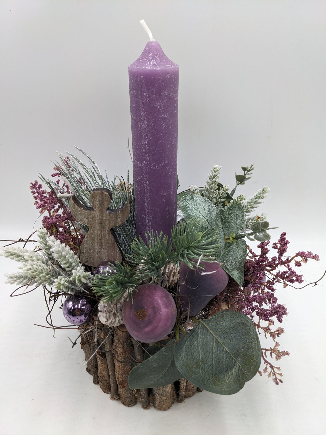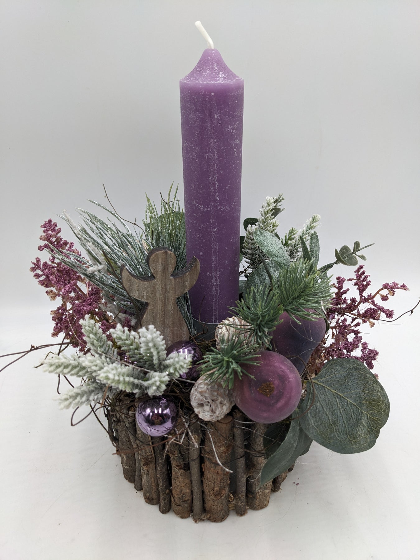 Tischgesteck im Geäst mit Kerze, Kugeln, Engel, Zapfen, Eukalypthus und Tanne, Farbe: lila, grün, Höhe: ca. 30 cm, Durchmesser: ca. 15 cm, 3843-2025