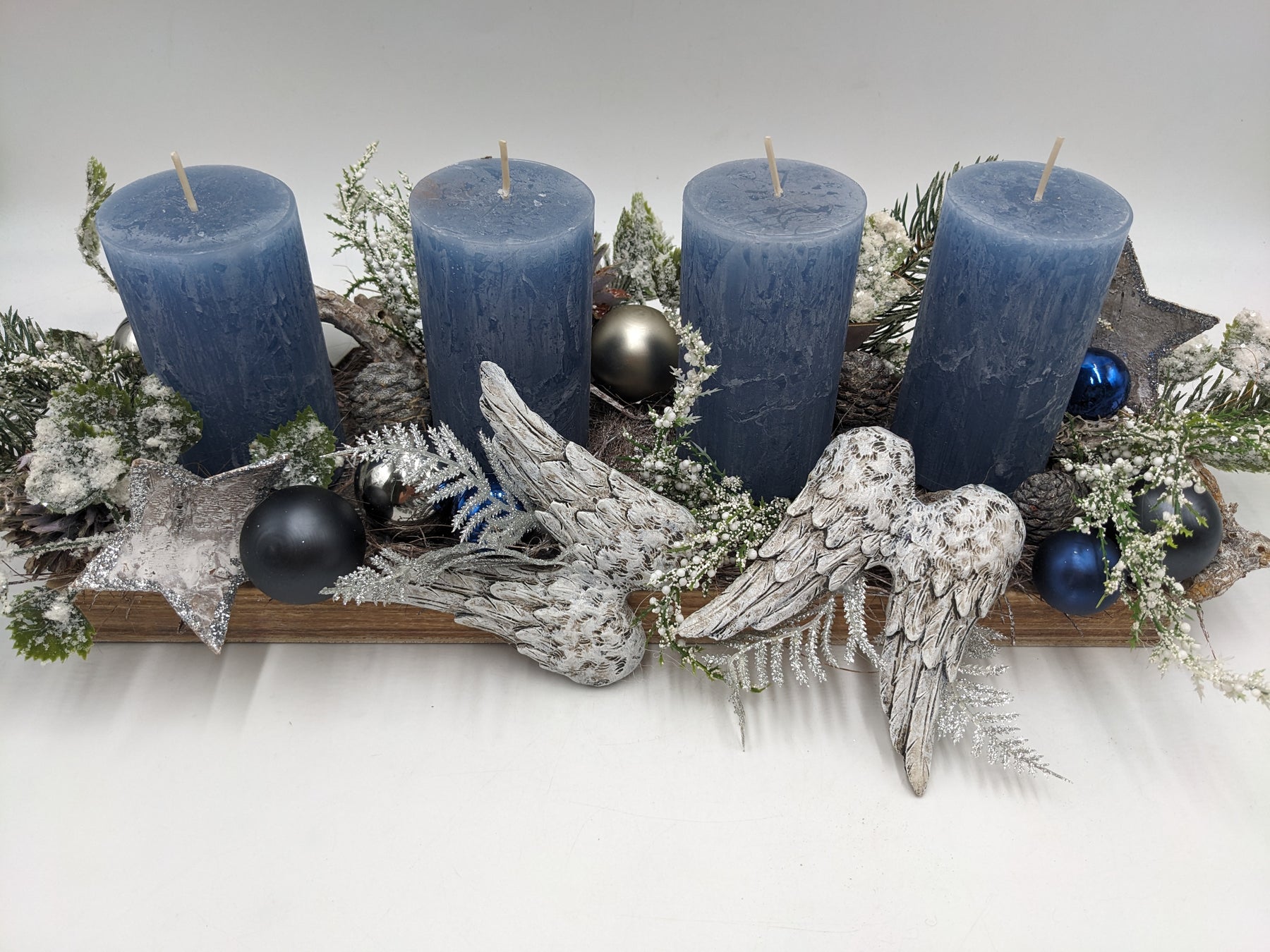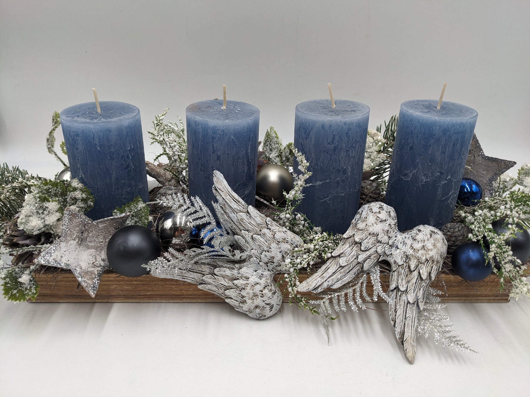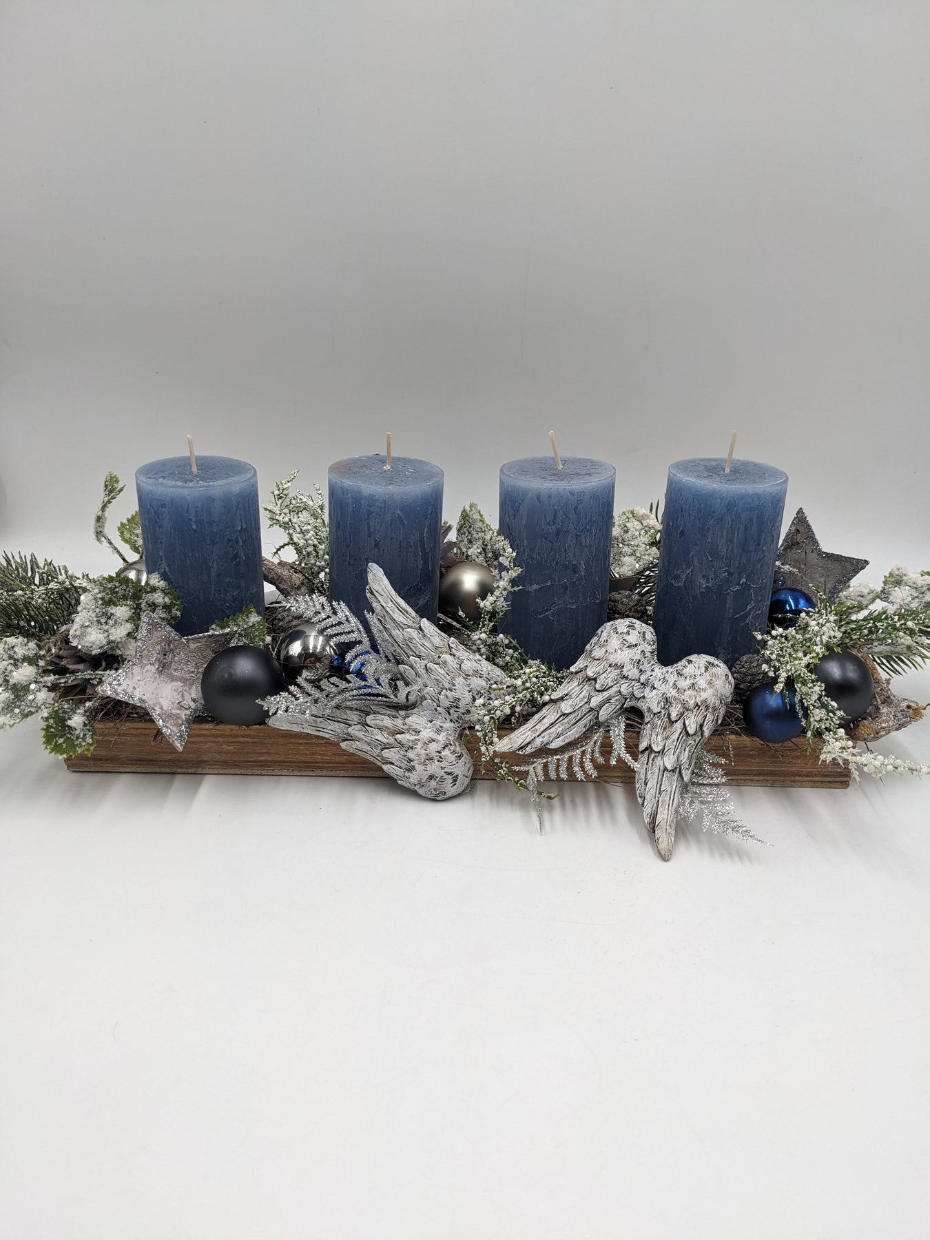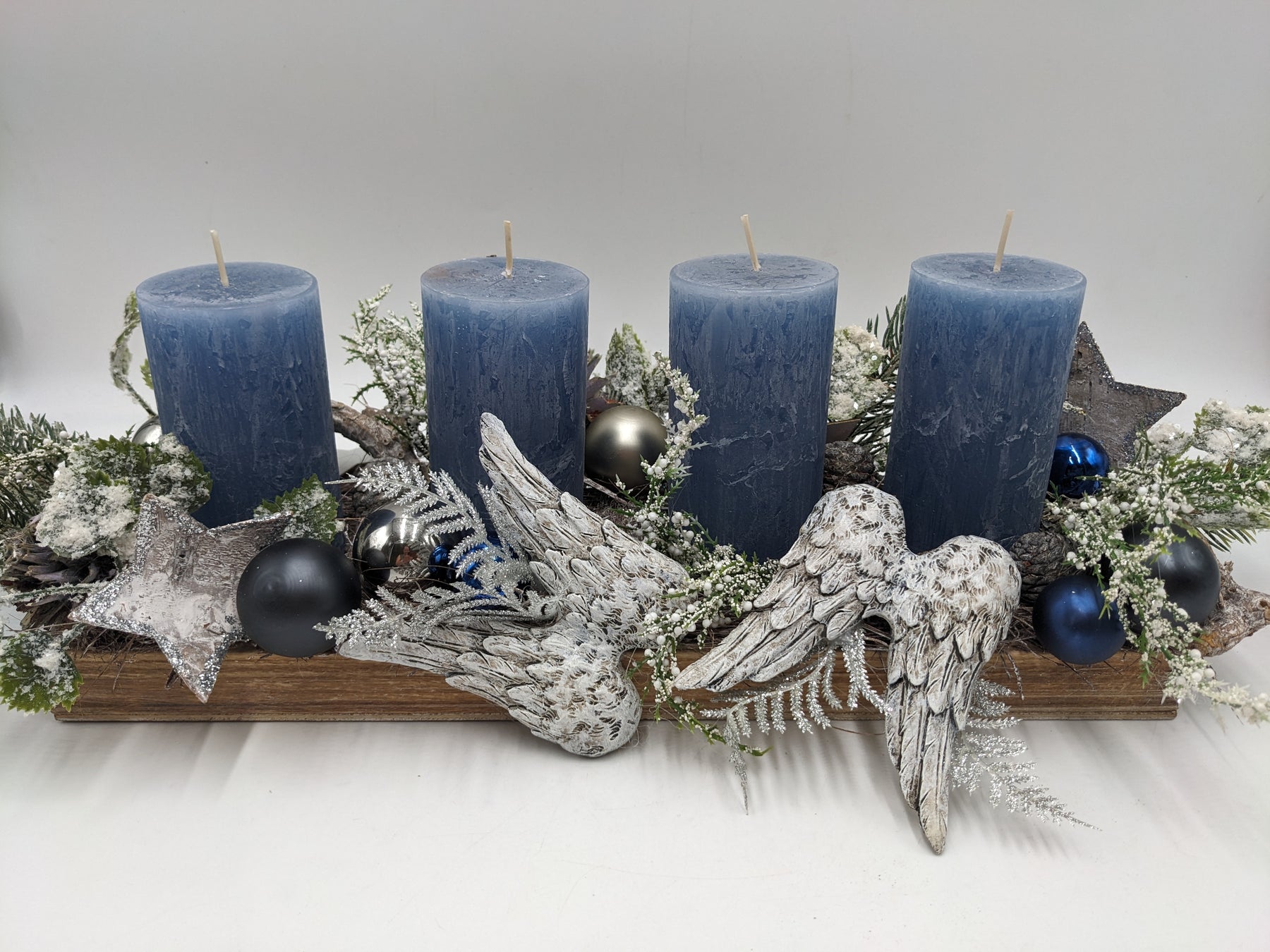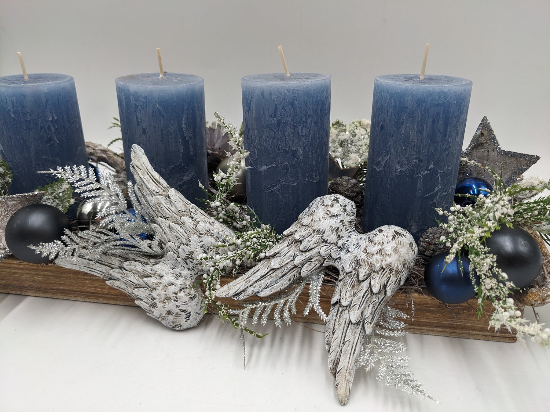 Weihnachtsgesteck Kugel Flügel Stern blau