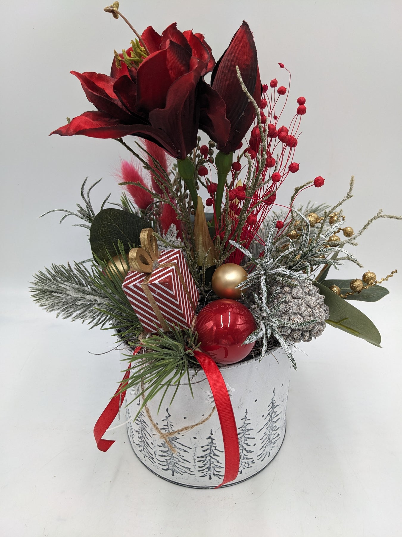 Tischgesteck im Topf, Schleife, Kugeln, Zapfen, Geschenk, Amaryllis, Beeren und Tanne, Farbe: rot, weiß, gold, Höhe: ca. 31 cm, Durchmesser: ca. 13 cm, 3830-2025
