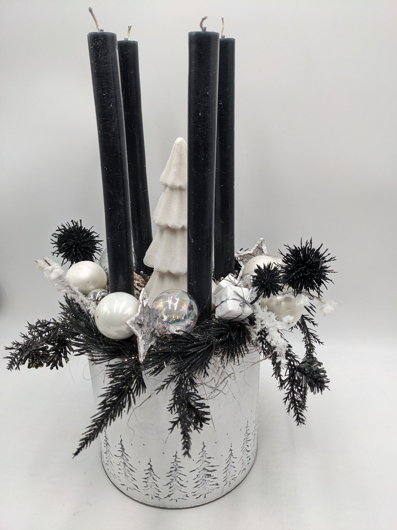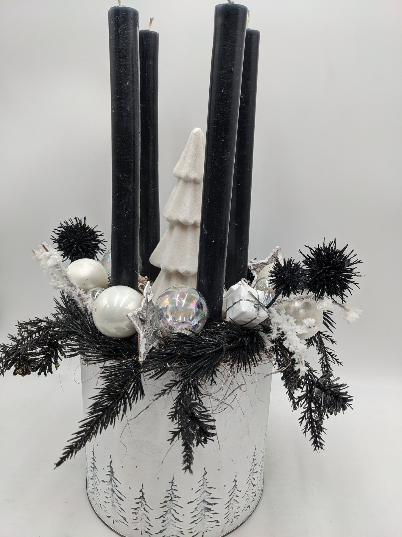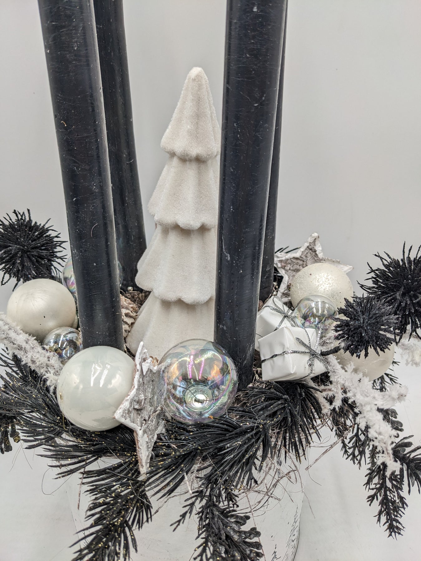Tischgesteck im Topf mit Kerzen, Kugeln, Geschenke, Sterne, Tannenbäumchen, Gräser und Tanne, Farbe: schwarz, weiß, irisierend, Höhe: ca. 42 cm, Durchmesser: ca. 17 cm, 3840-2025