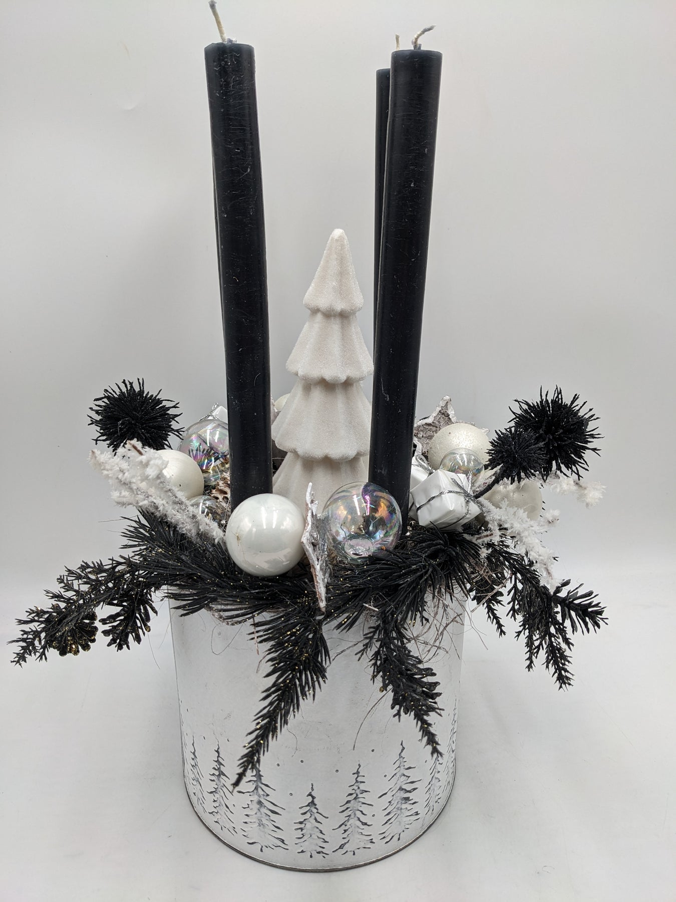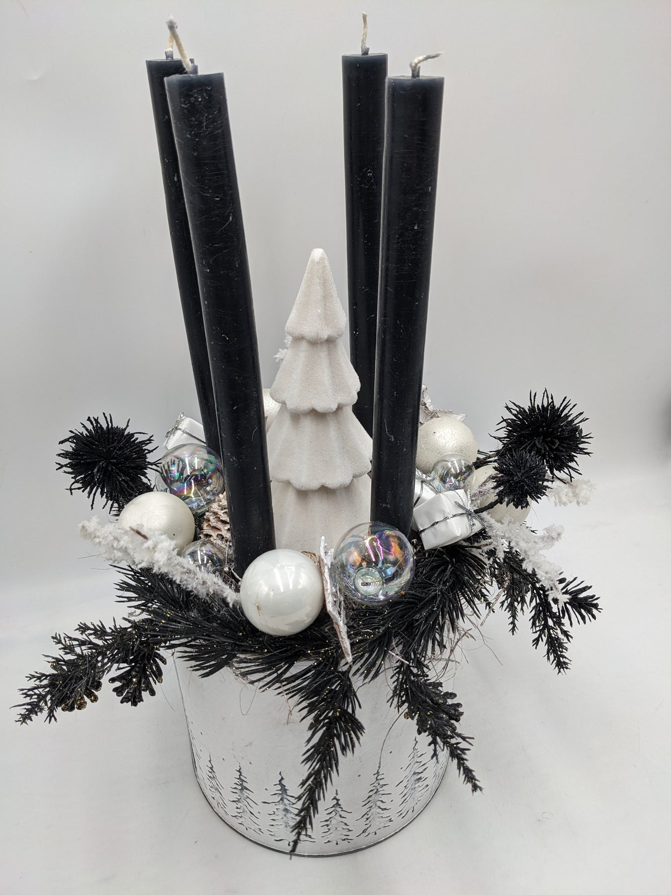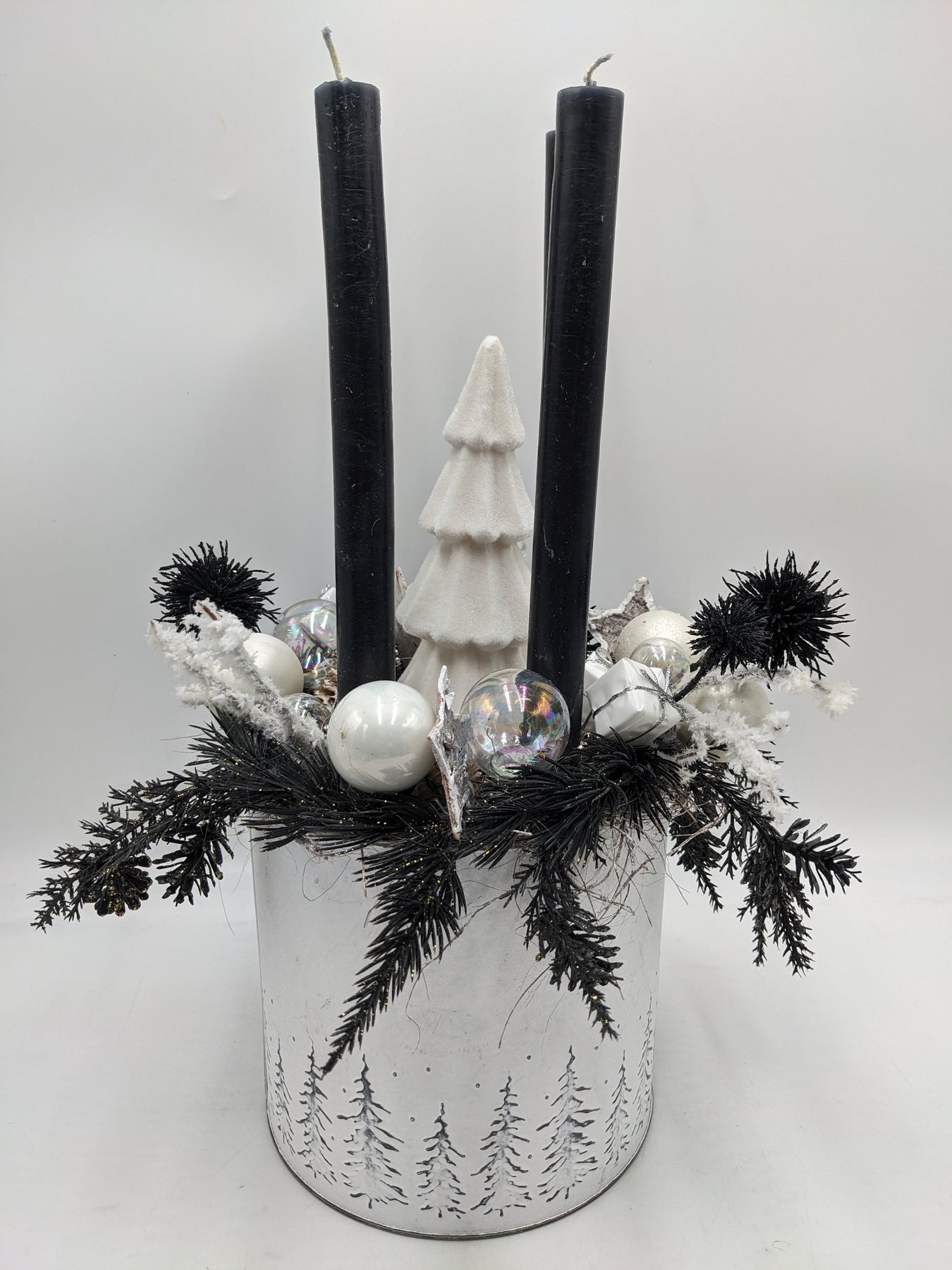 Tischgesteck im Topf mit Kerzen, Kugeln, Geschenke, Sterne, Tannenbäumchen, Gräser und Tanne, Farbe: schwarz, weiß, irisierend, Höhe: ca. 42 cm, Durchmesser: ca. 17 cm, 3840-2025