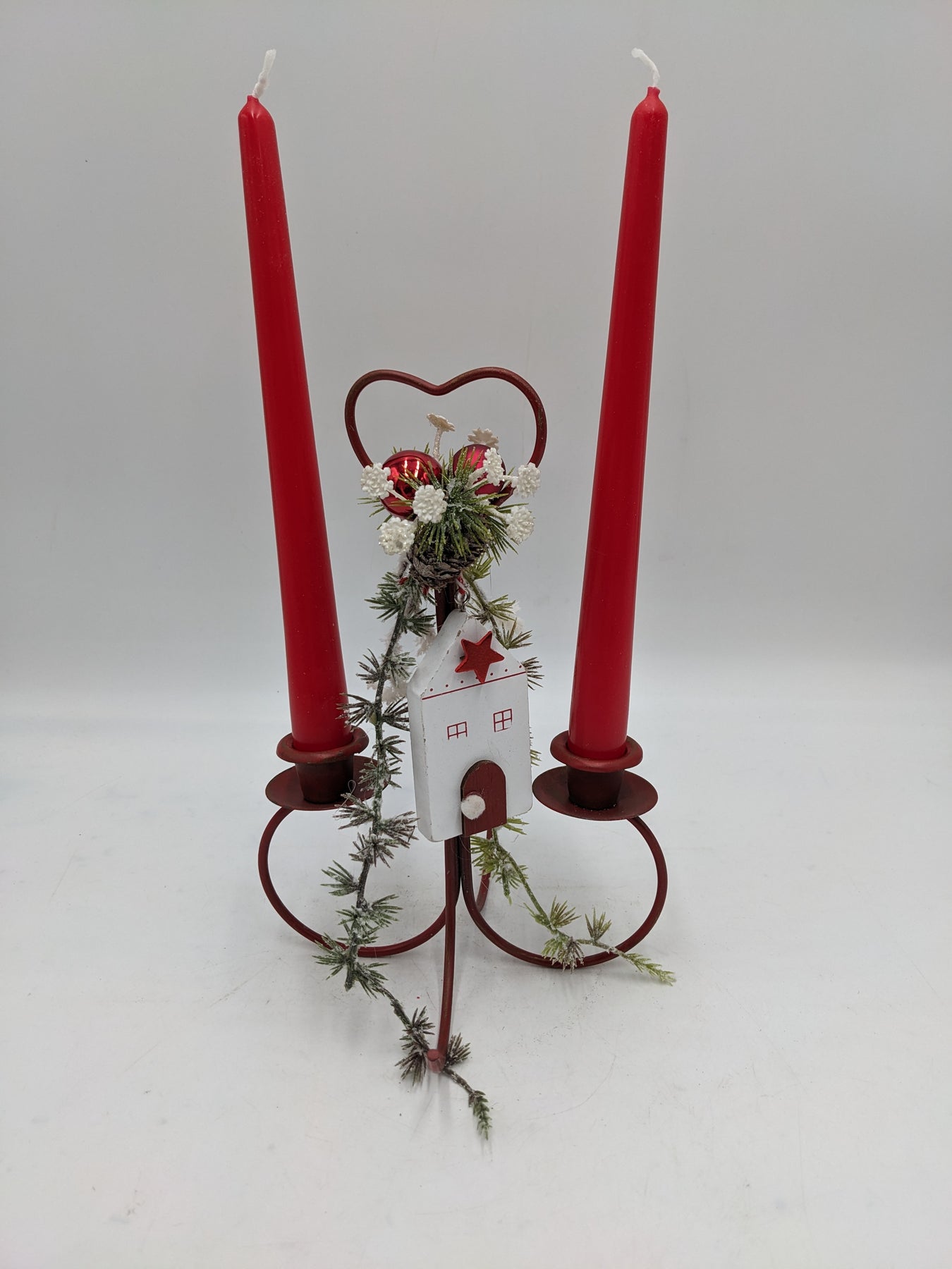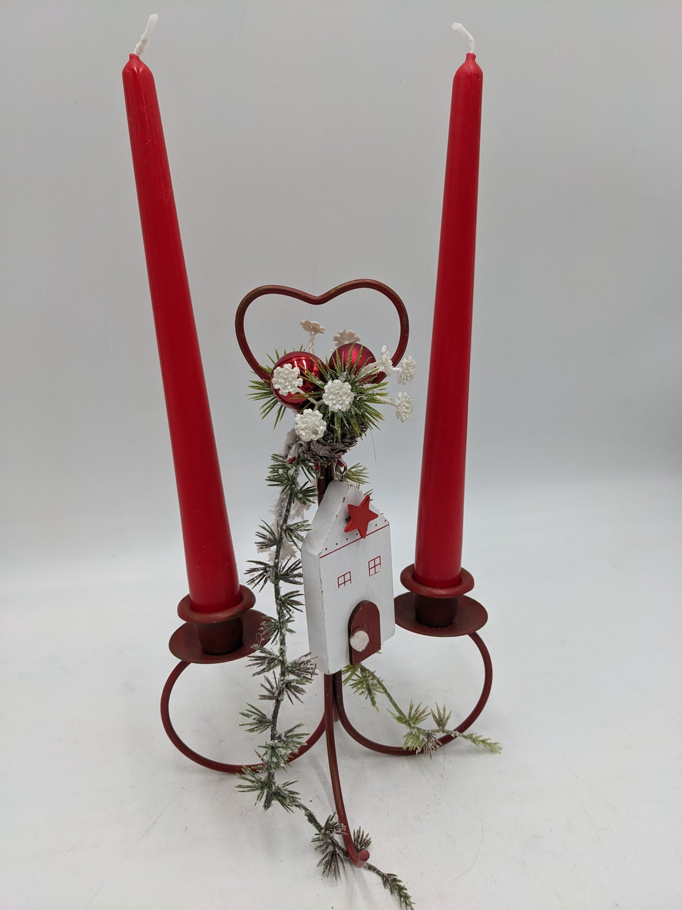 Kerzenständer mit Kerzen, Kugeln, Haus, Zapfen und Tanne, Farbe: rot, weiß, Höhe: ca. 33 cm, Breite: ca. 17 cm, 3968-2025