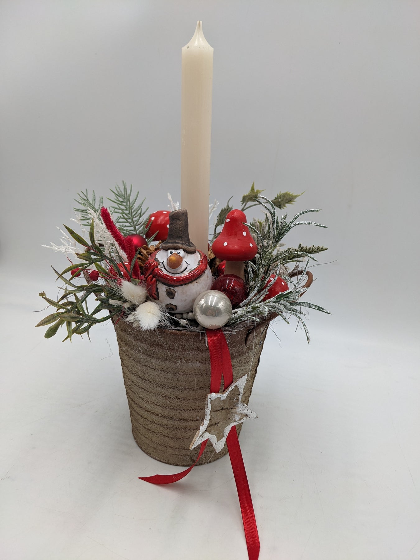 Tischgesteck im Topf mit Kerze, Kugeln, Schleife, Stern, Pilze, Weihnachtsmann, Gräser und Tanne, Farbe: creme, rot, 3825-2025