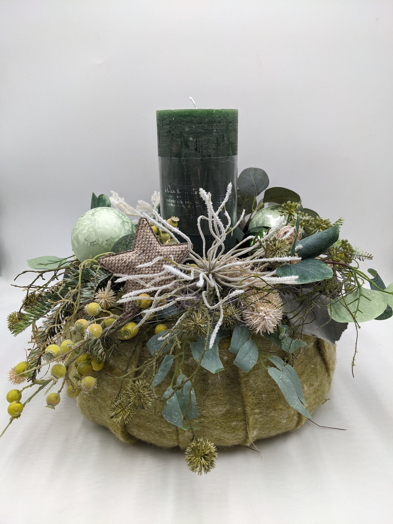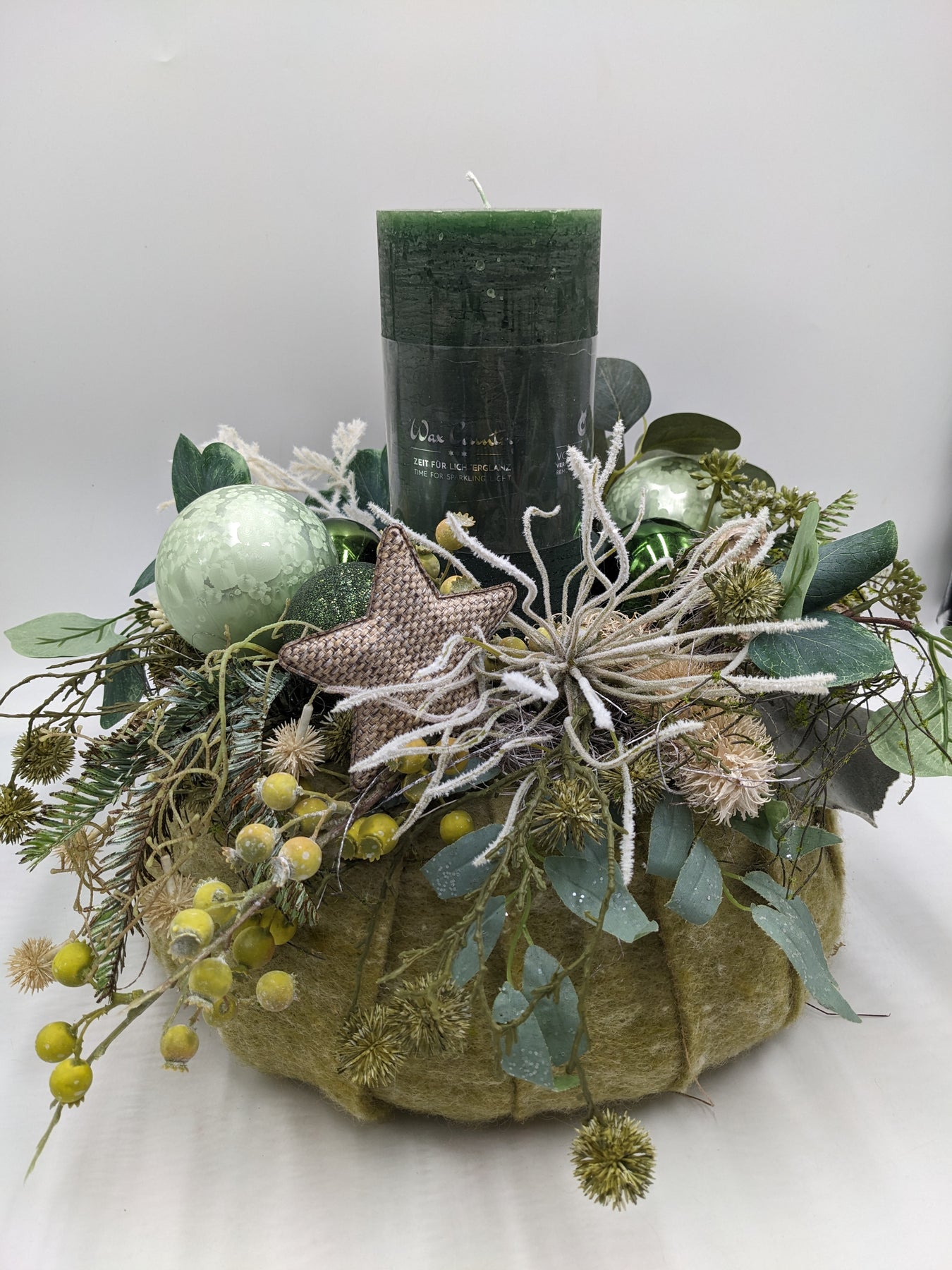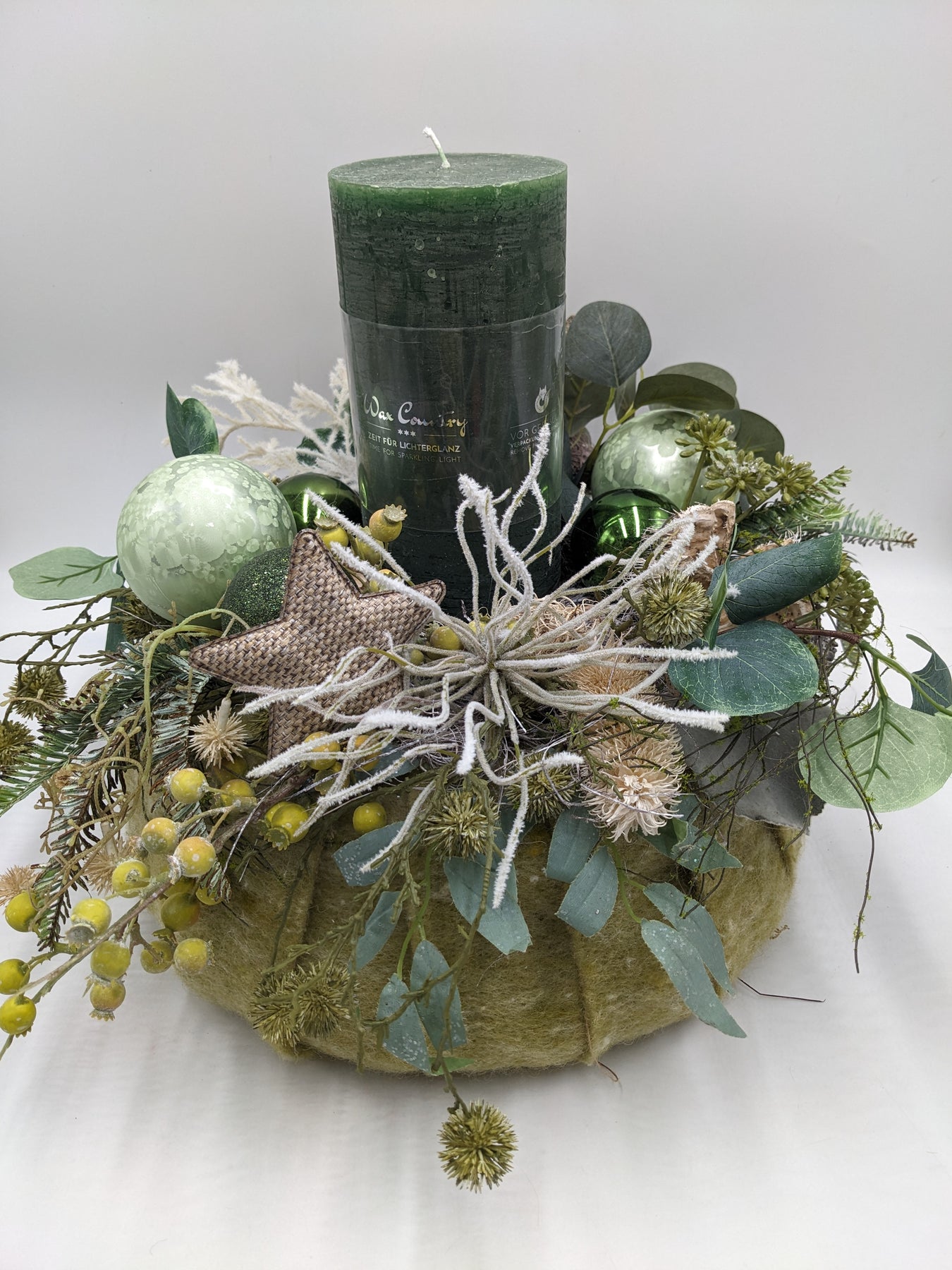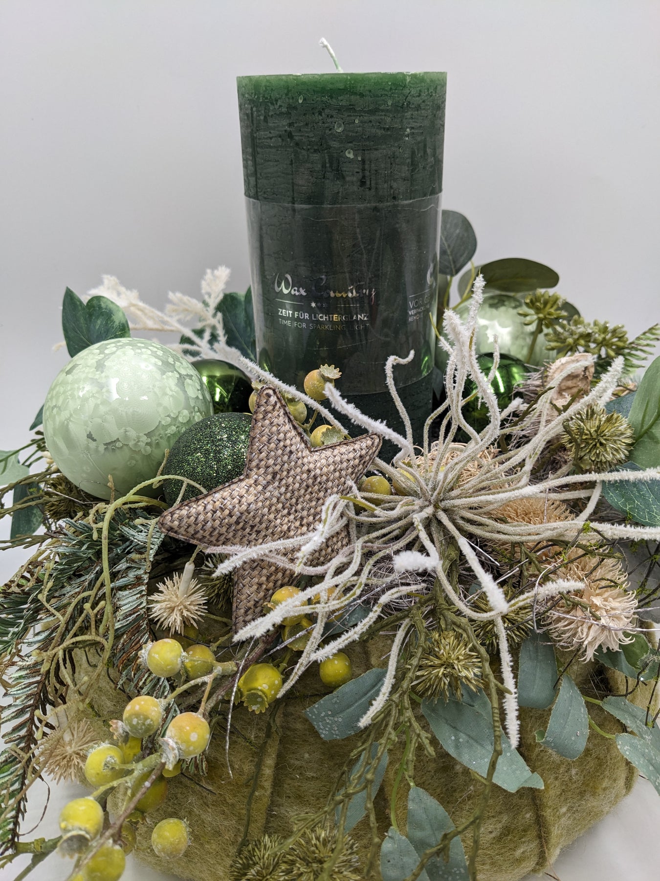 Tischkranz mit Kerze, Kugeln, Spider, Stern, Beeren , Eukalypthus, Gräser und Tanne, Farbe: grün, natur, Höhe: ca. 36 cm, Durchmesser: ca. 35 cm, 3764-2025