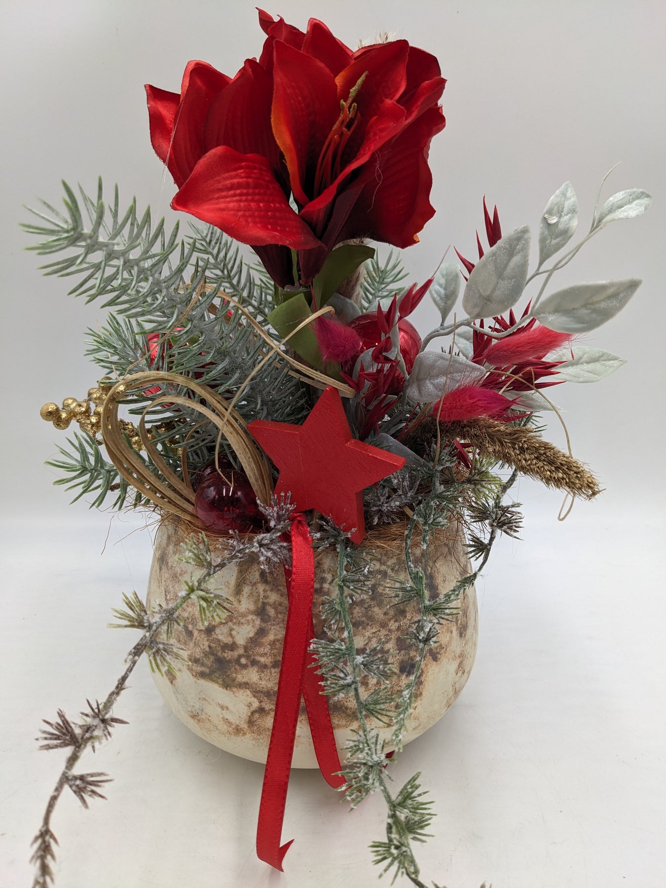 Weihnachtsgesteck Kugel Stern Amaryllis rot