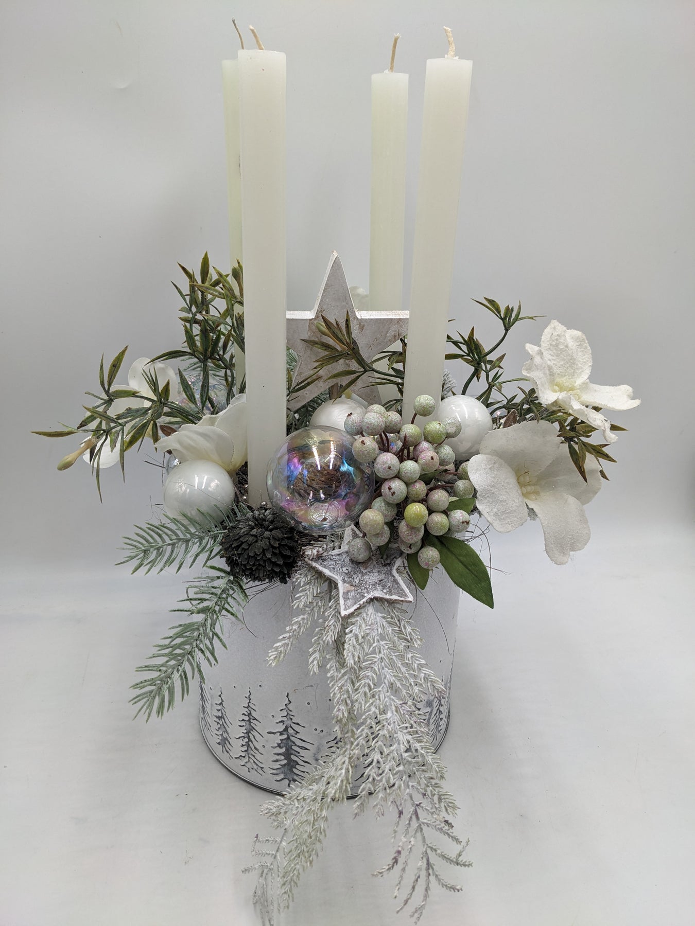 Tischgesteck im Topf mit Kerzen, Kugeln, Sterne, Christrosen, Beeren, Gräser und Tanne, Farbe: weiß, mint, Höhe: ca. 42 cm, Durchmesser: ca. 17 cm, 3846-2025