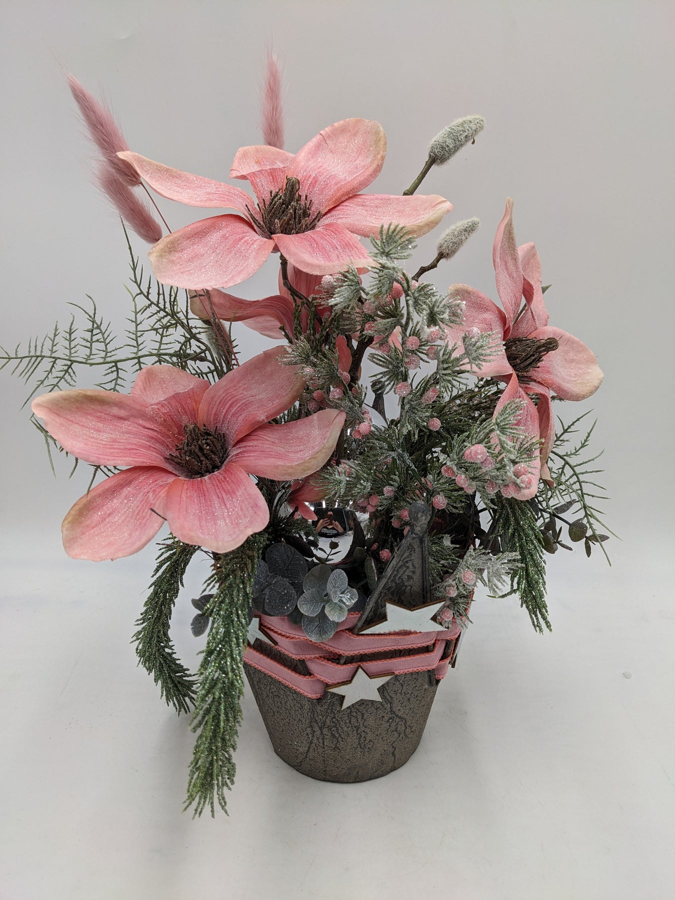 Tischgesteck im Kronentopf mit Schleifenband, Kugeln, Sterne, Magnolien, Beeren, Gräser und Tanne, Farbe: rosa, grün, Höhe: ca. 37 cm, Durchmesser: ca. 15 cm, 3621-2025