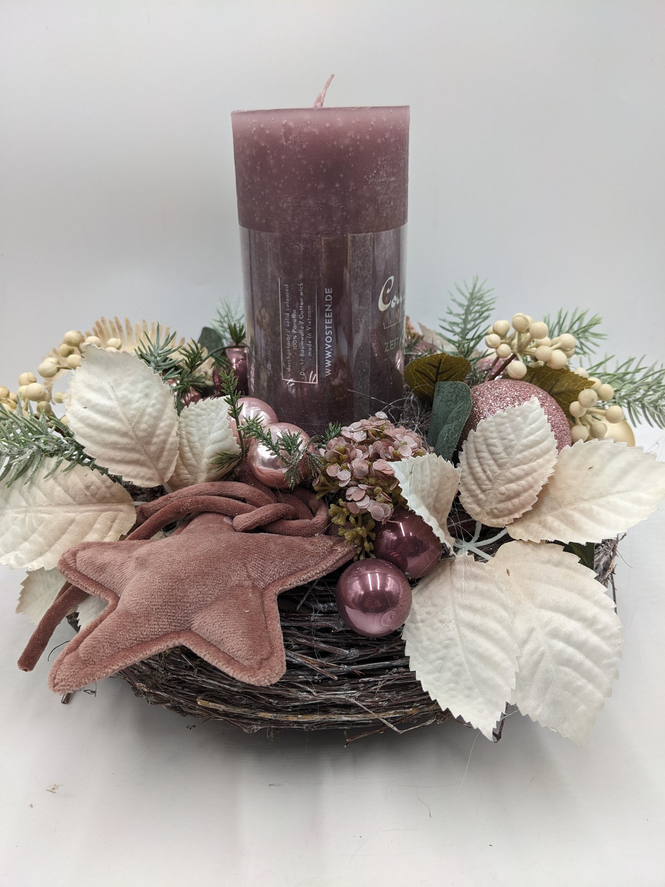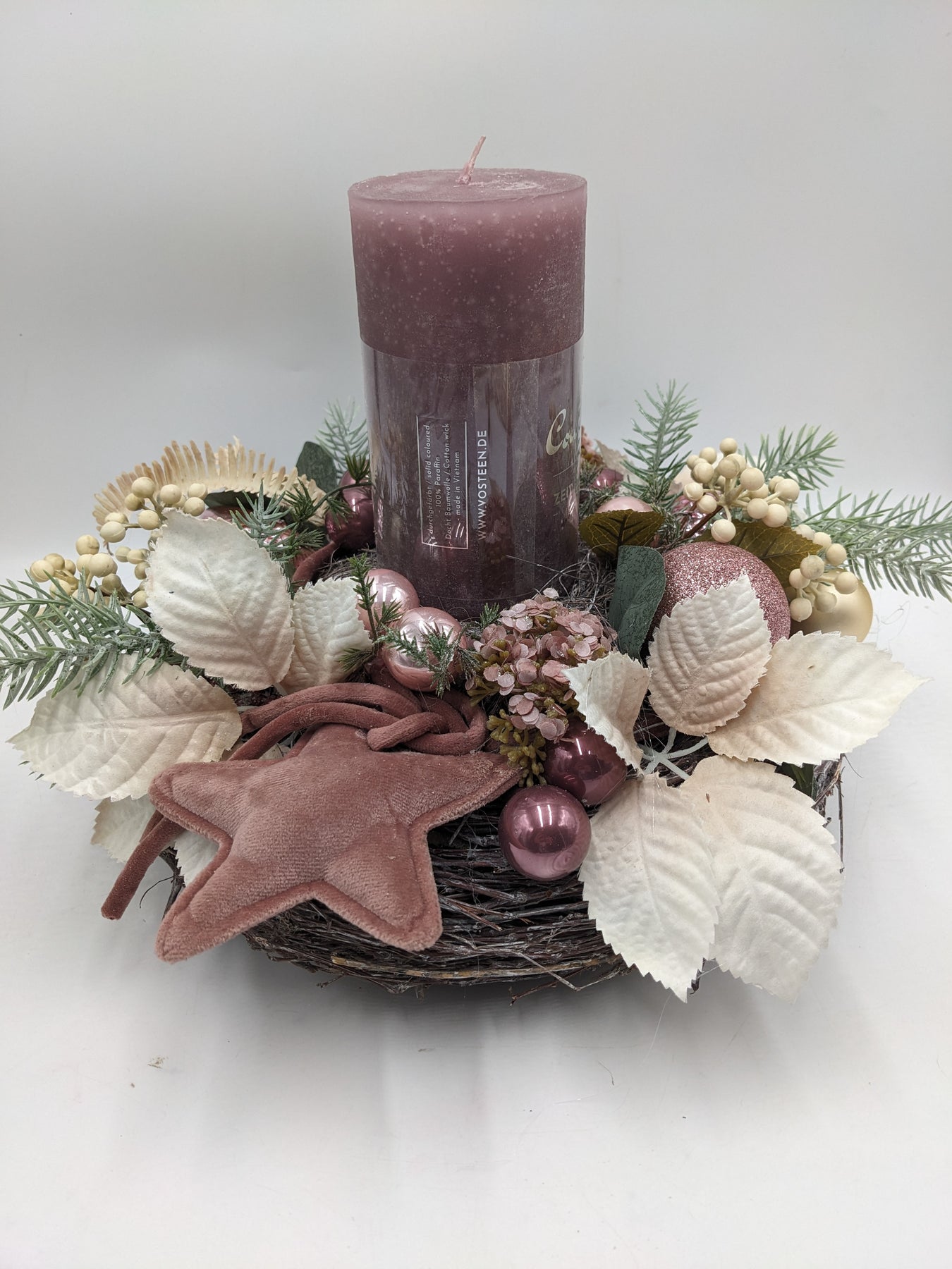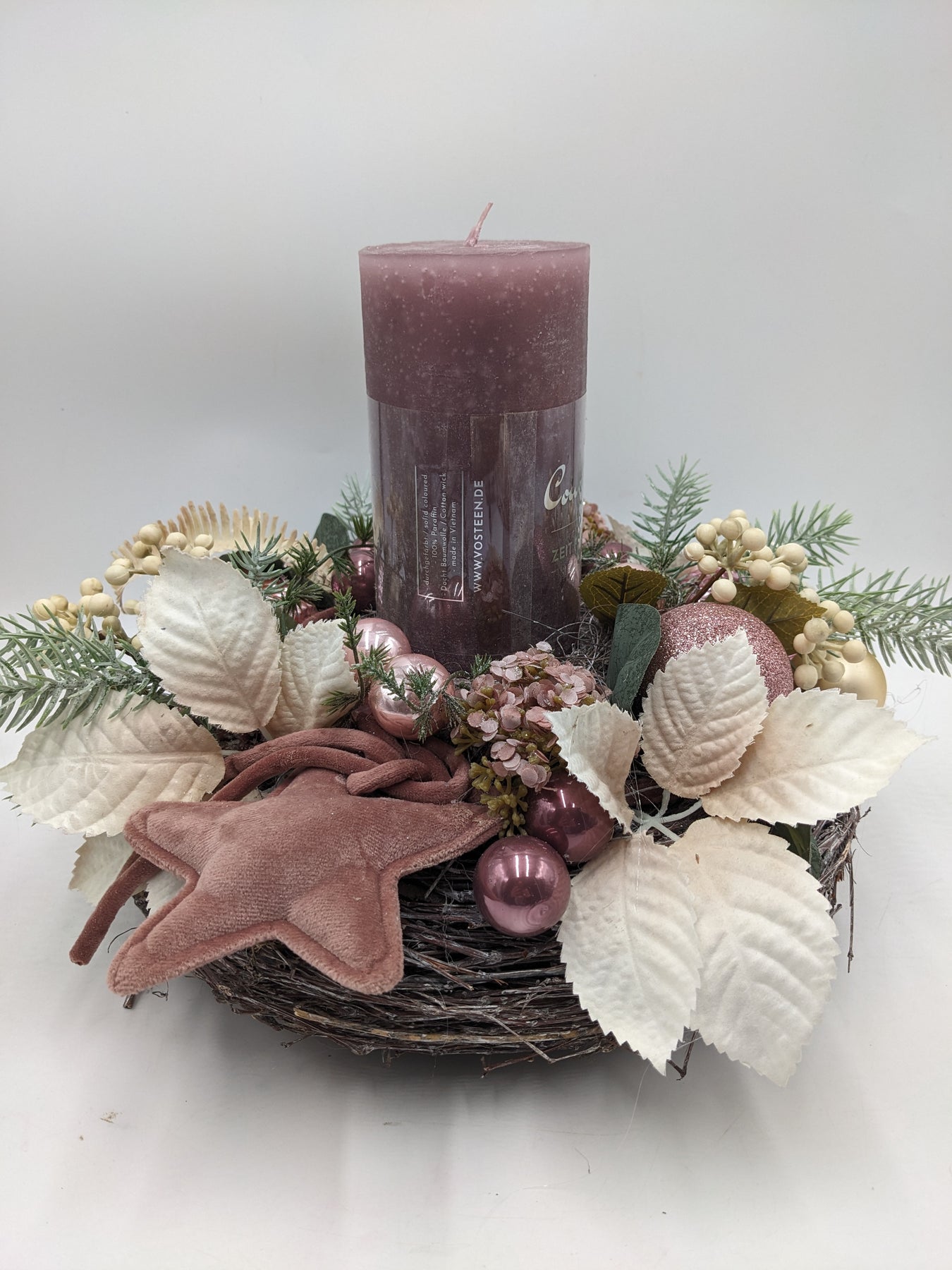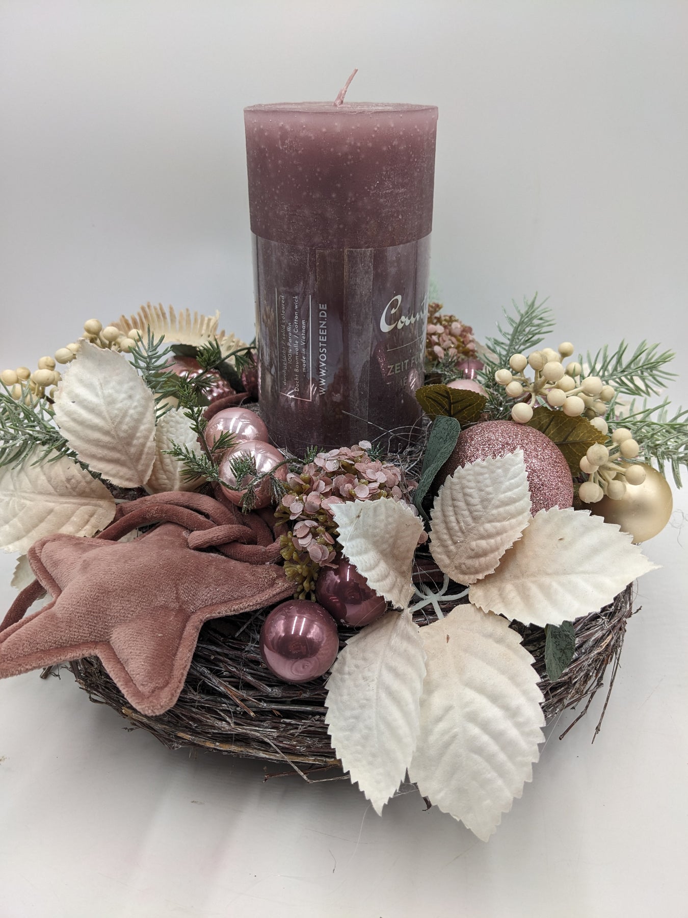 Tischkranz mit Kerze, Kugeln, Stern, Blätter, Farn, Beeren und Tanne, Farbe: rosa, creme, Höhe: ca. 28 cm, Durchmesser: ca. 30 cm, 3947-2025