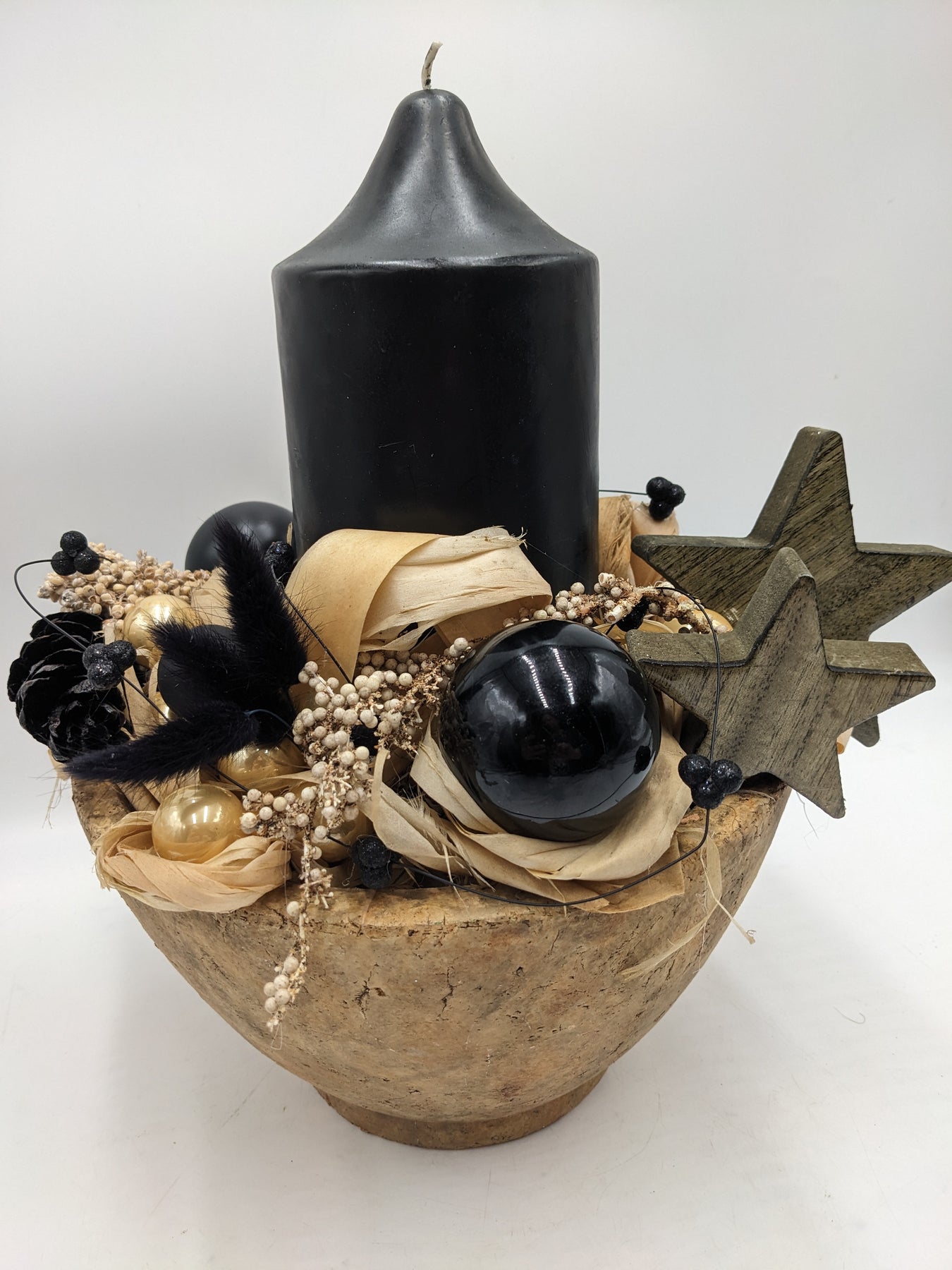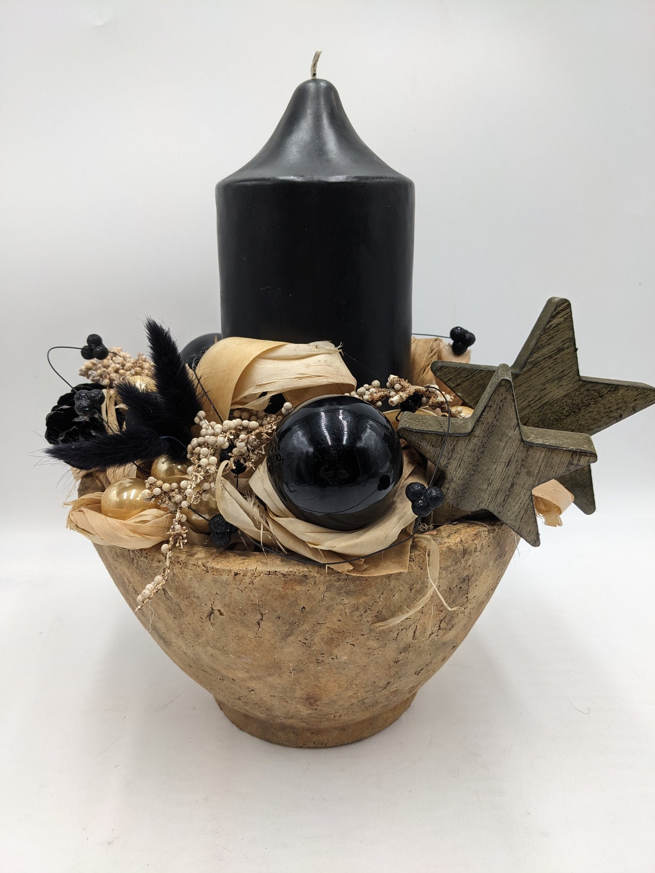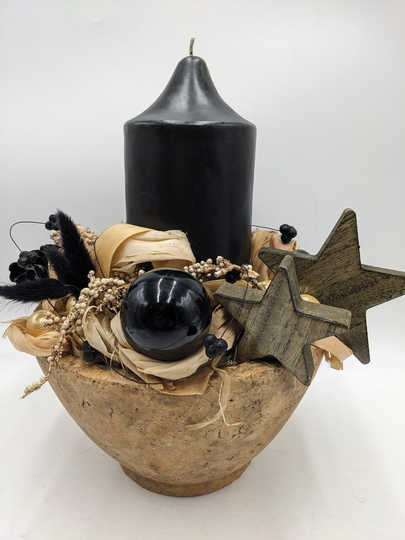 Tischgesteck im Topf mit Kerze, Kugeln, Sterne, Zapfen, Beeren und Gräser, Farbe: schwarz, creme, Höhe: ca. 34 cm, Durchmesser: ca. 25 cm, 3942-2025