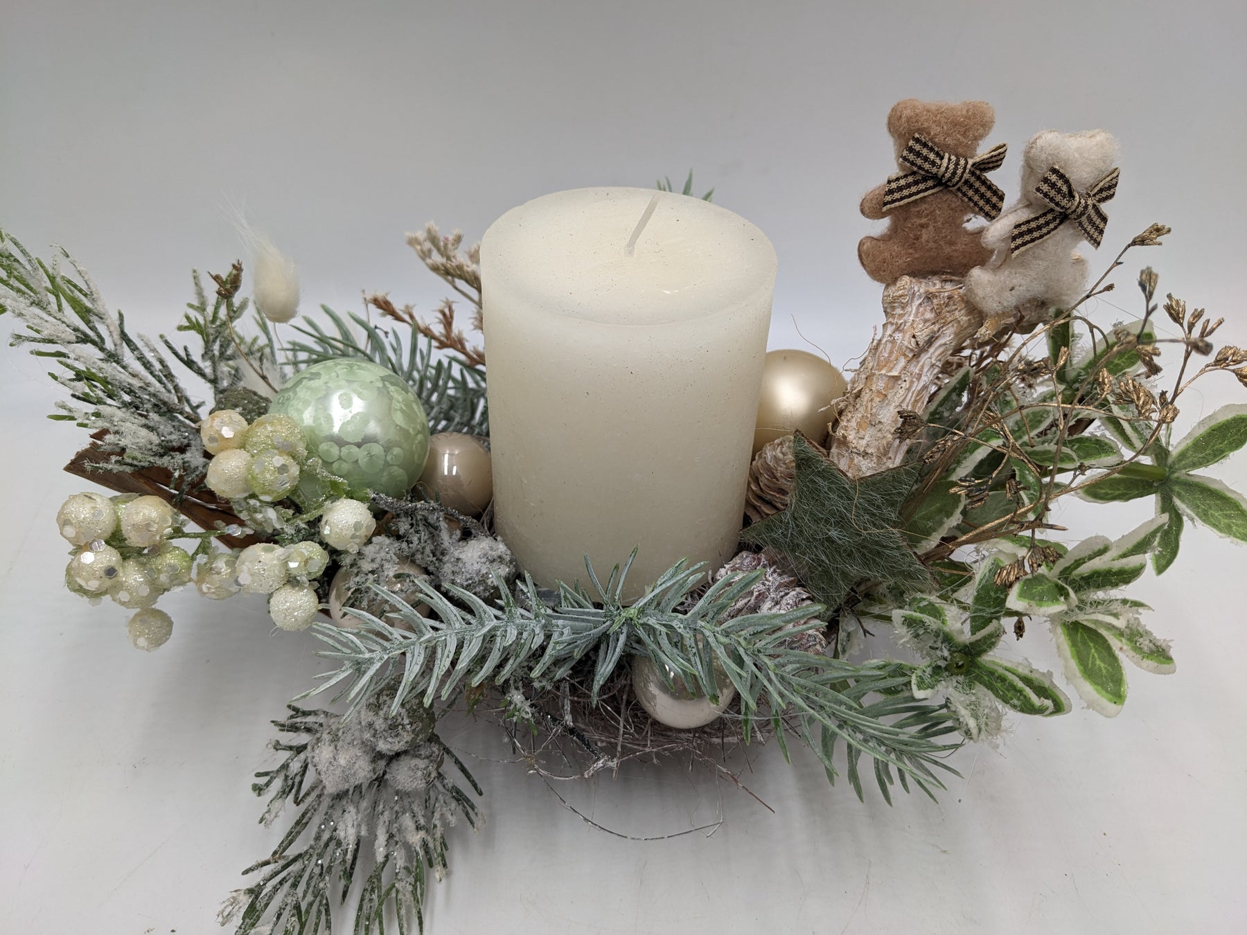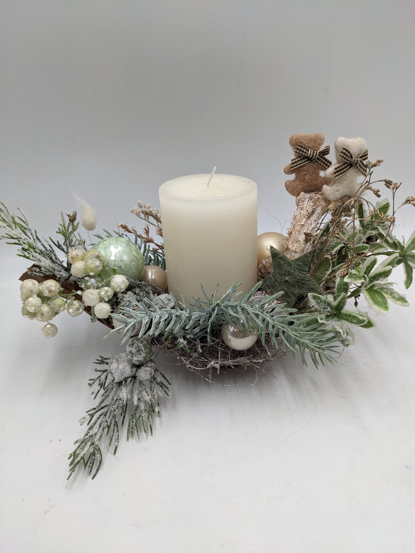 Tischgesteck im Schiffchen mit Kerze, Kugeln, Teddys, Sterne, Gräser und Tanne, Farbe: creme, mint, Höhe: ca. 16 cm, Breite: ca. 27 cm, 3847-2025