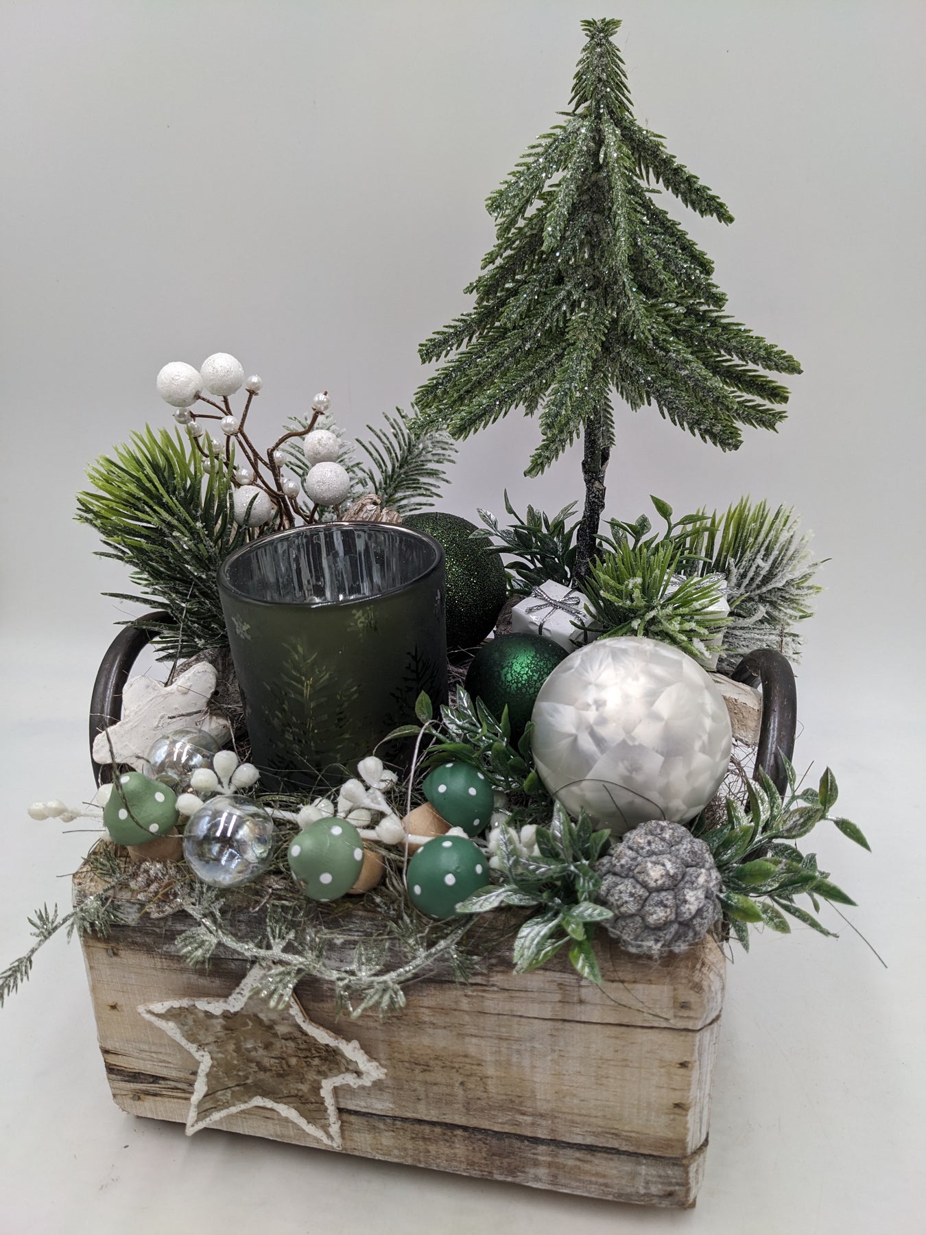Tischgesteck in Lade mit Teelicht, Kugeln, Sterne, Pilze, Tannenbäumchen, Beeren und Tanne, Farbe: grün, natur, weiß, Höhe: ca. 34 cm, Breite: ca. 19 cm, Tiefe: ca. 19 cm, 3785-2025
