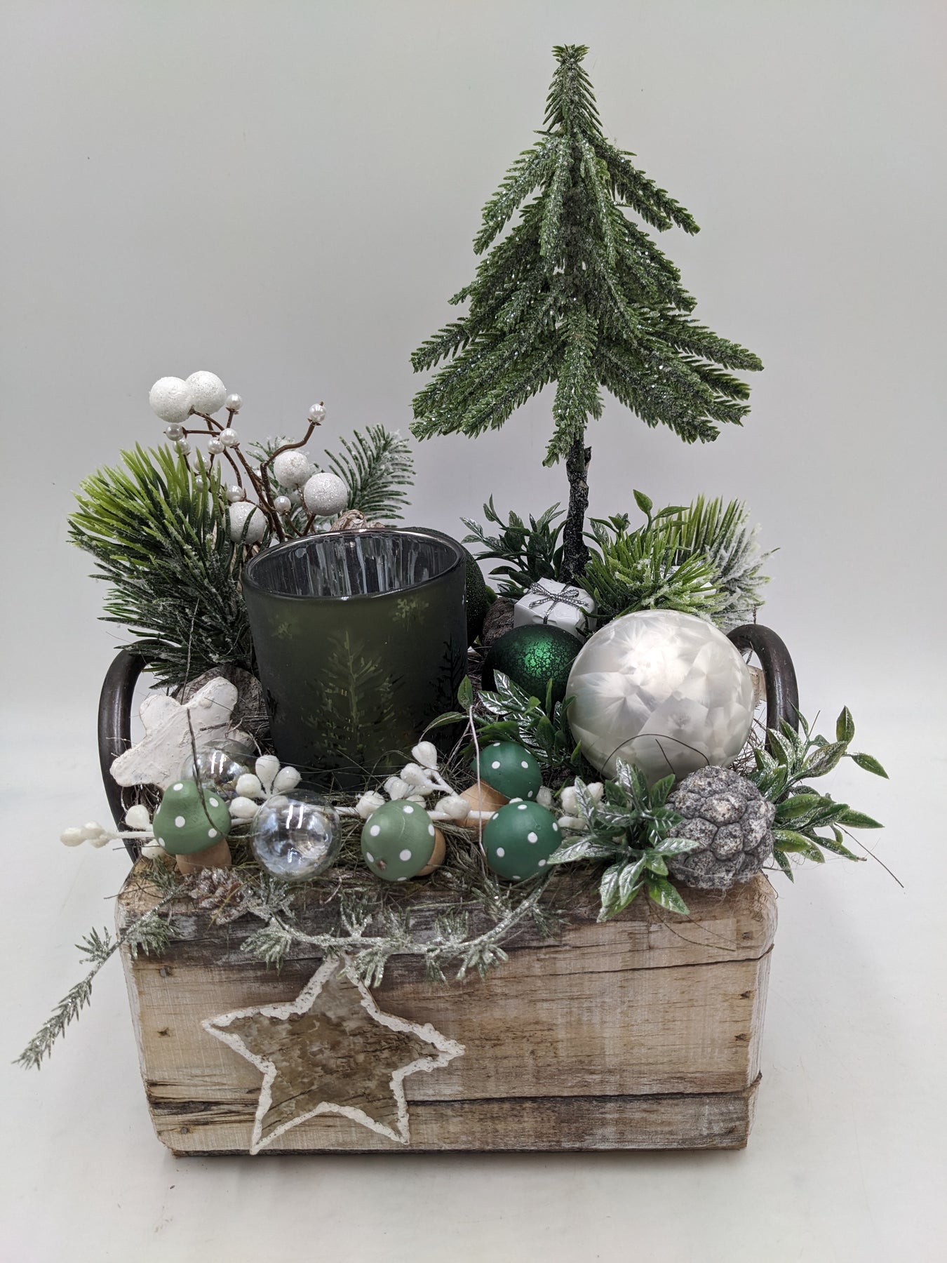 Weihnachtsgesteck Kugel Teelicht Stern grün