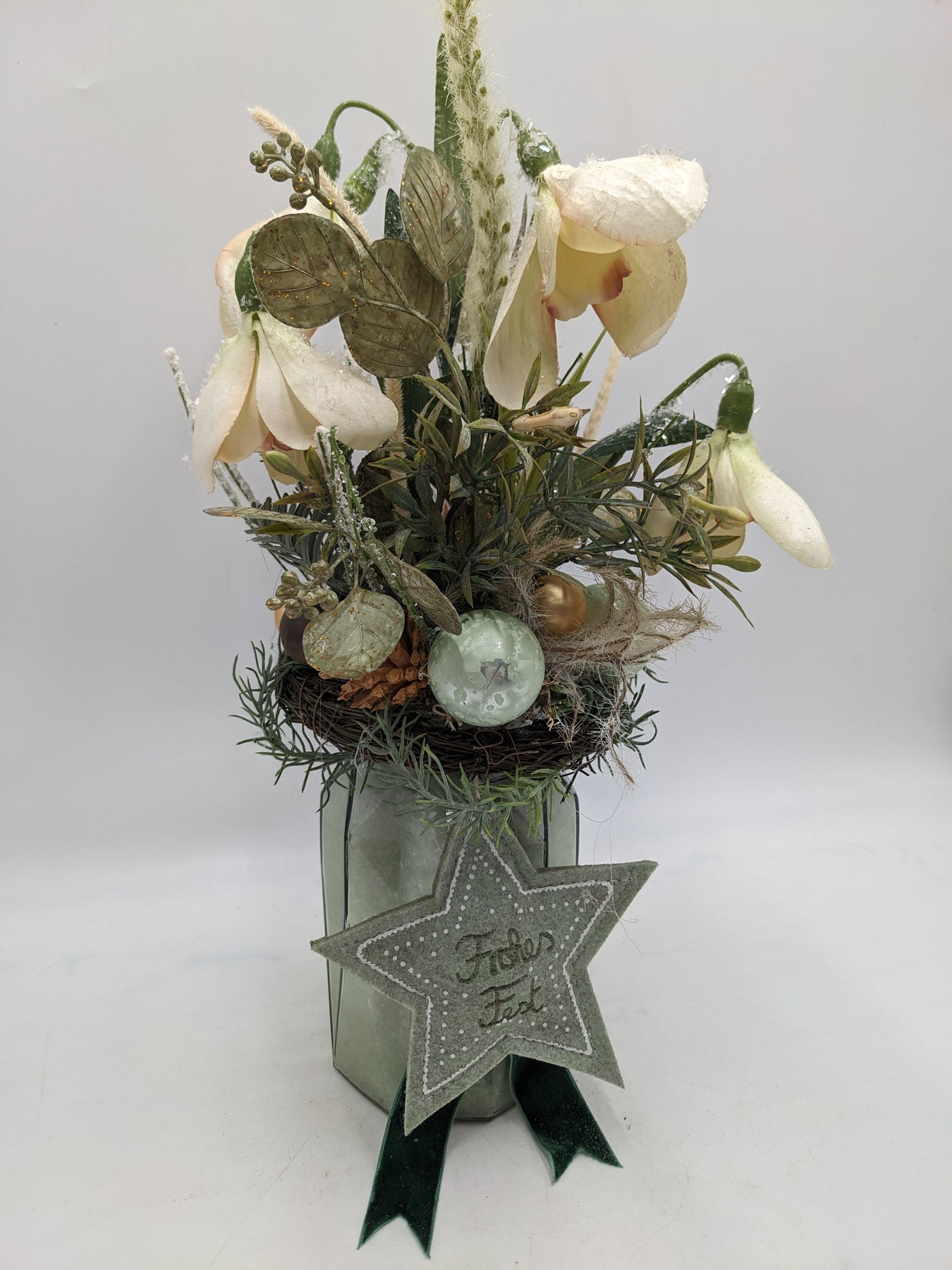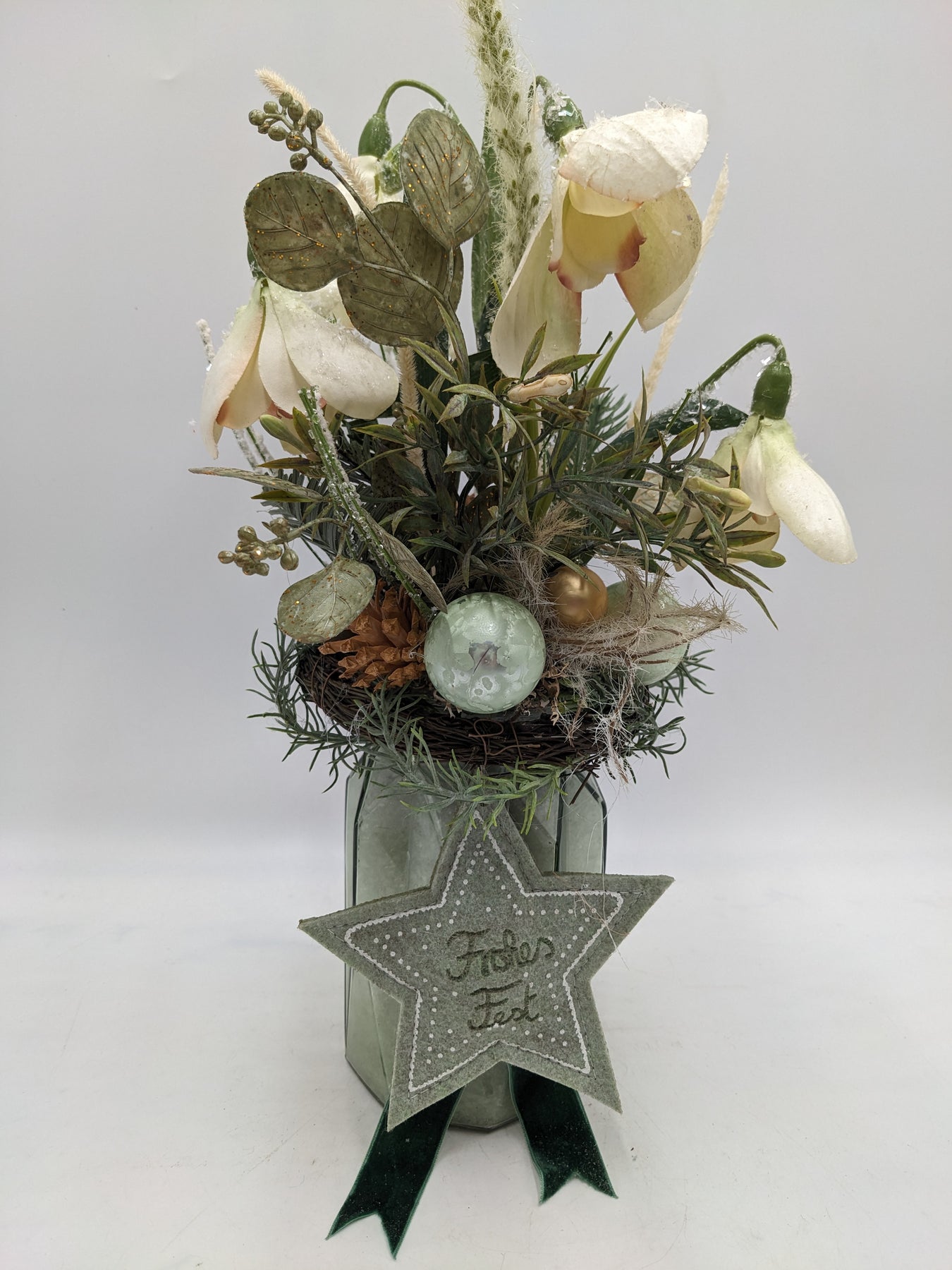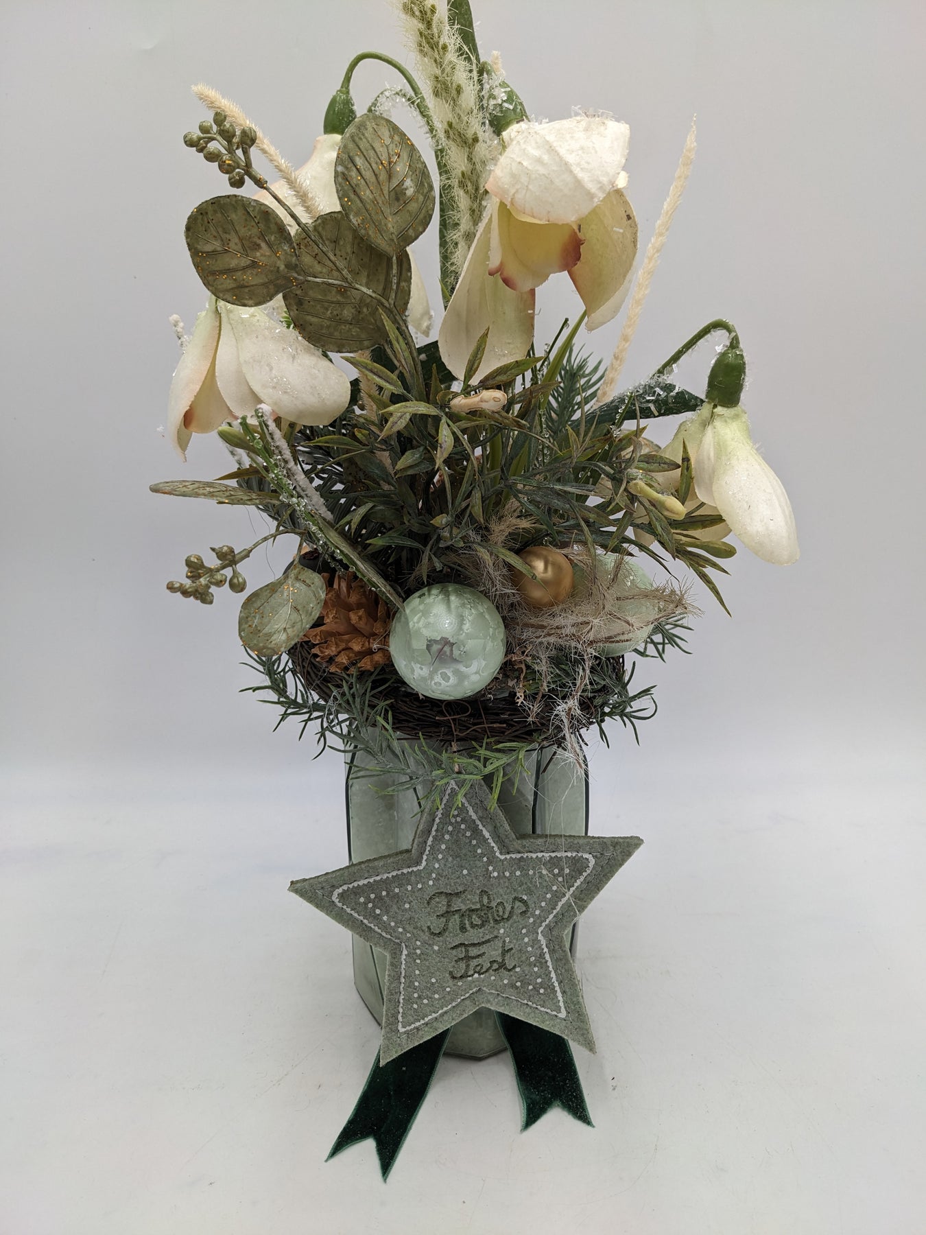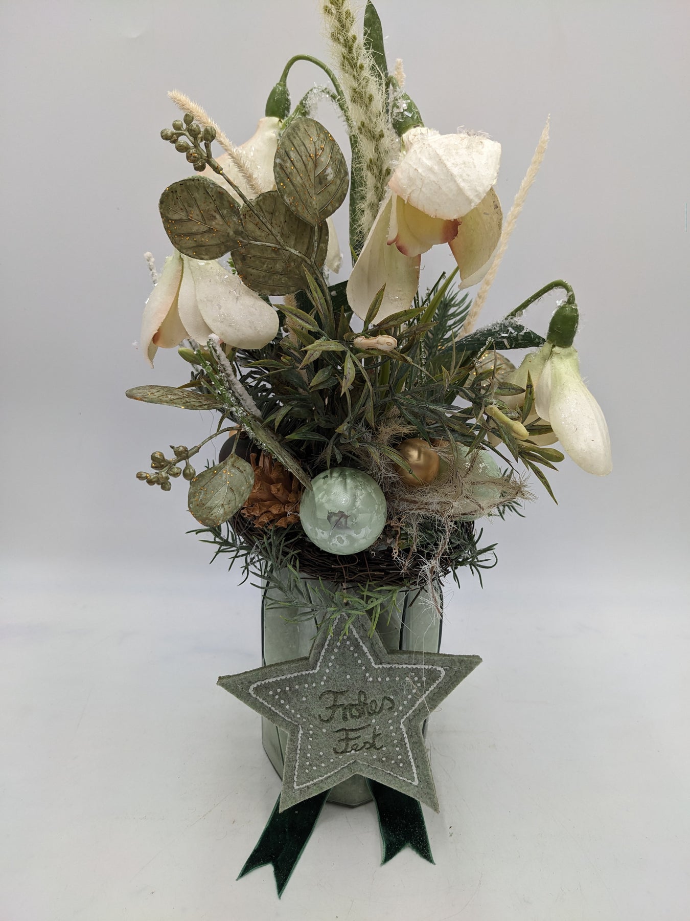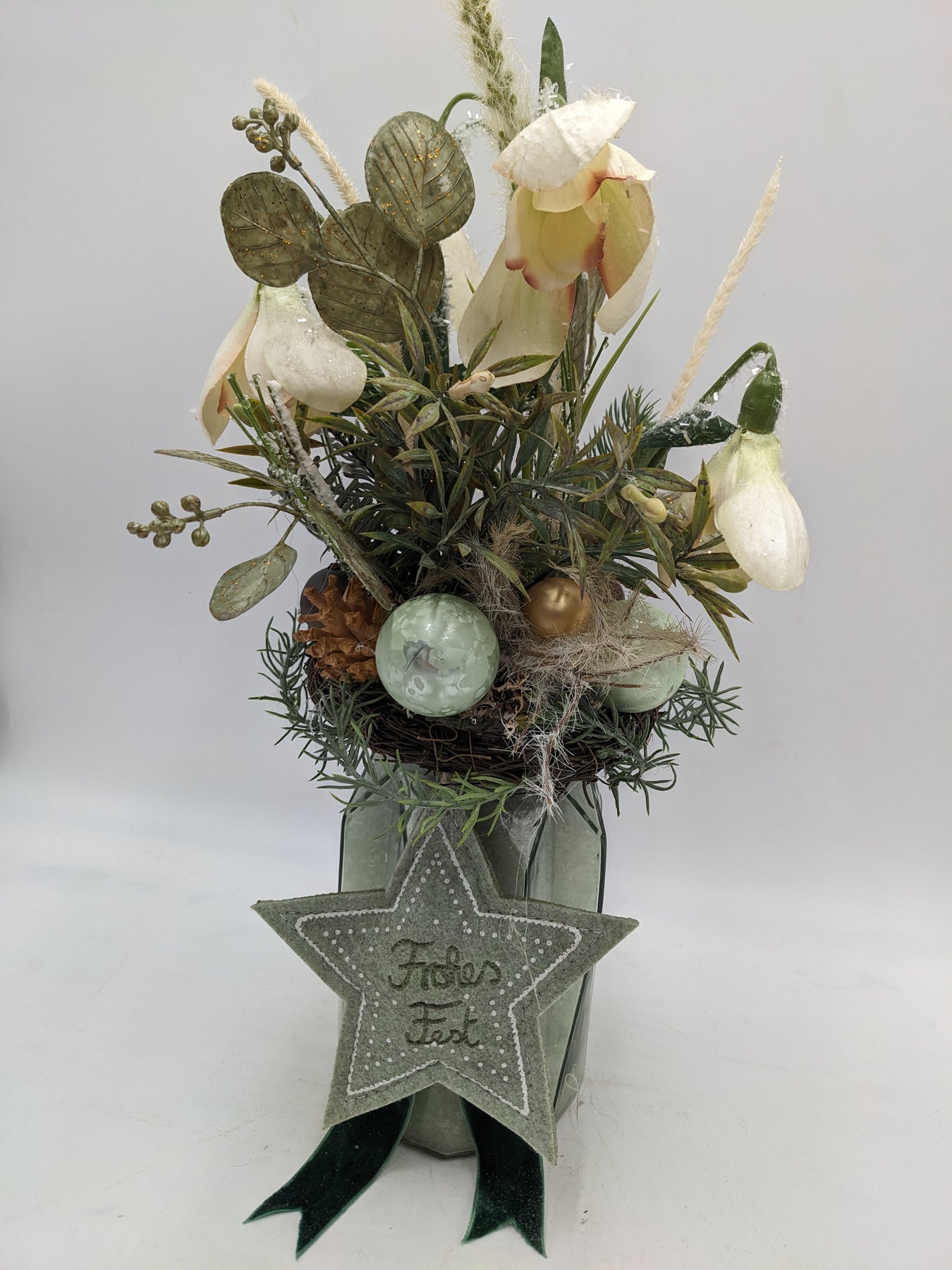 Weihnachtsgesteck Kugel Zapfen Alpenveilchen creme
