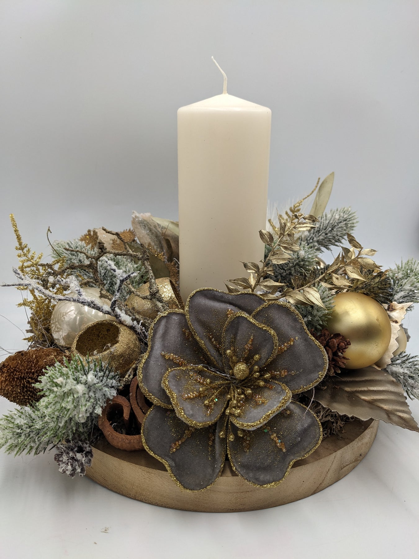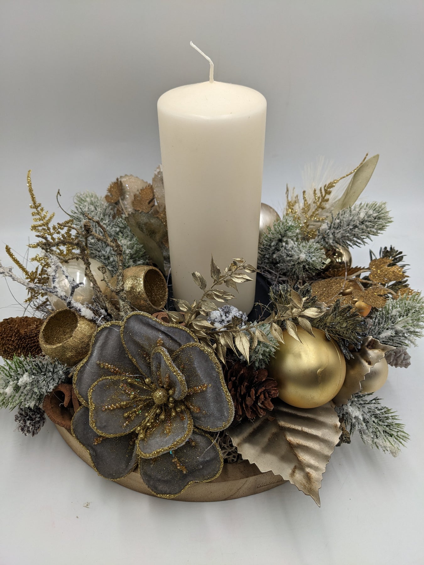 Tischgesteck mit Kerze, Kugeln, Zapfen, Gräser und Tanne, Farbe: creme, gold, Höhe: ca. 27 cm, Durchmesser: ca. 31 cm, 3821-2025