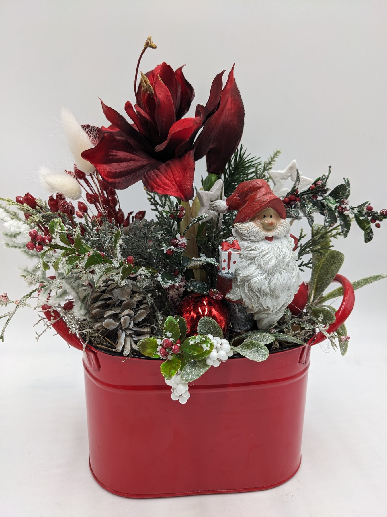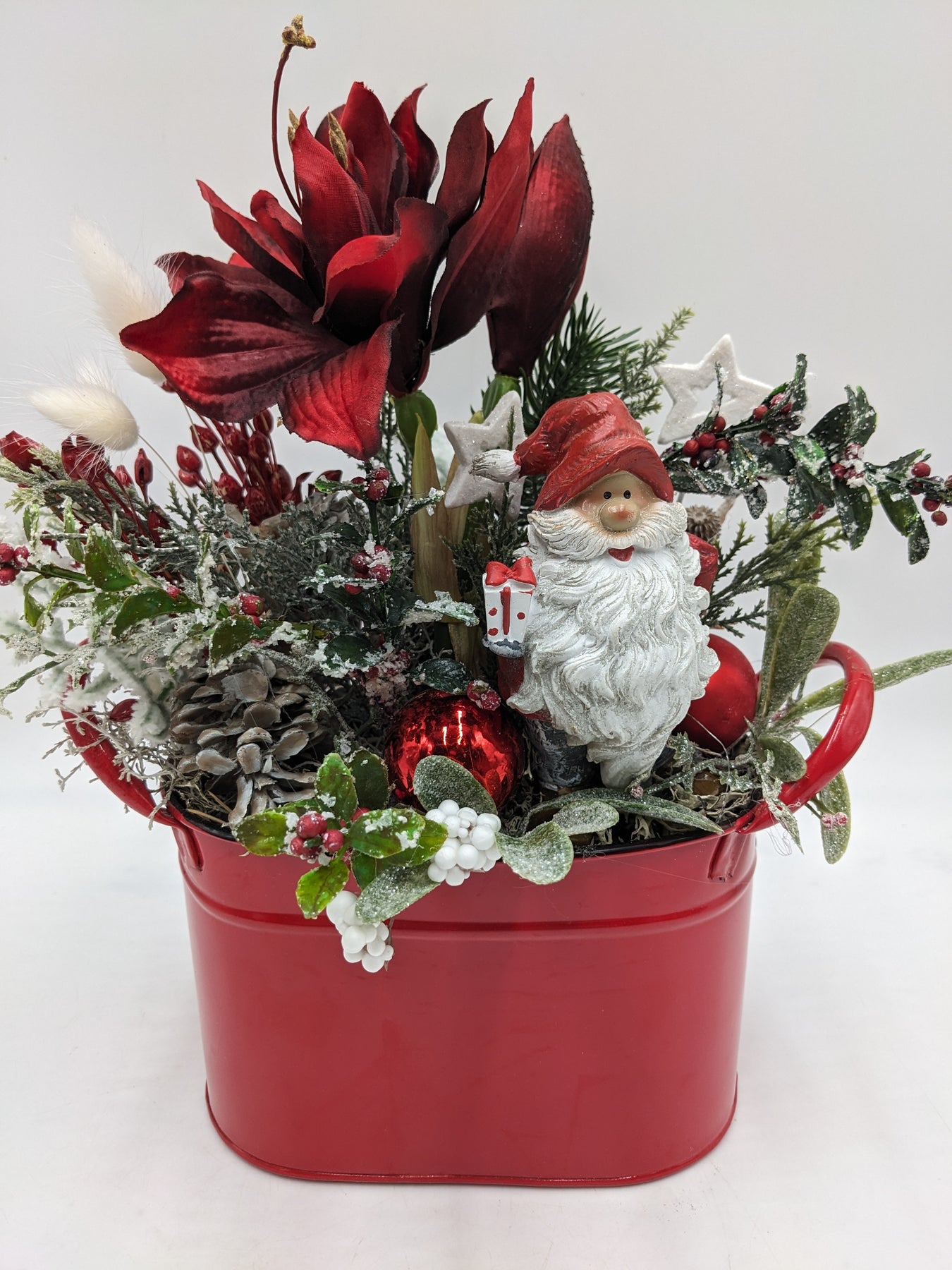 Tischgesteck in Metallschale, Kugeln, Zapfen, Sterne, Weihnachtsmann, Amaryllis, Beeren und Gräser, Farbe: rot, weiß, Höhe: ca. 32 cm, Breite: ca. 23 cm, 3602-2025