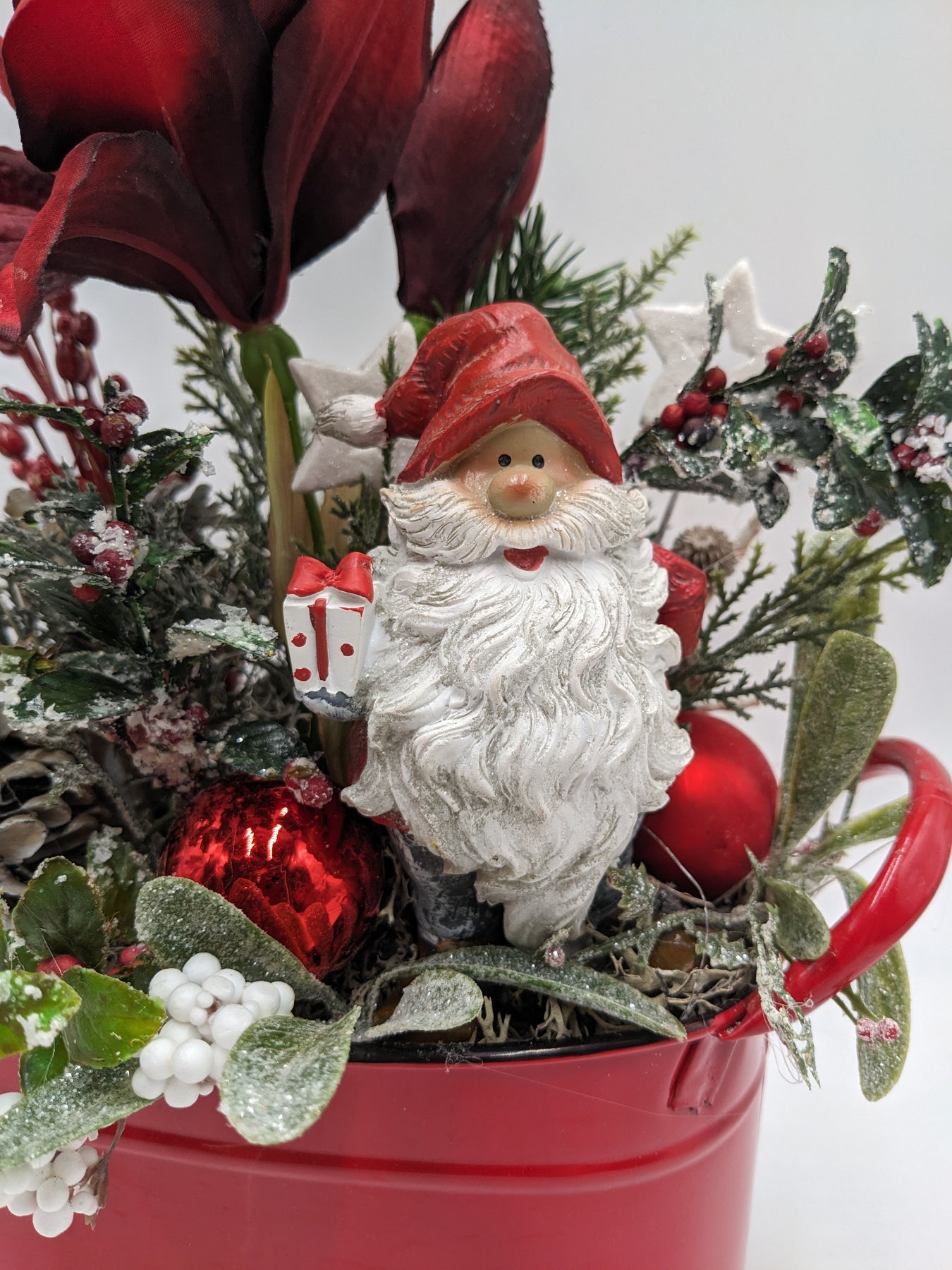 Weihnachtsgesteck Kugel Zapfen Weihnachtsmann rot