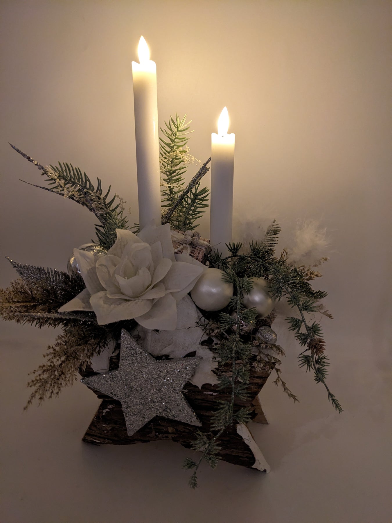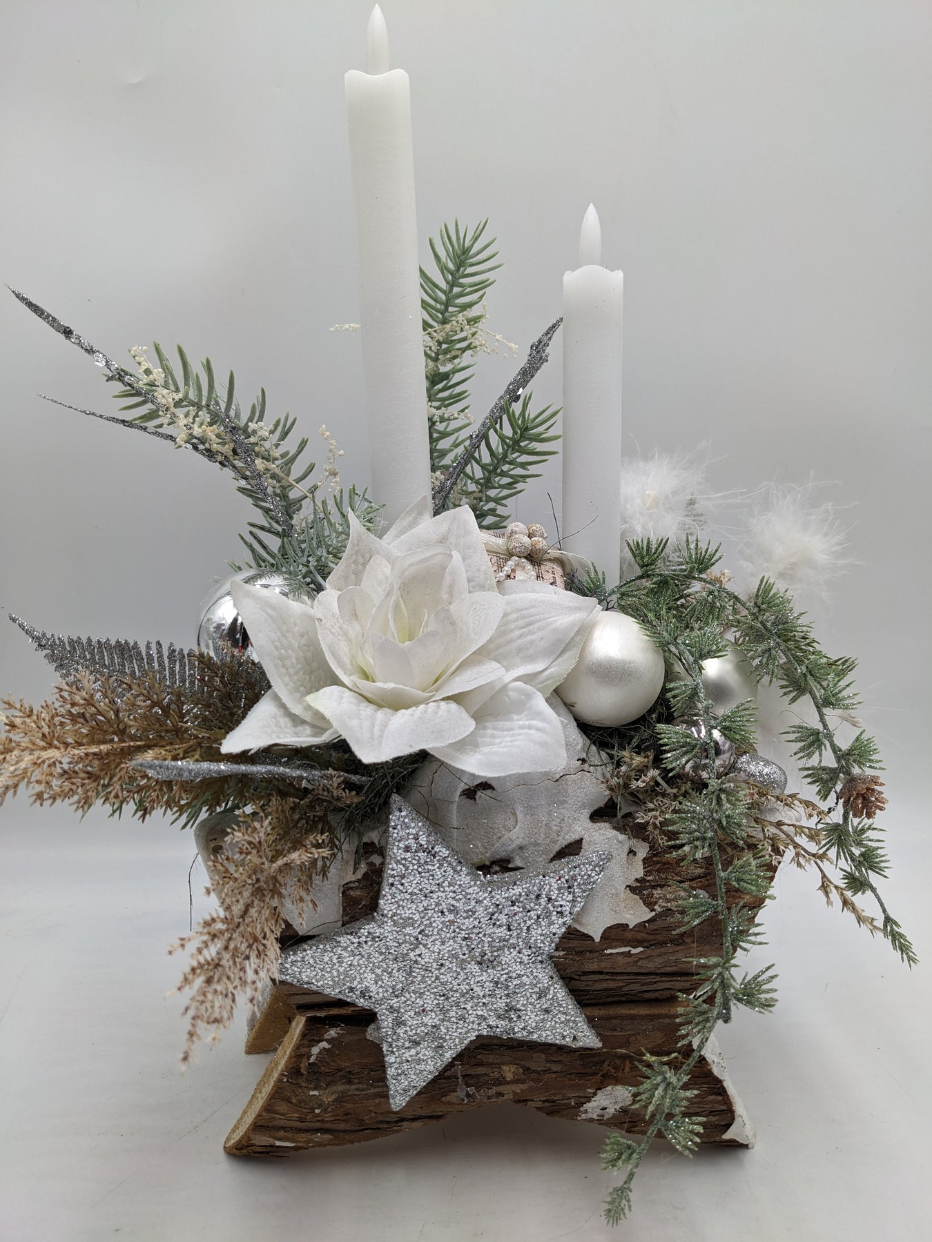 Tischgesteck im Stern mit LED Kerzen, Kugeln, Stern, Amaryllis, Gräser und Tanne, Farbe: weiß, silber, Höhe: ca. 42 cm, Breite: ca. 20 cm, 3884-2025