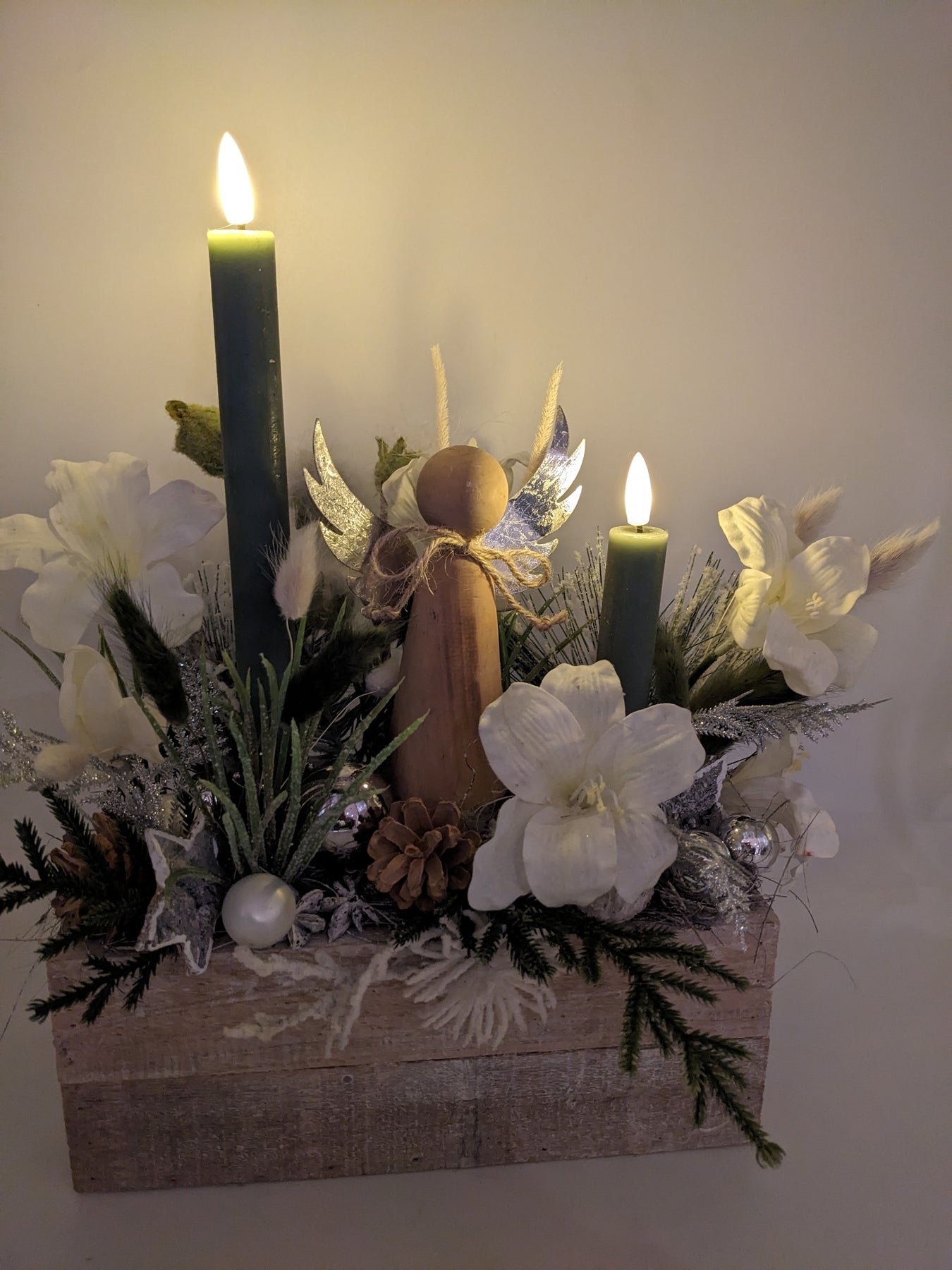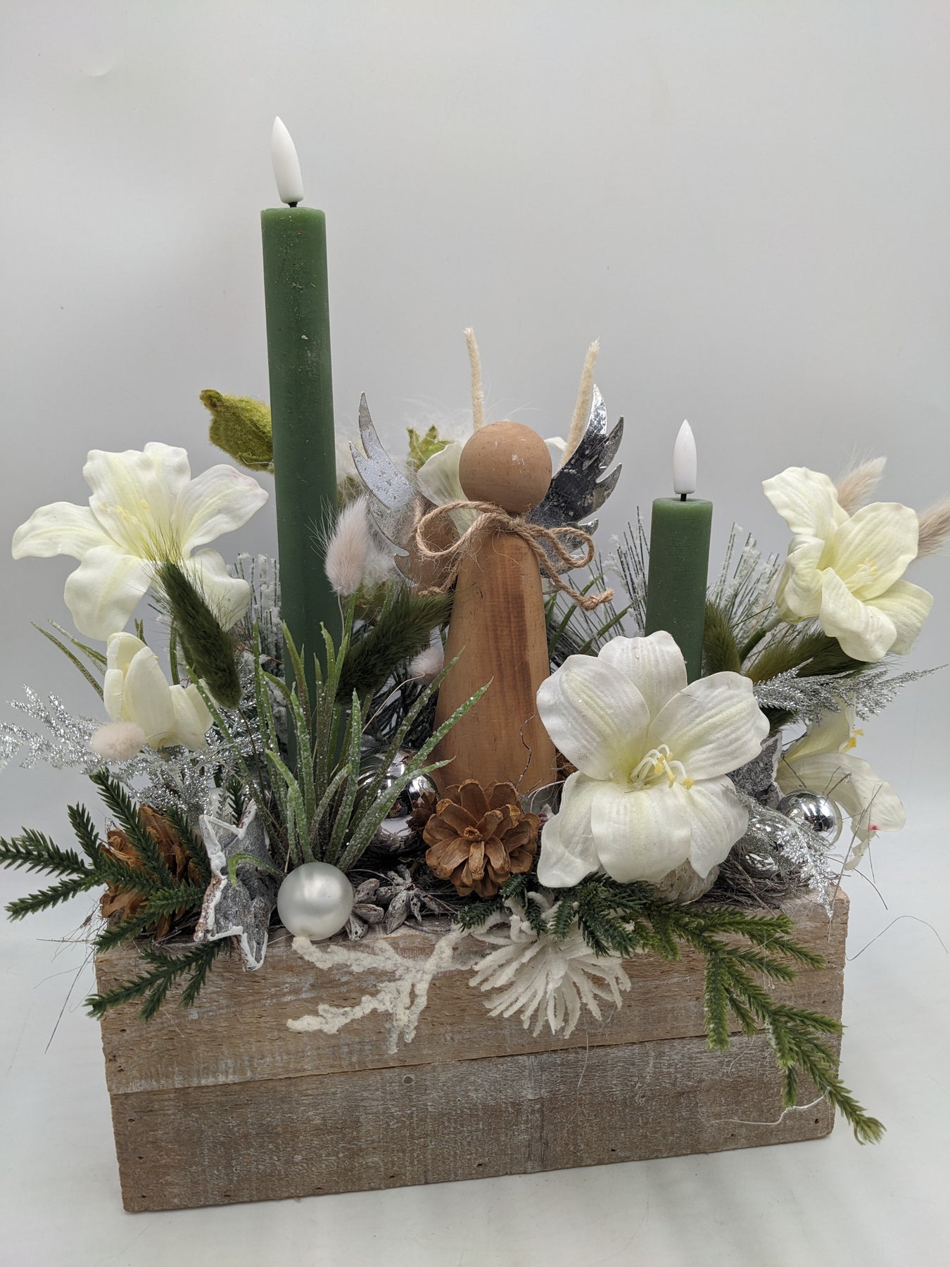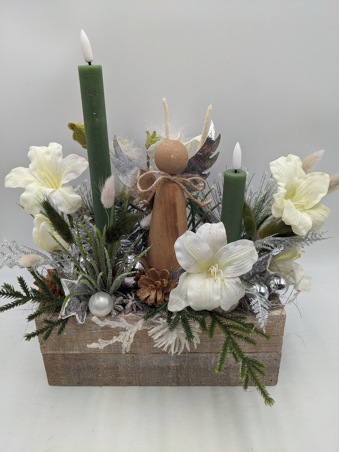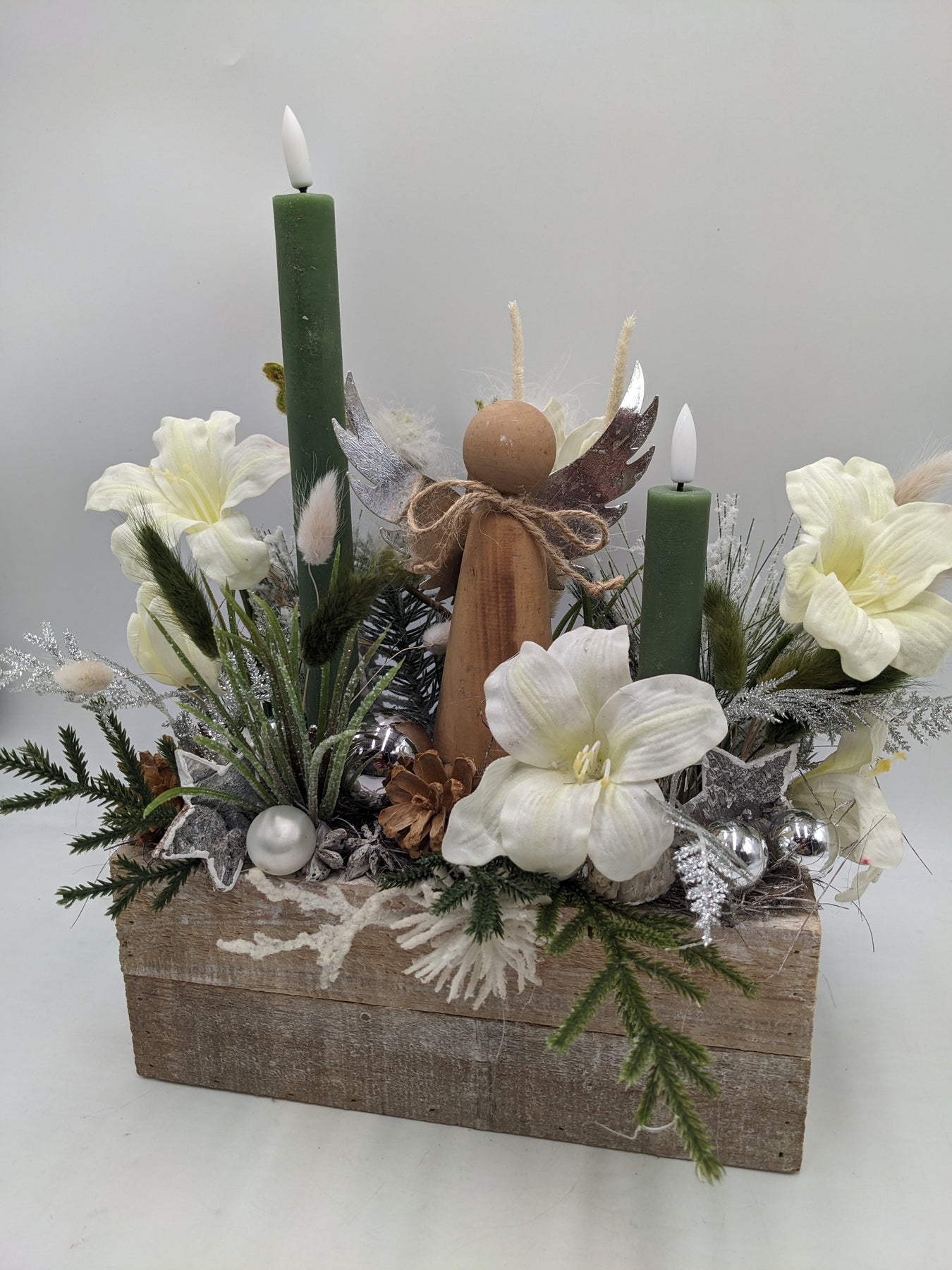 Tischgesteck in Lade mit LED Kerzen, Kugeln, Sterne, Engel, Blüten, Zapfen, Gräser und Tanne, Farbe: weiß, salbei, Höhe: ca. 36 cm, Breite: ca. 26 cm, Tiefe: ca. 11 cm, 3864-2025