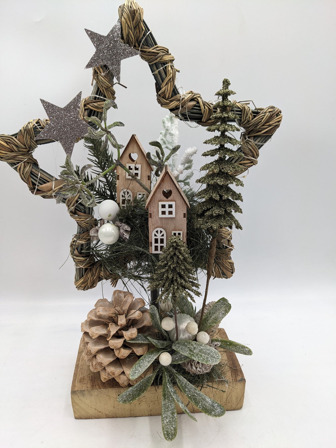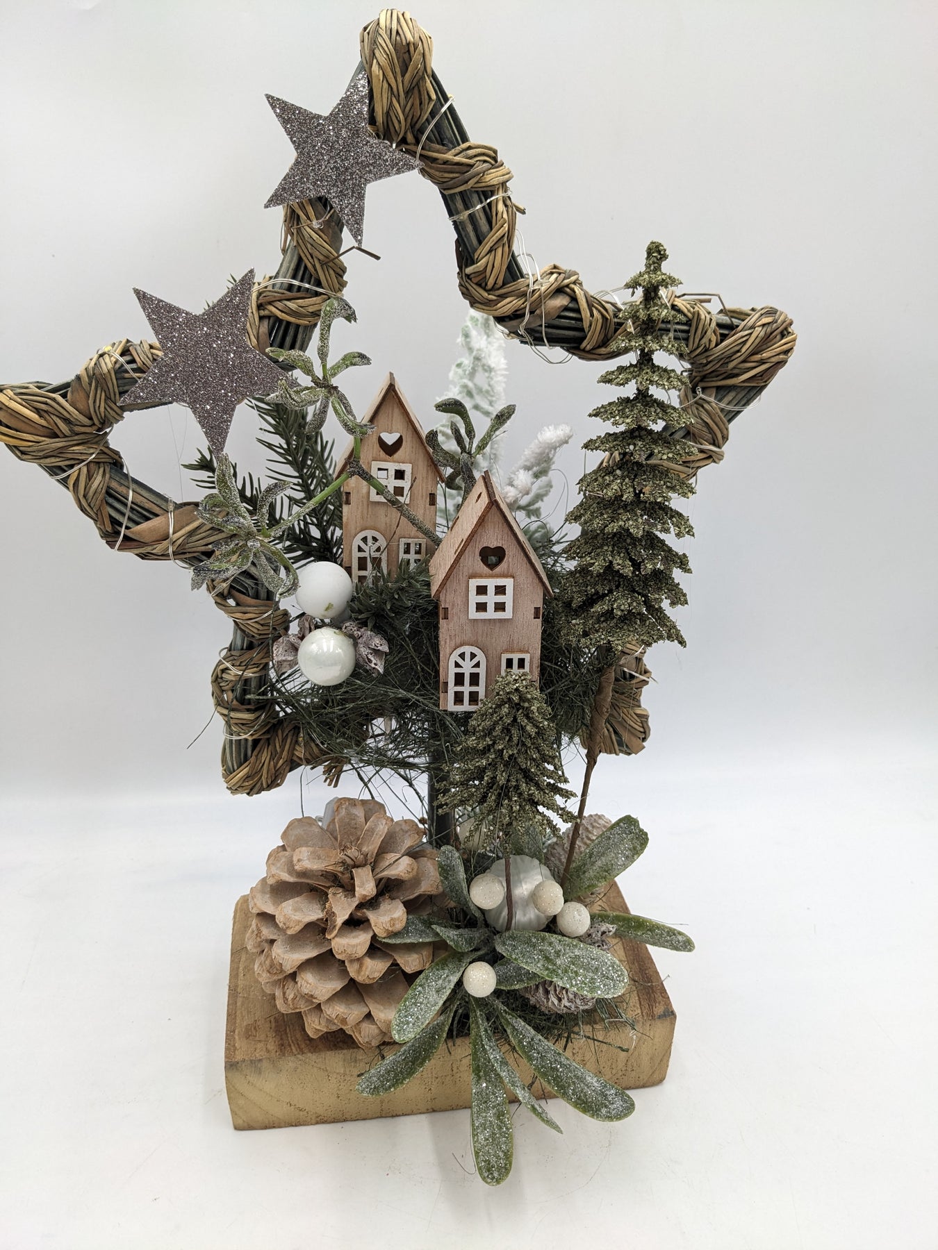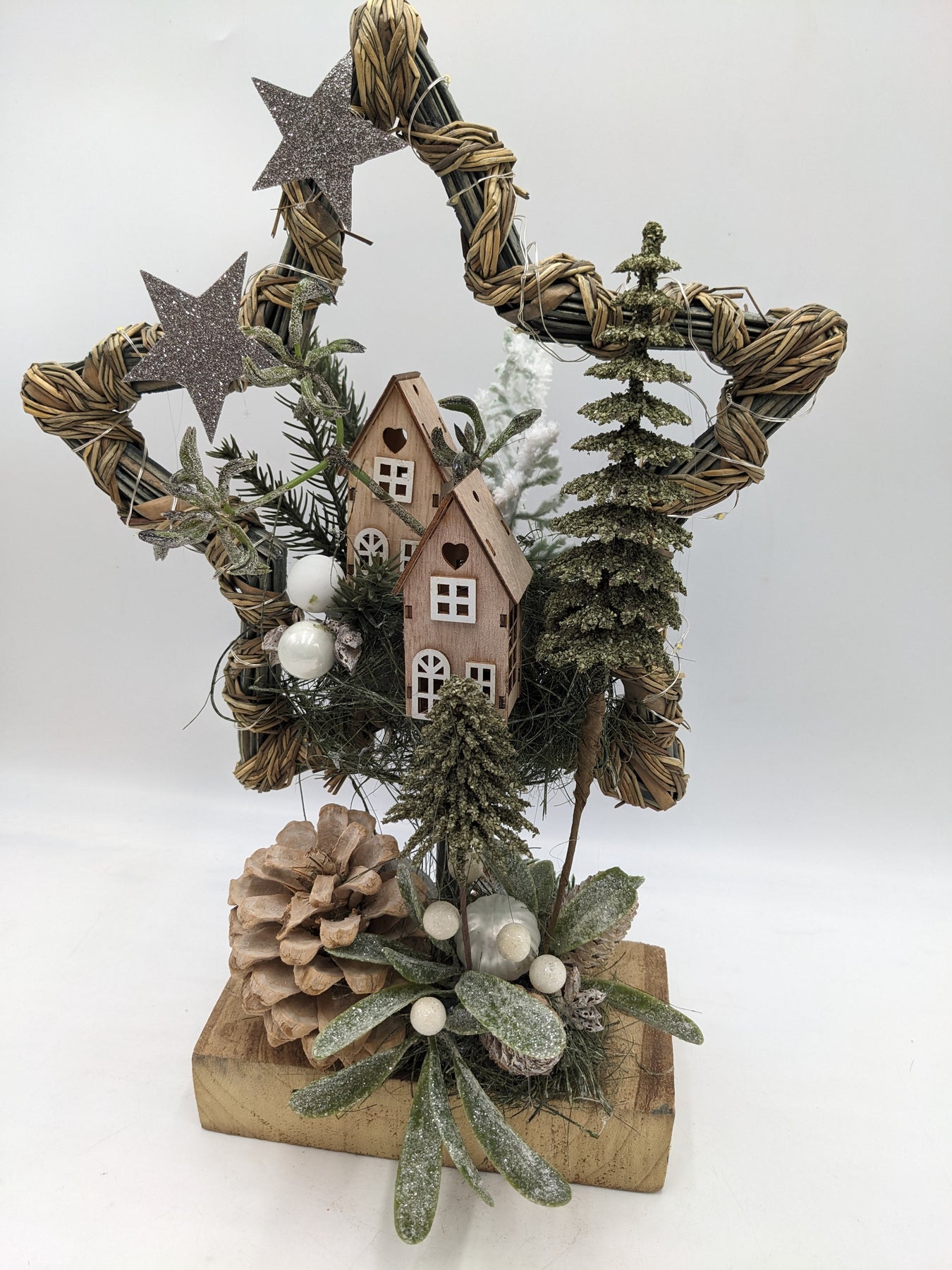 Dekorationsstern, Kugeln, Sterne, Häuser, Zapfen, Misteln und Tanne, Farbe: natur, silber, Höhe: ca. 39 cm, Breite: ca. 25 cm, 3893-2025