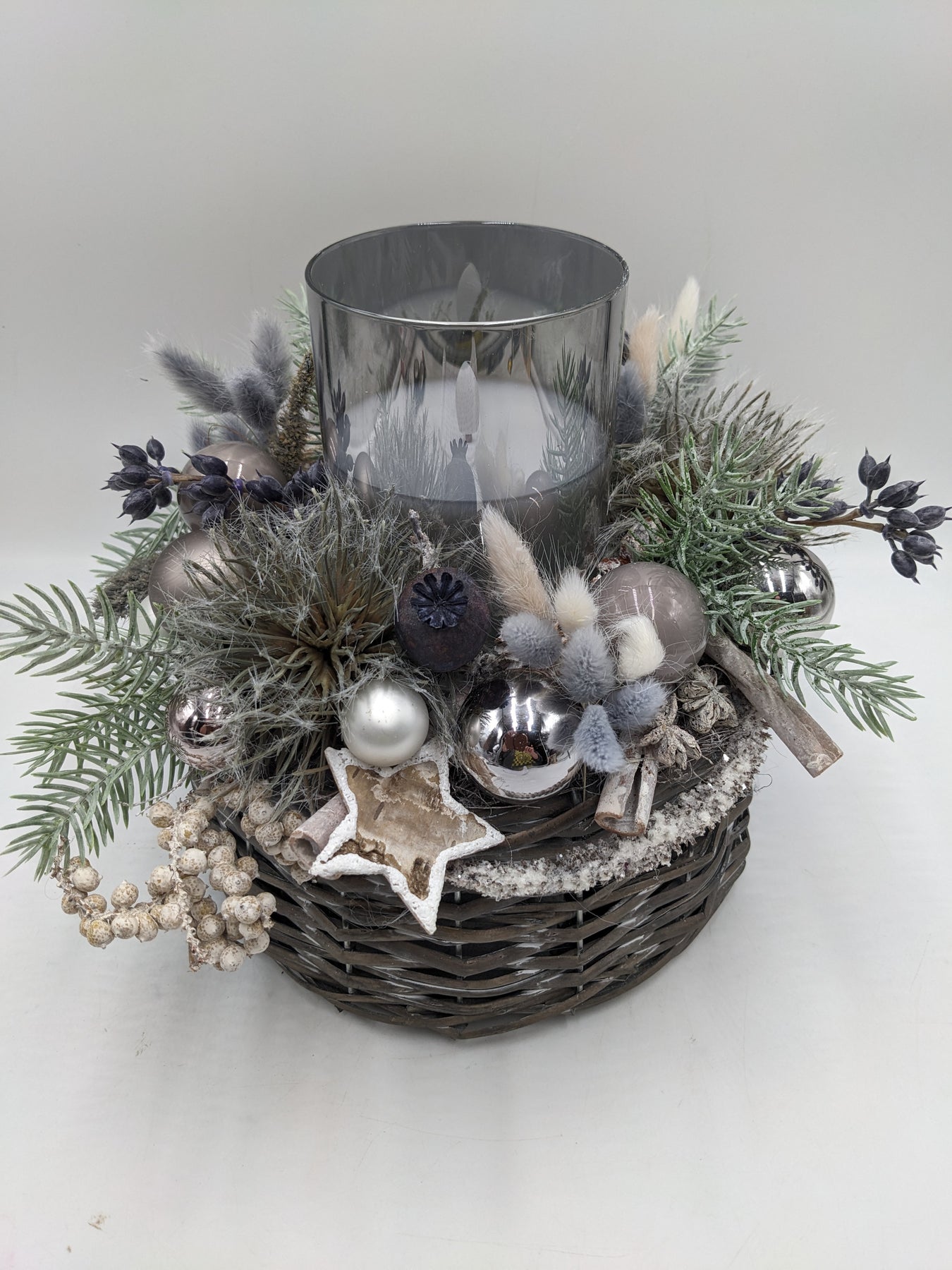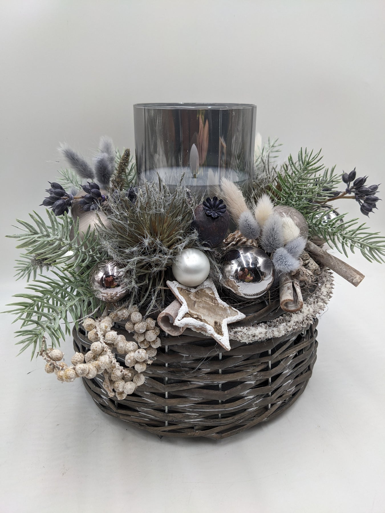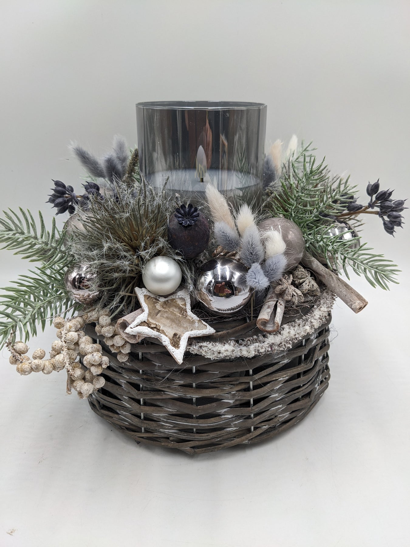 Tischgesteck im Korb, Teelicht, Kugeln, Sterne, Zimt, Beeren, Gräser und Tanne, Farbe: grau, anthrazit, Höhe: ca. 26 cm, Durchmesser: ca. 22 cm, 3878-2025