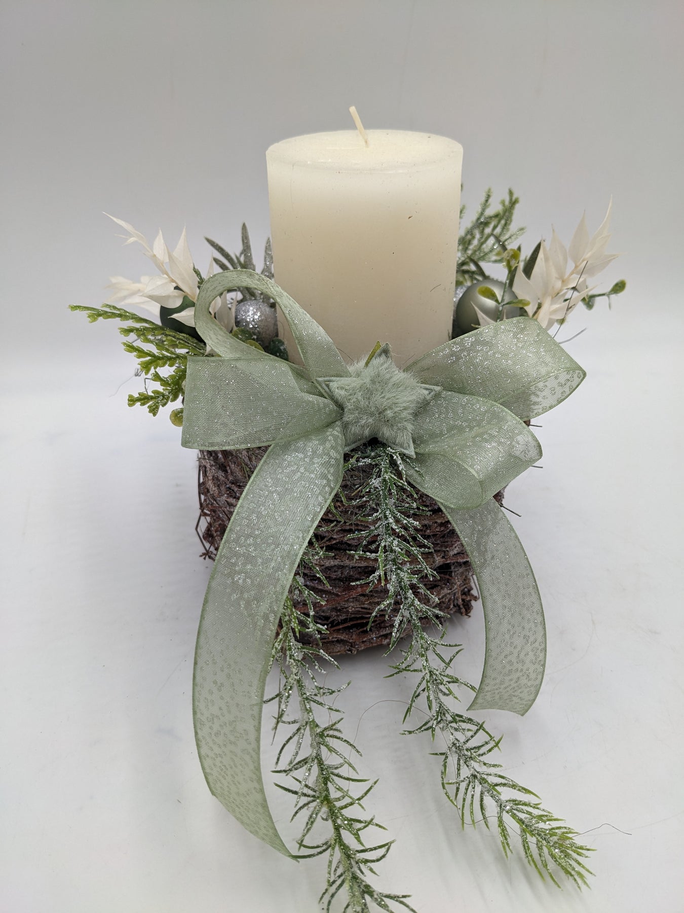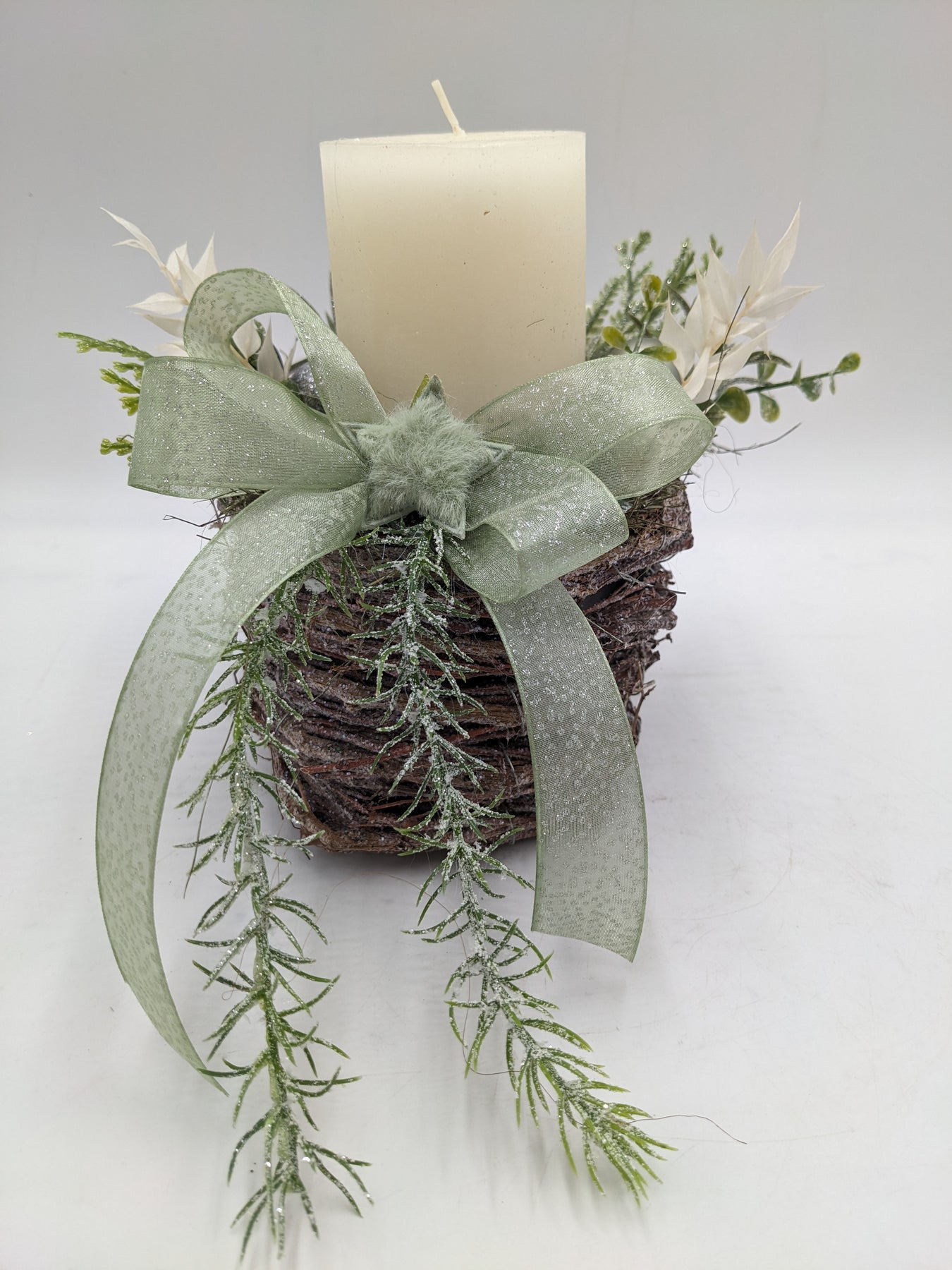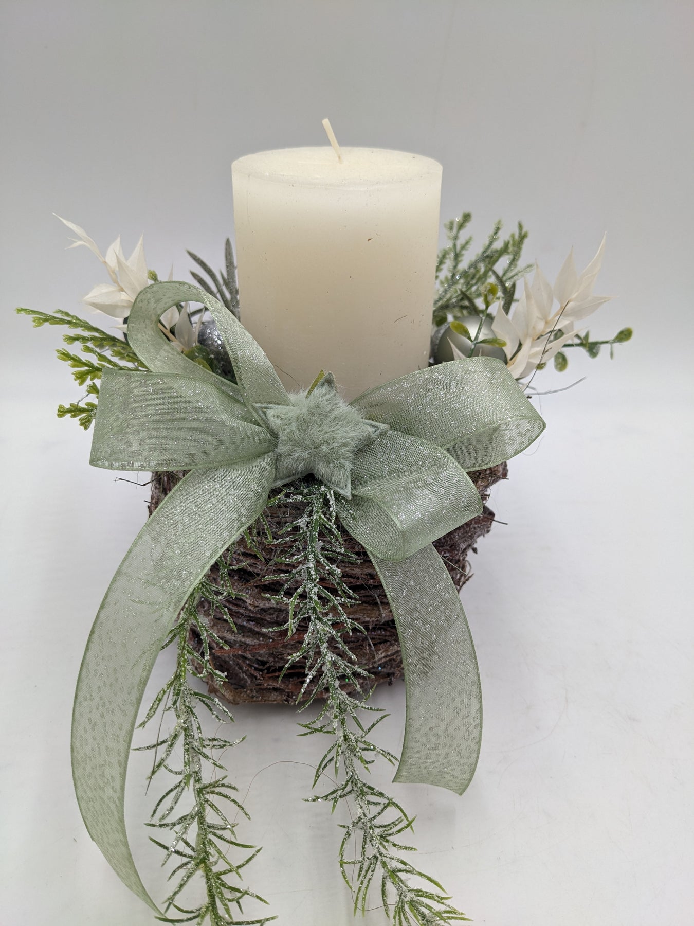 Tischgesteck im Korb mit Kerze, Stern, Schleife, Gräser und Tanne, Farbe: mint, creme, Höhe: ca. 19 cm, Durchmesser: ca. 15 cm, 3776-2025