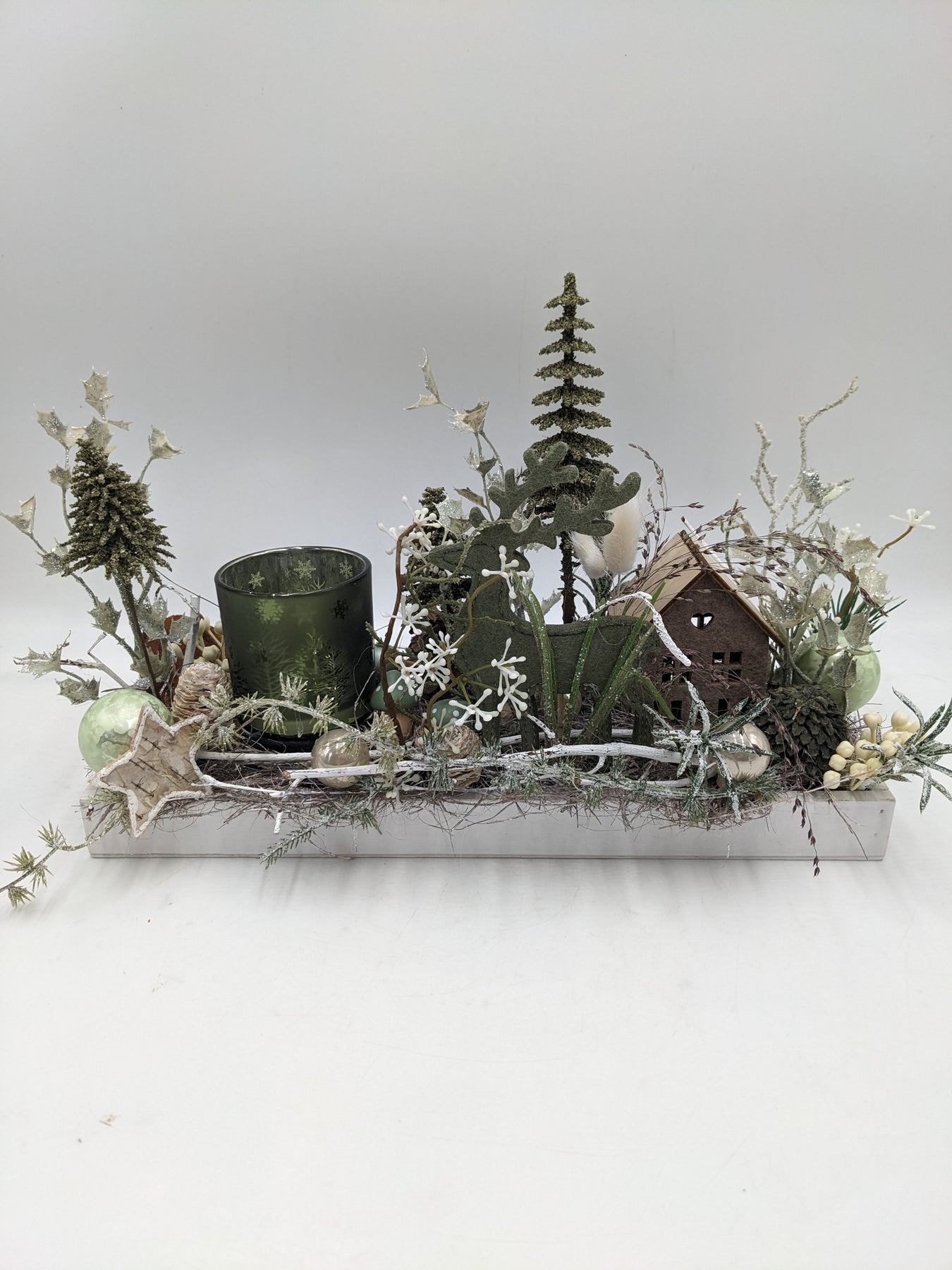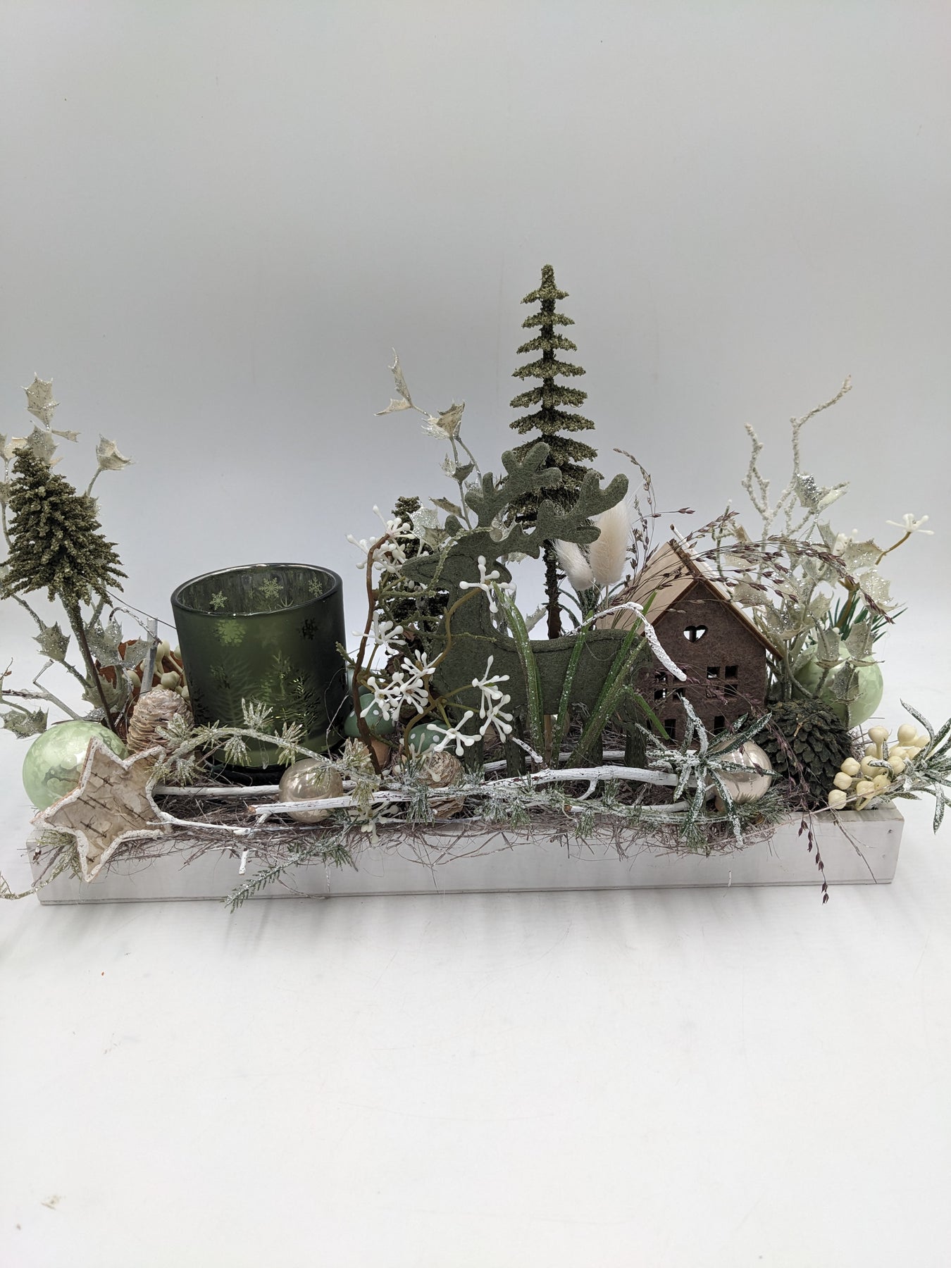 Weihnachtsgesteck Teelicht Kugel Haus grün