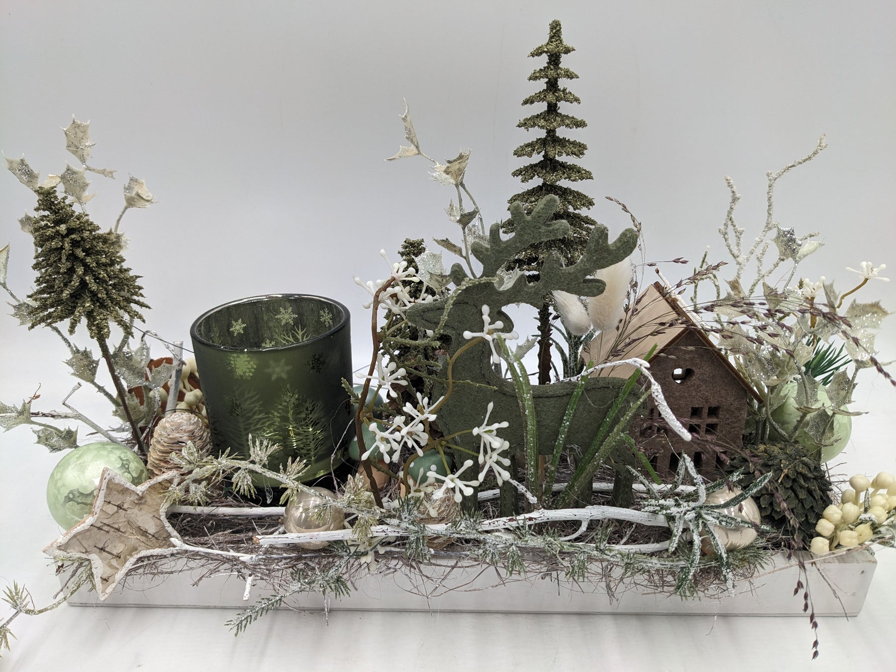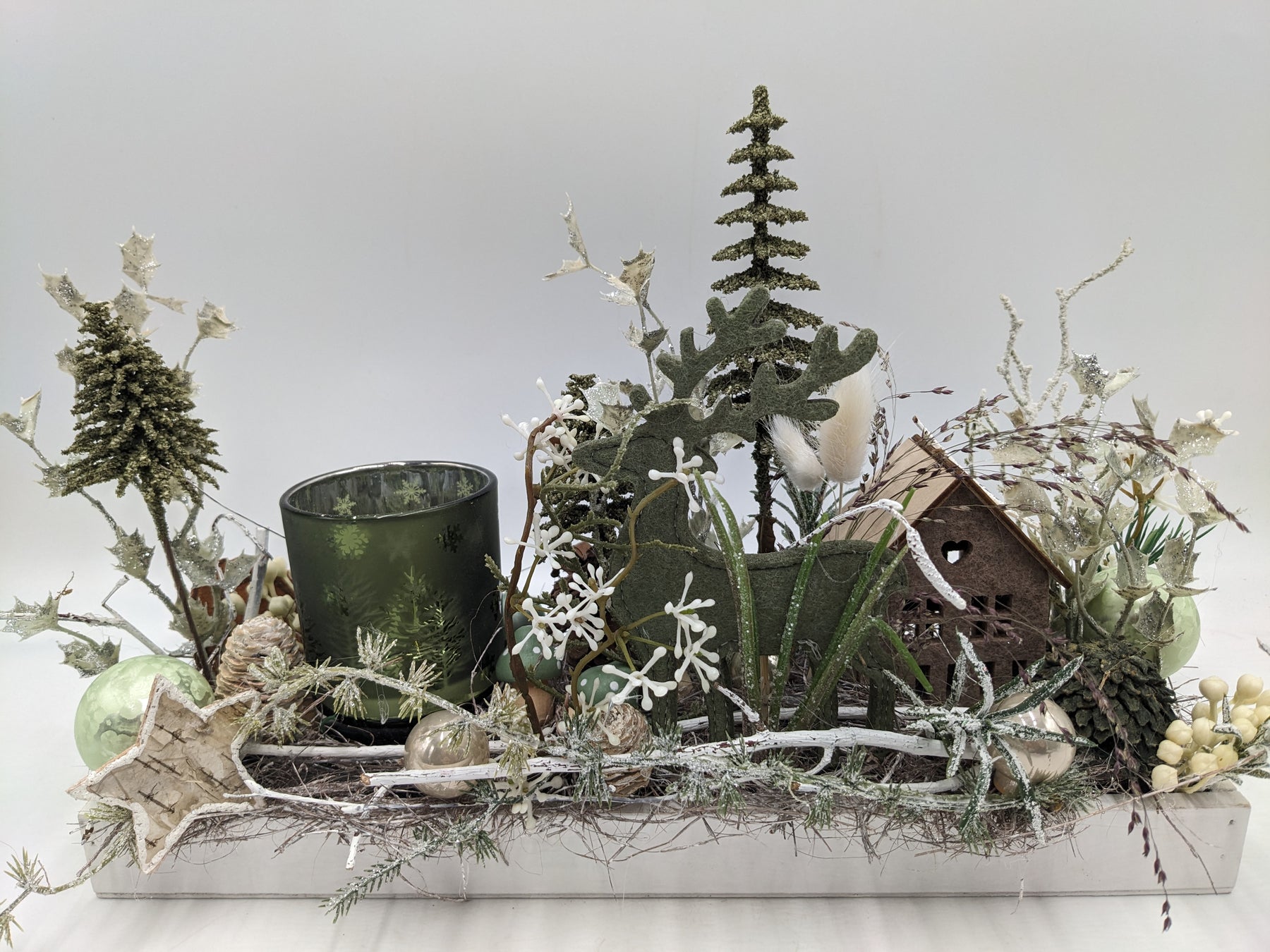 Tischgesteck im Tablett mit Teelicht, Kugeln, Sterne, Zapfen, Haus, Pilze, Hirsch, Tannenbäumchen, Geäst und Gräser, Farbe: grün, creme, Höhe: ca. 24 cm, Breite: ca. 35 cm, Tiefe: ca. 10 cm, 3804-2025