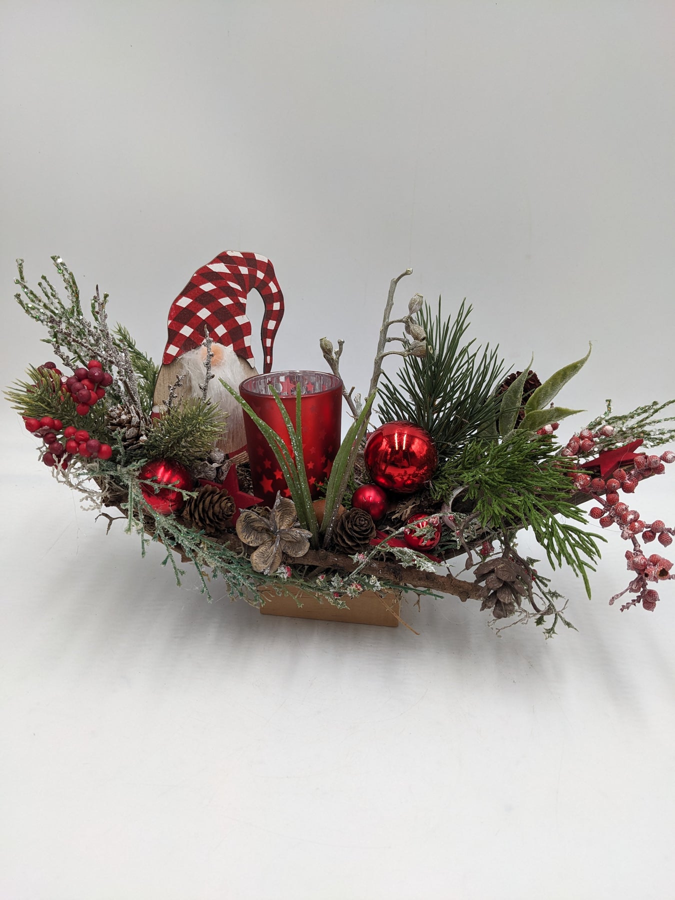 Tischgesteck im Schiffchen mit Teelicht, Kugeln, Sterne, Zapfen, Wichtel, Beeren, Gräser und Tanne, Farbe: rot, grün, Höhe: ca. 19 cm, Breite: ca. 32 cm, 3606-2025
