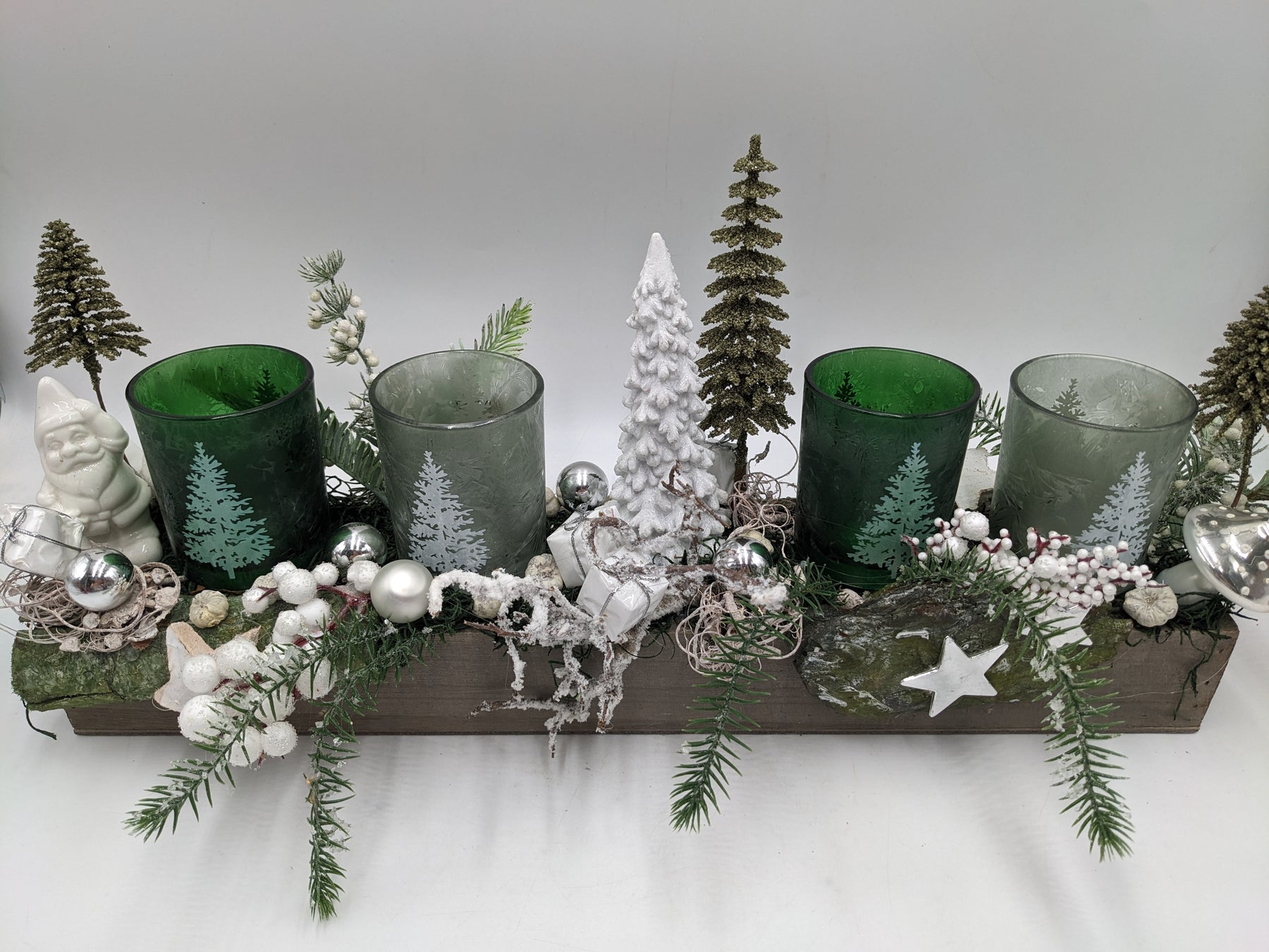 Tischgesteck im Tablett mit Teelichter, Kugeln, Pilze, Sterne, Geschenke, Weihnachtsmann, Tannenbäumchen, Beeren und Tanne, Farbe: grün, weiß, Höhe: ca. 24 cm, Breite: ca. 50 cm, Tiefe: ca. 10 cm, 3715-2025