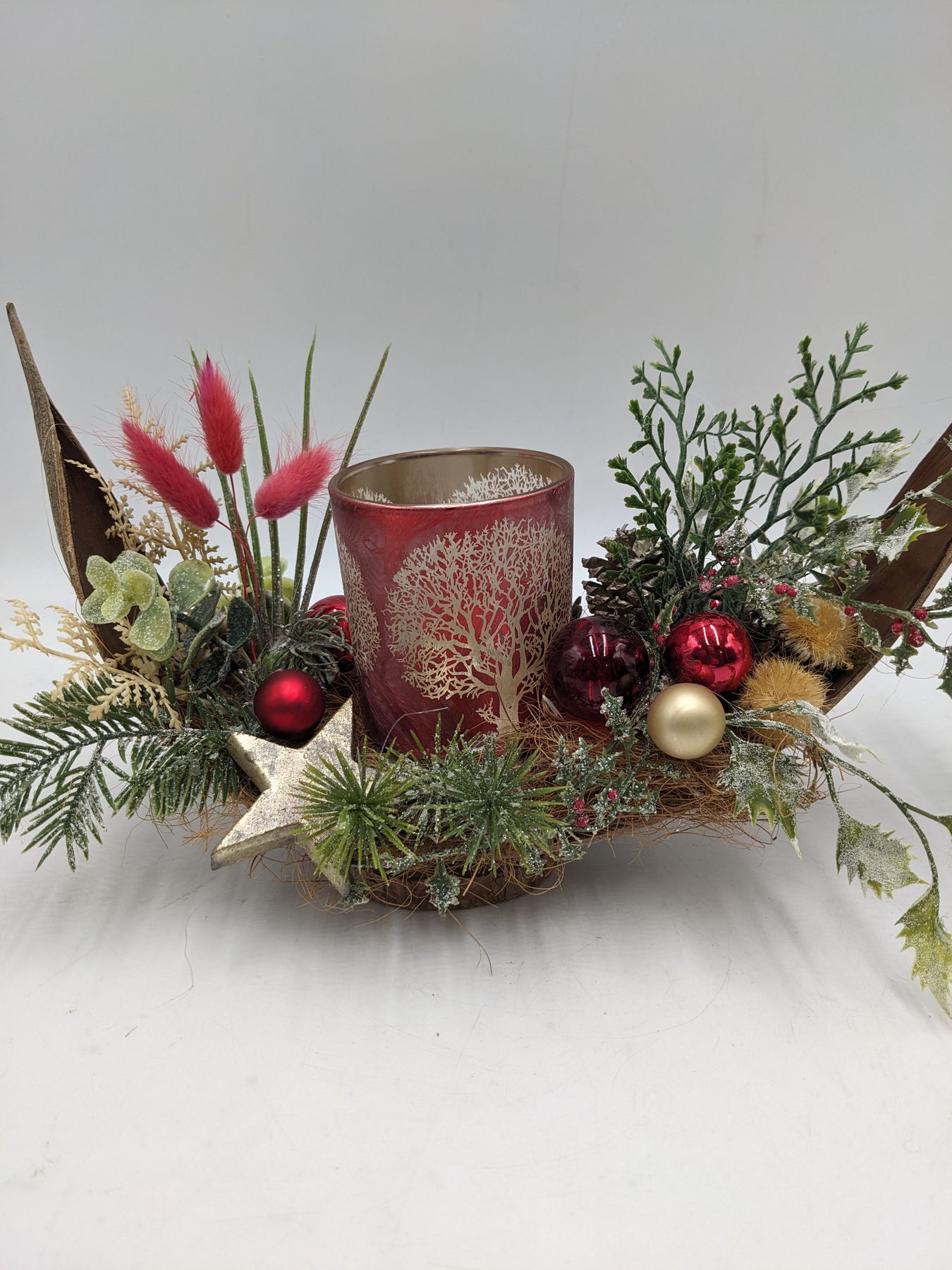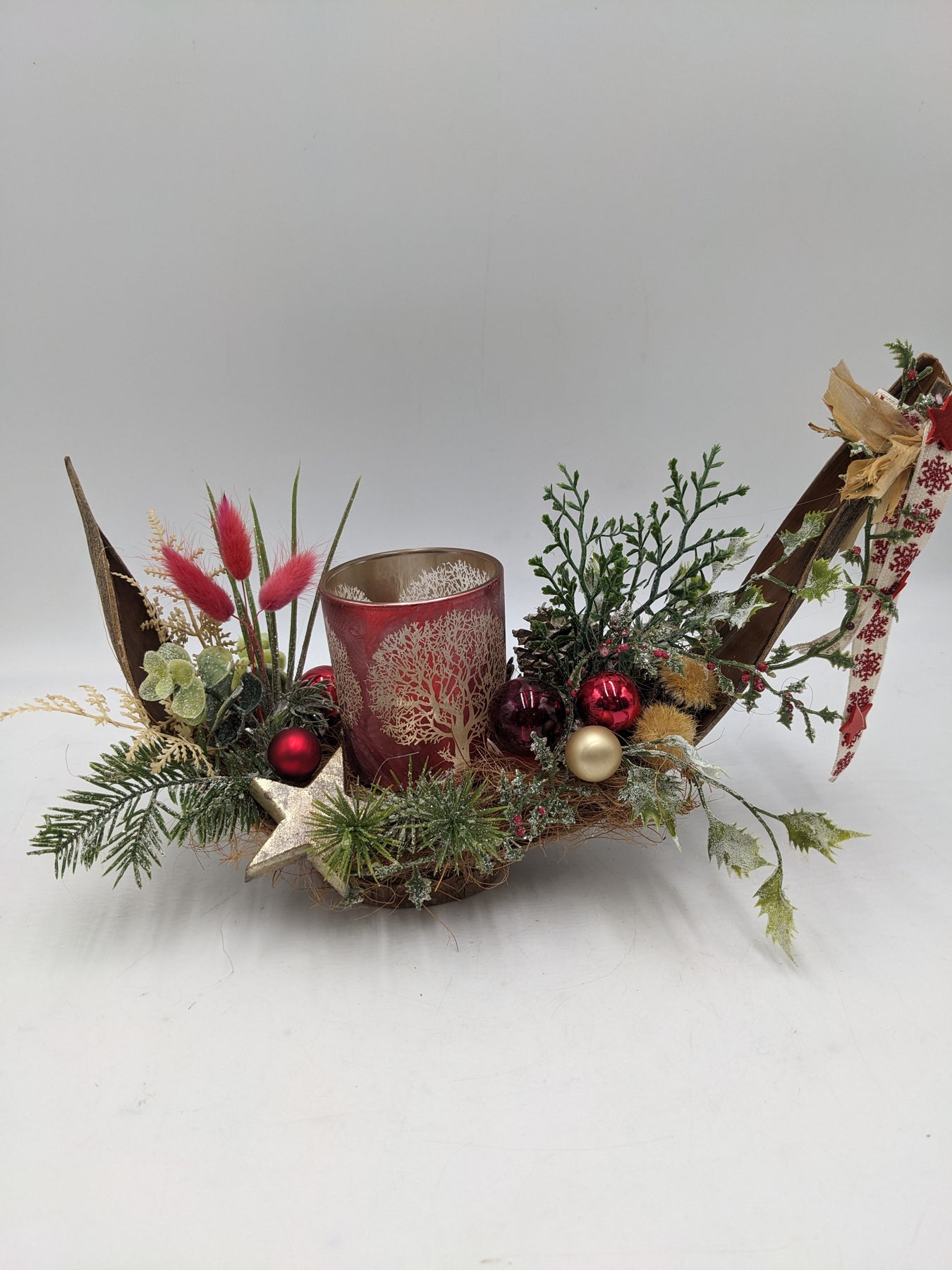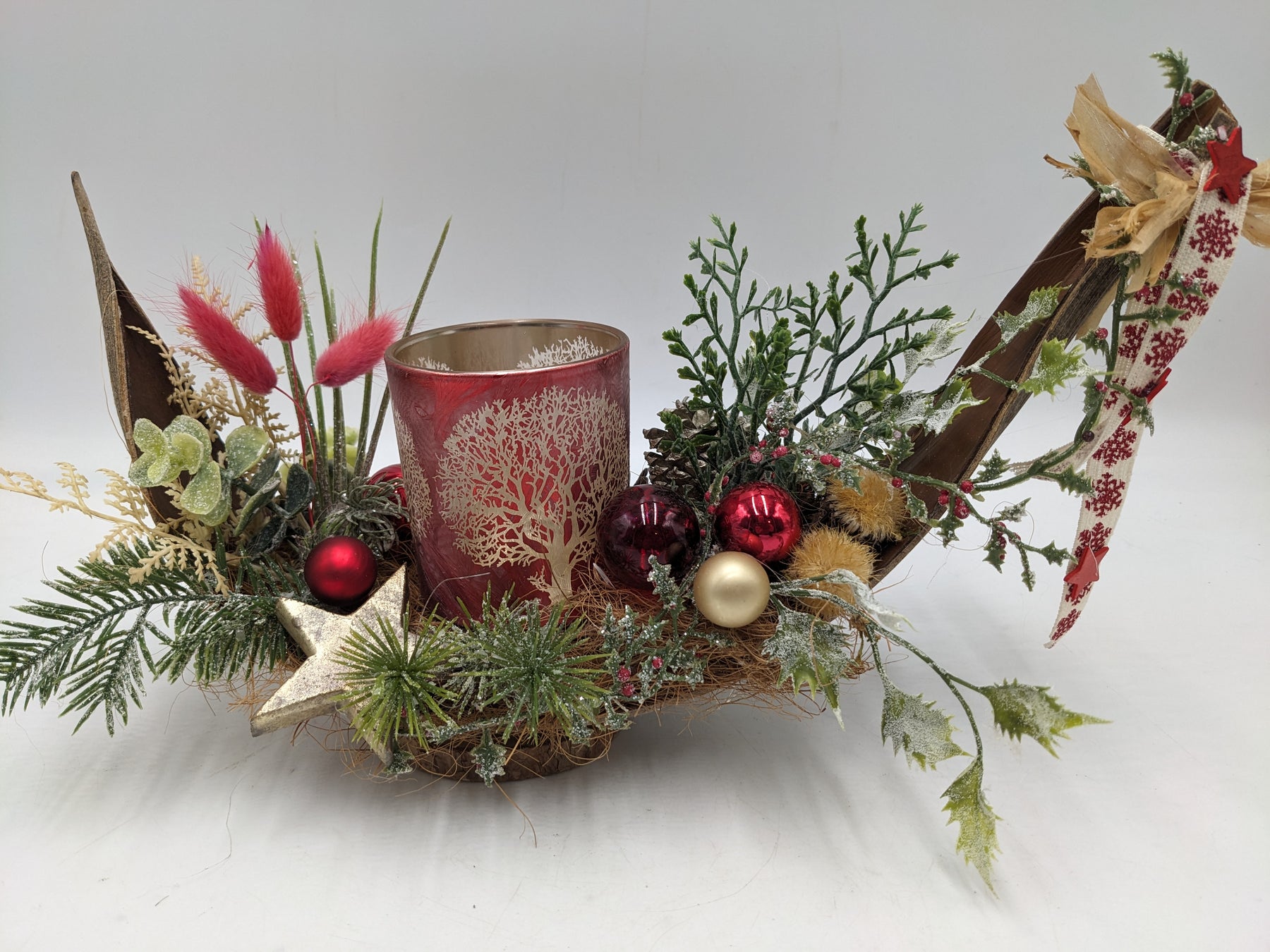 Tischgesteck im Schiffchen mit Teelicht, Kugeln, Schleife, Stern, Gräser und Tanne, Farbe: rot, creme, Höhe: ca. 20 cm, Breite: ca. 30 cm, 3964-2025