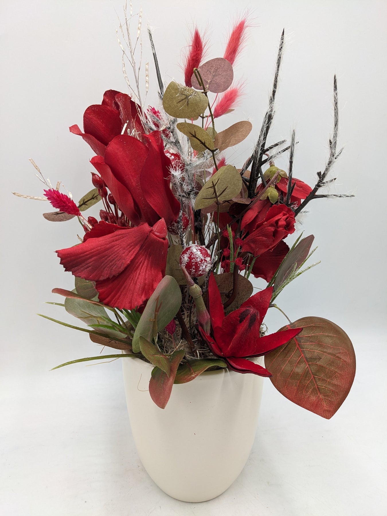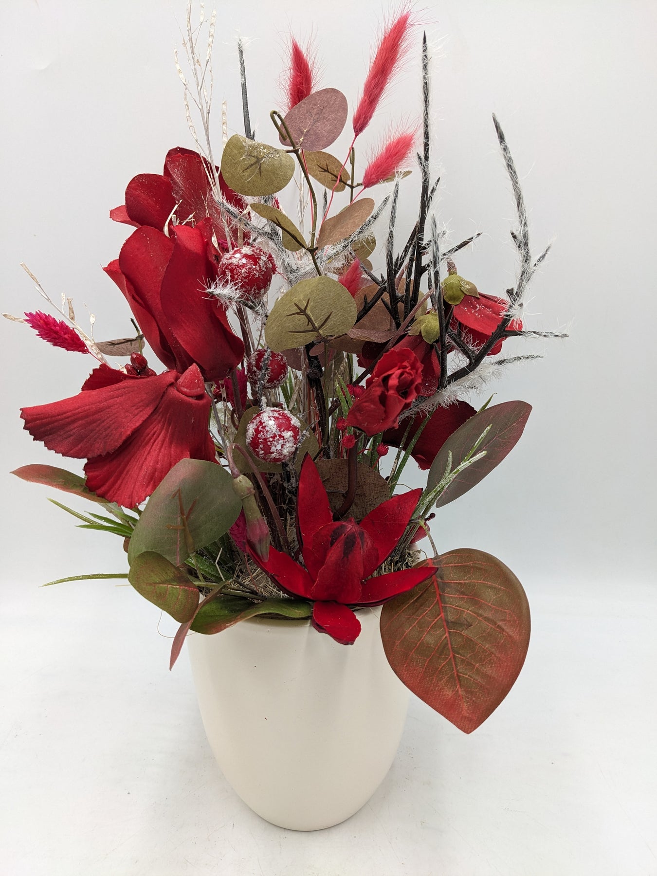 Wintergesteck in intensiven Rot- und Naturtönen mit markanten Blüten als kraftvollem Blickfang. Gestaltet mit roten Rosen, auffälligen Blüten, dekorativen Beeren, filigranen Zweigen und strukturiertem Blattwerk. Zarte Gräser und feine Akzente verleihen dem Arrangement zusätzliche Tiefe und Dynamik. Arrangiert in einem schlichten, cremefarbenen Gefäß, Farbe: rot, Höhe: ca. 39 cm, Durchmesser: ca. 13 cm, 4124-2026