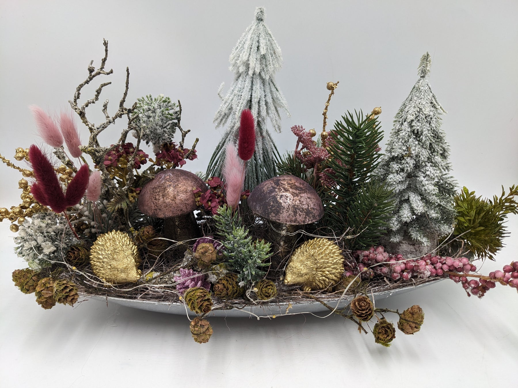 Tischgesteck in Schale, Pilze, Igel, Zapfen, Tannenbäumchen, Beeren, Geäst, Gräser und Tanne, Farbe: rosa, natur, gold, Höhe: ca. 27 cm, Breite: ca. 40 cm, 3620-2025