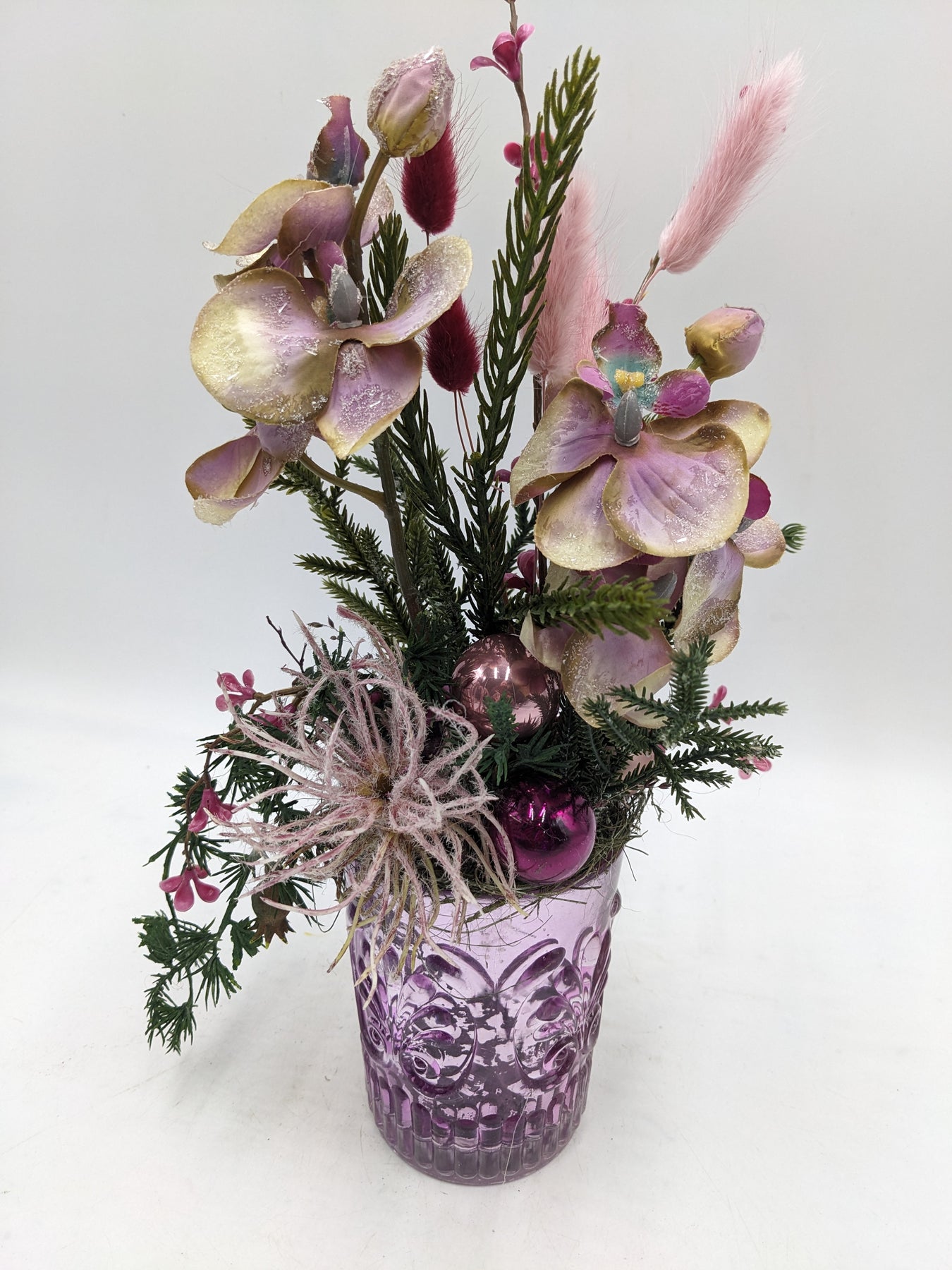Winterliches Tischgesteck im Glasgefäß, gestaltet mit Orchideenm Beeren, Tannengrün, Gräsern, Weihnachtskugeln und feinem Beiwerk, Farbe: lila, Höhe: ca. 32 cm, Durchmesser: ca. 8 cm, 4018-2026