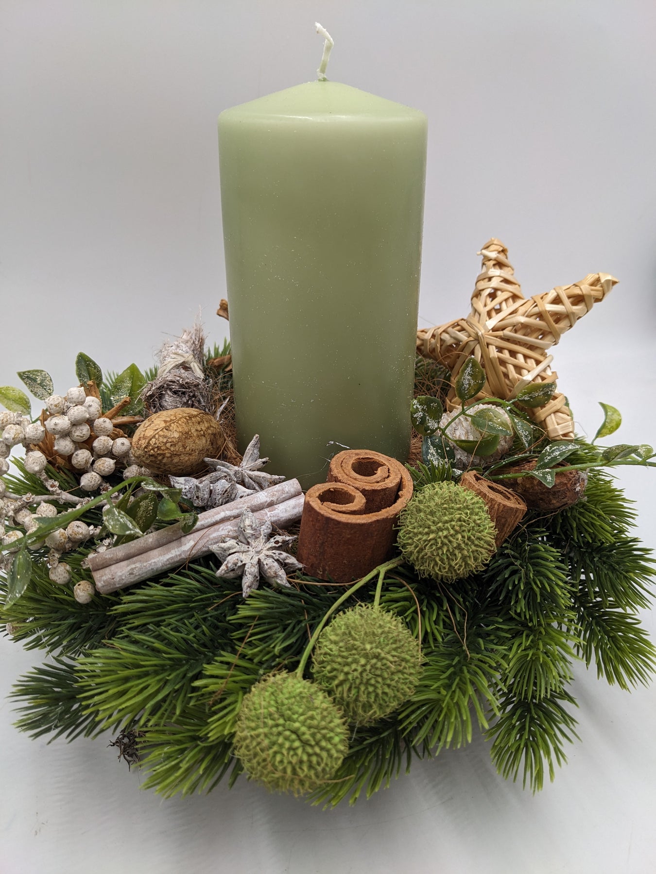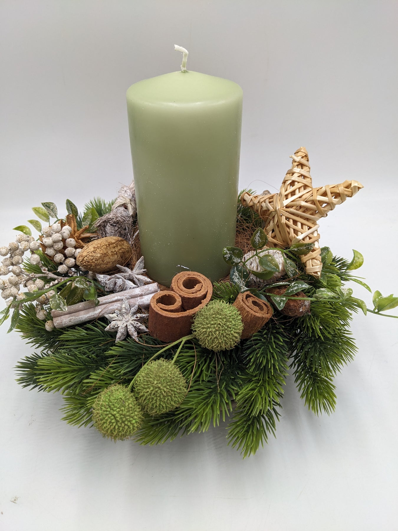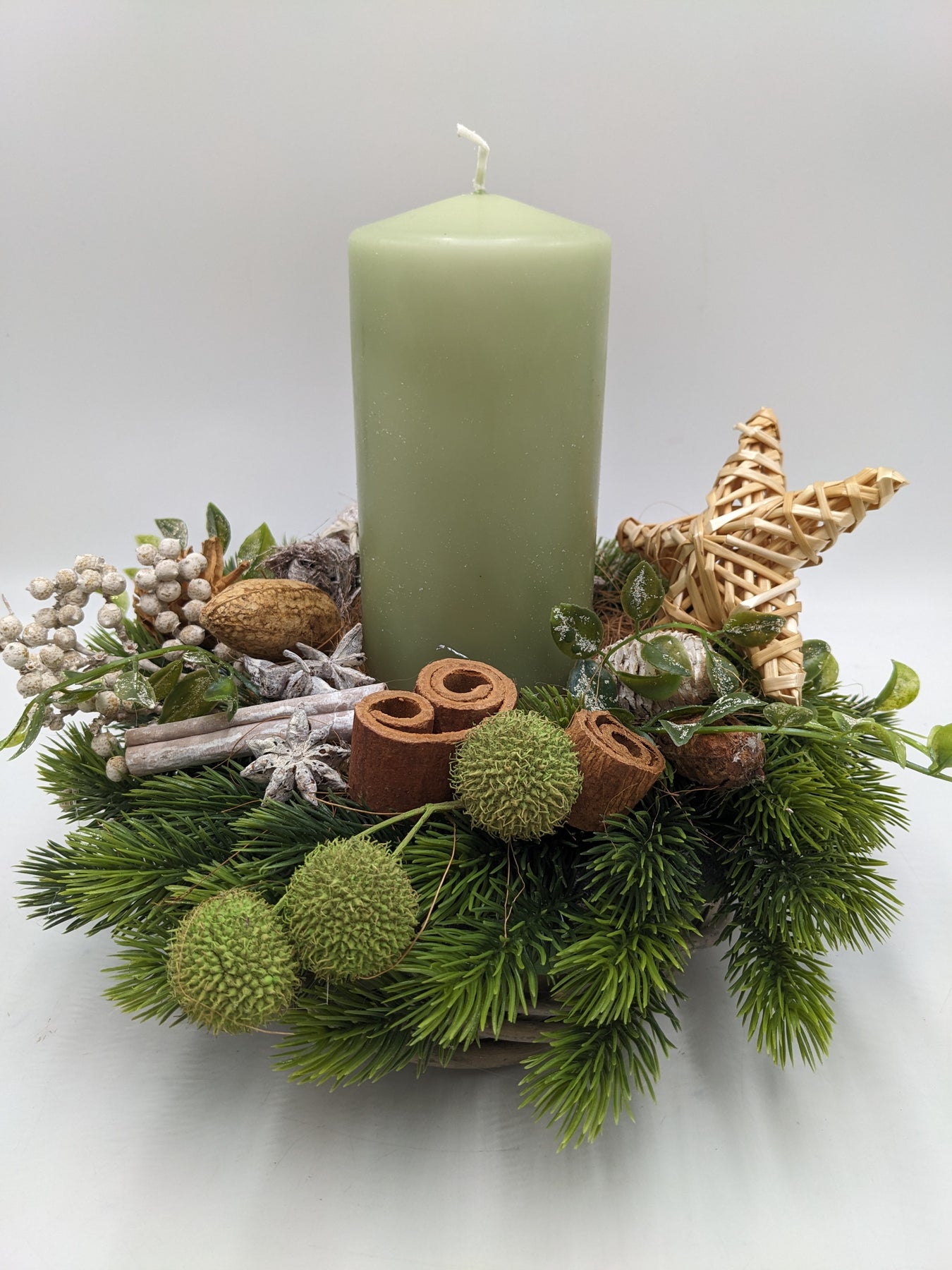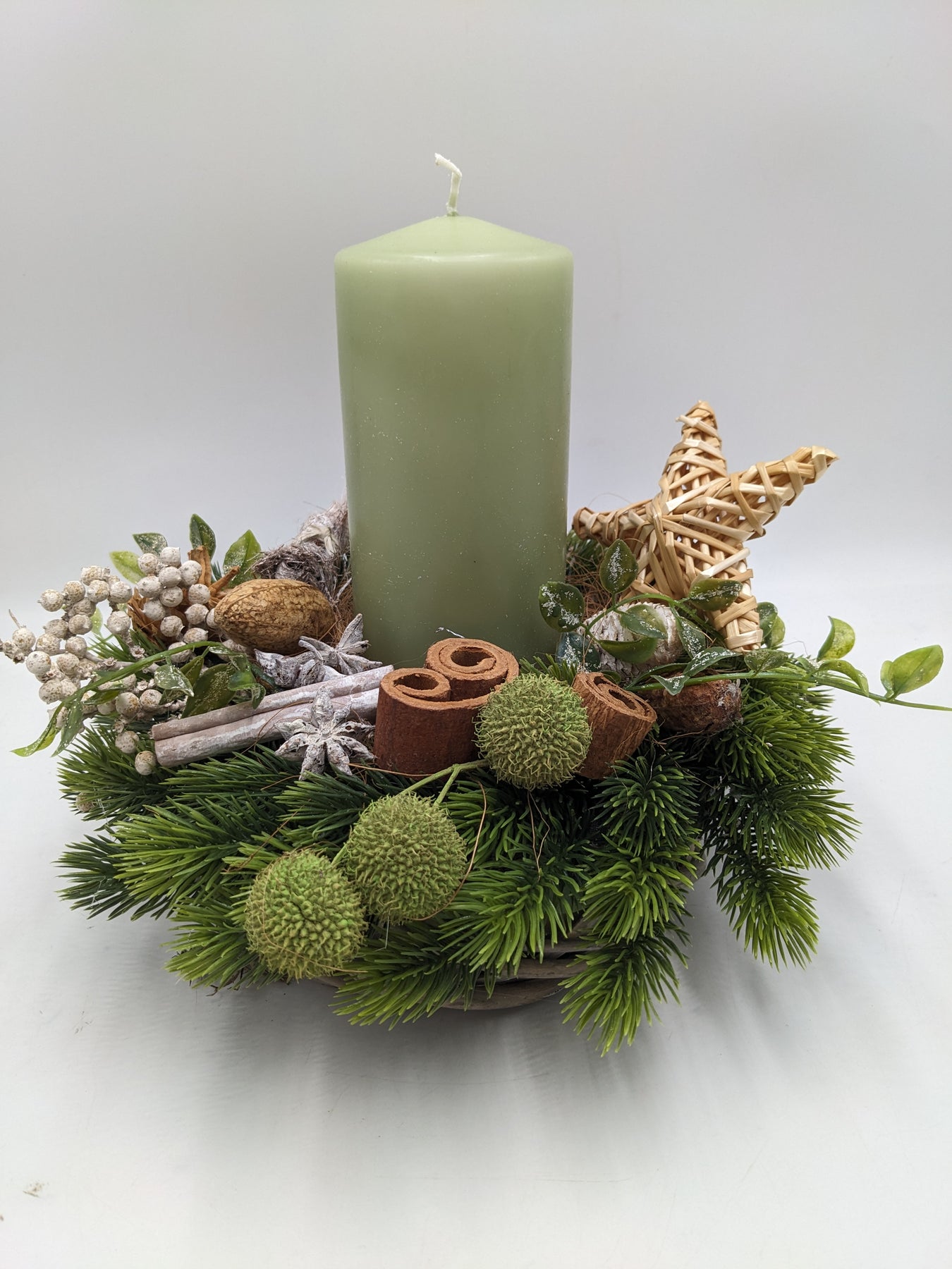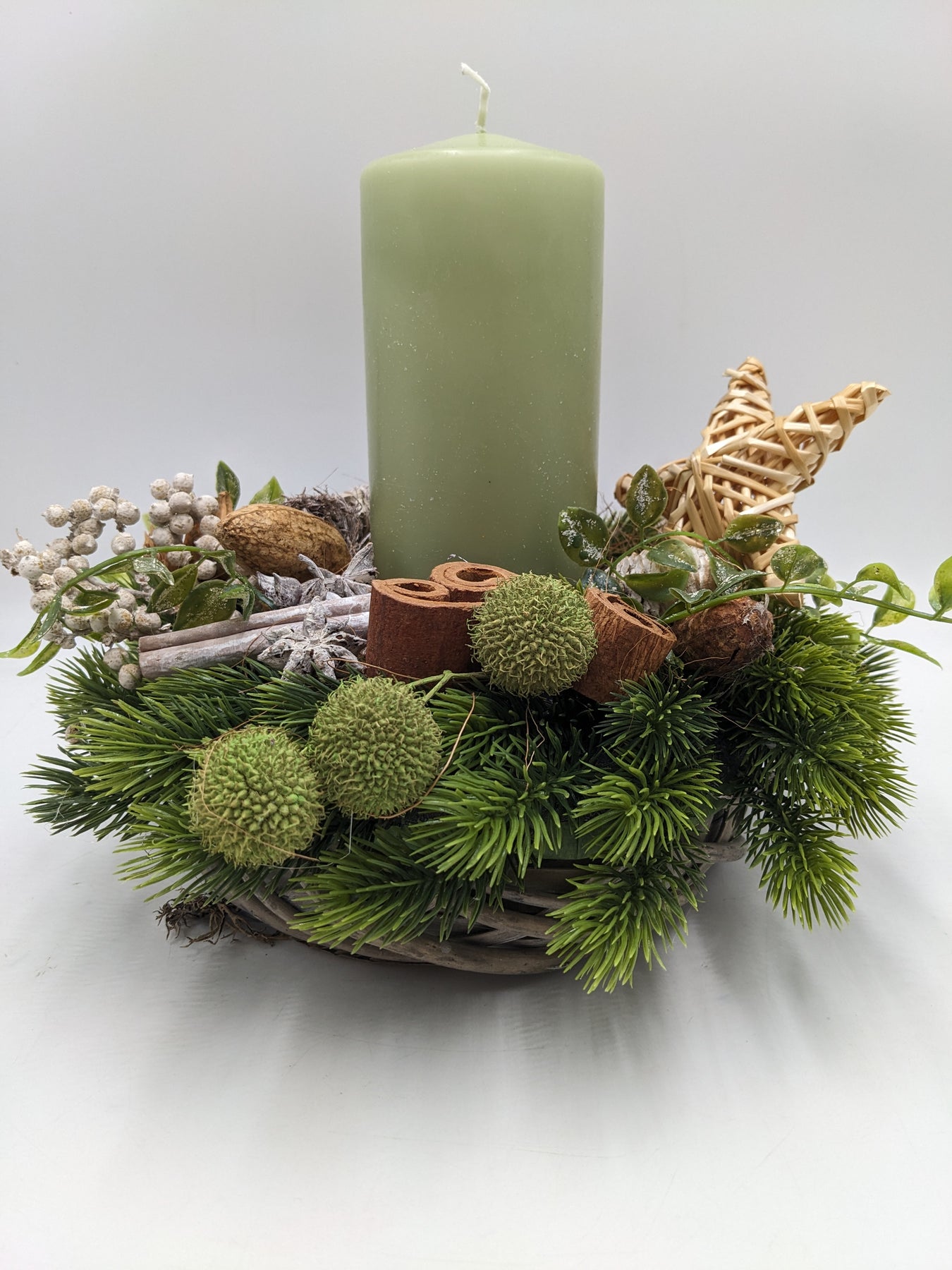 Tischgesteck im Korb mit Kerze, Stern, Zapfen, Zimt, Beeren und Tanne, Farbe: grün, natur, Höhe: ca. 24 cm, Durchmesser: ca. 26 cm, 3904-2025