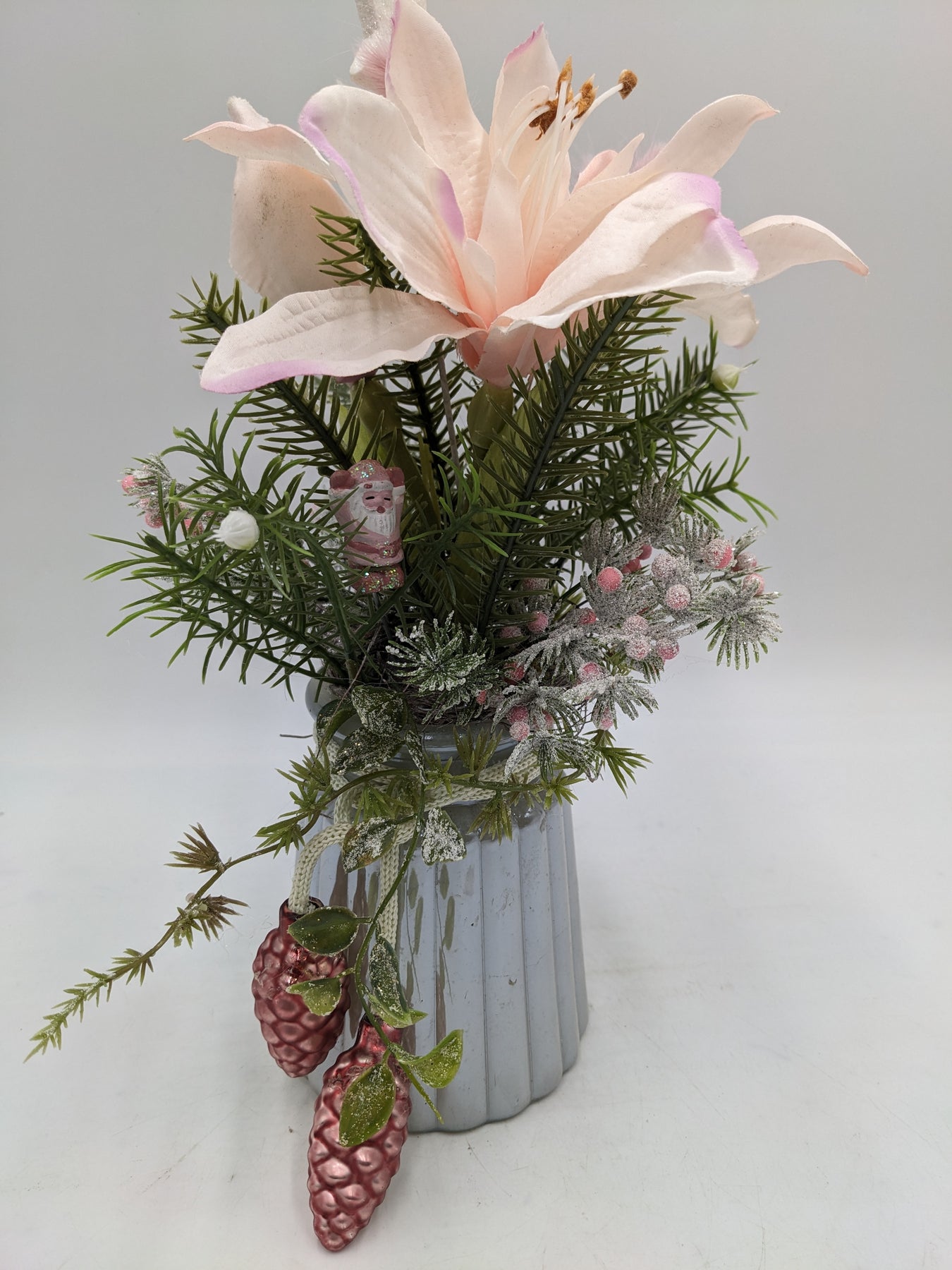 Winterliches Tischgesteck im grauen Keramikgefäß, gestaltet im einer großen Amaryllisblüte, Tannengrün frostigen Zweigen, Zapfen, Beeren, Weihnachtsmannfigur und winterlichem Beiwerk, Farbe: rosa, Höhe: ca. 29 cm, Durchmesser: ca. 10 cm, 4014-2026