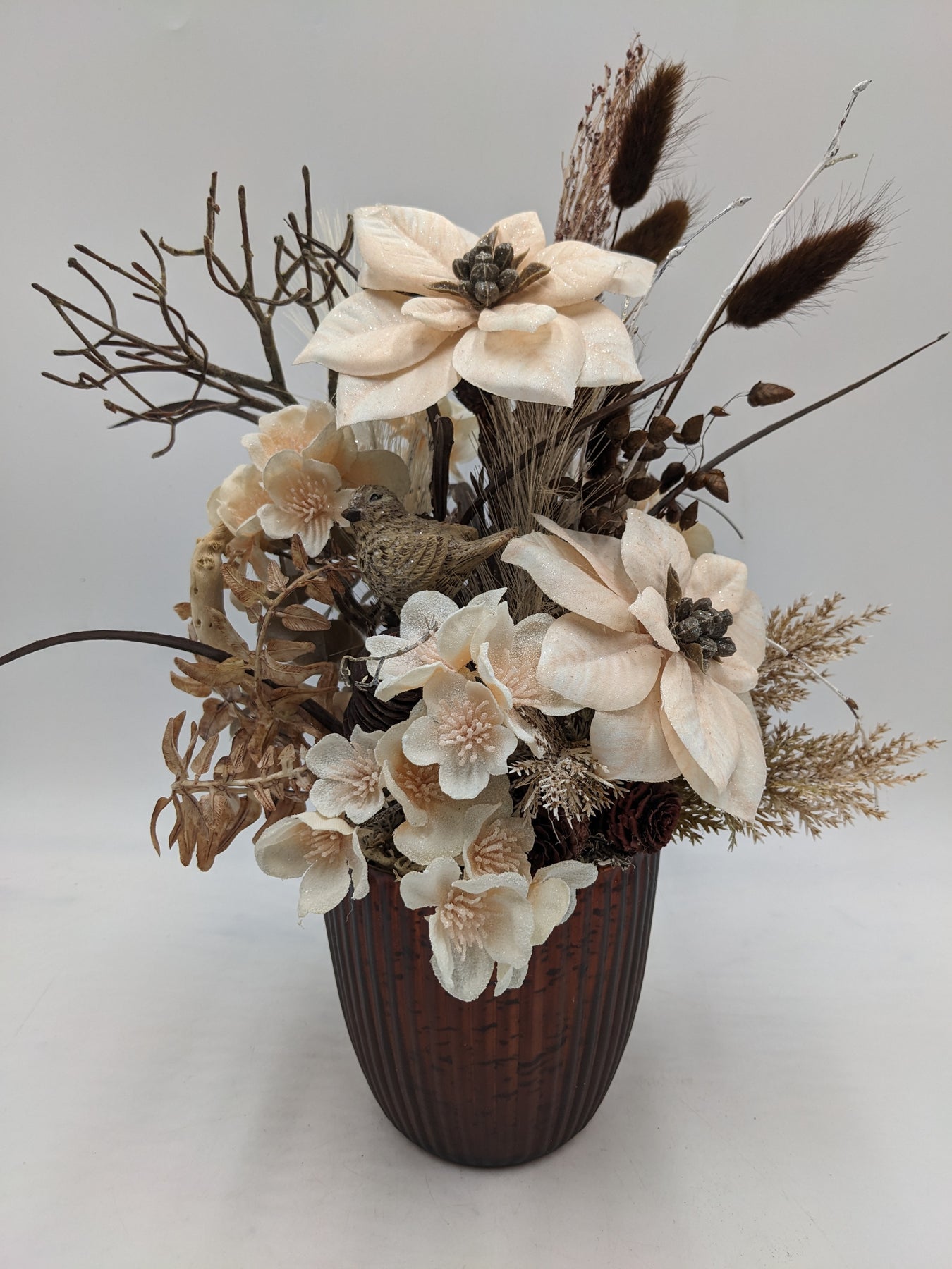 Tischgesteck im Topf, Vogel, Zapfen, Weihnachtsstern, Kirschblüten, Geäst und Gräser, Farbe: creme, braun, Höhe: ca. 35 cm, Durchmesser: ca. 12 cm, 3603-2025