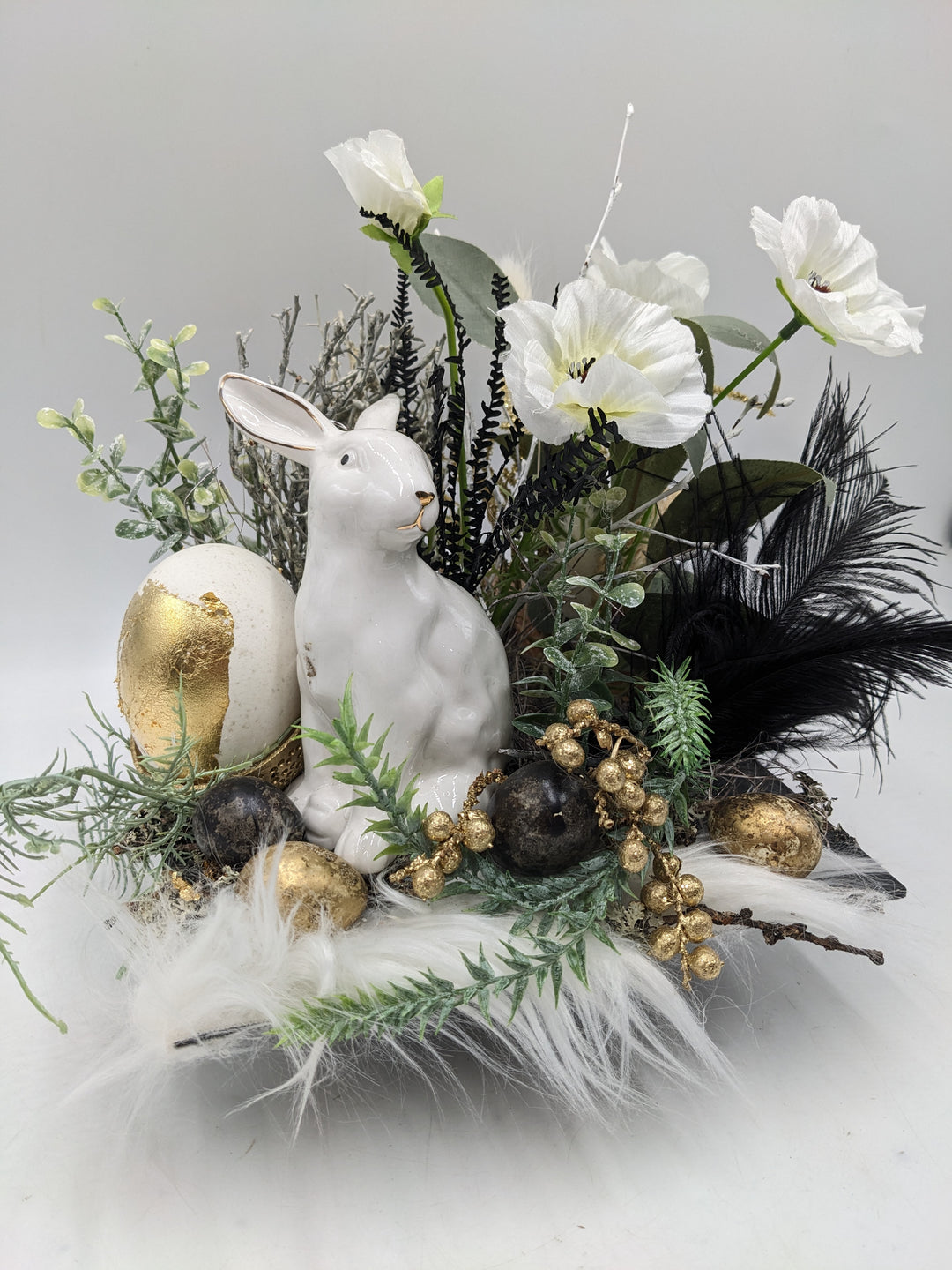Ostergesteck Frühlingsgesteck Eier schwarz weiss gold