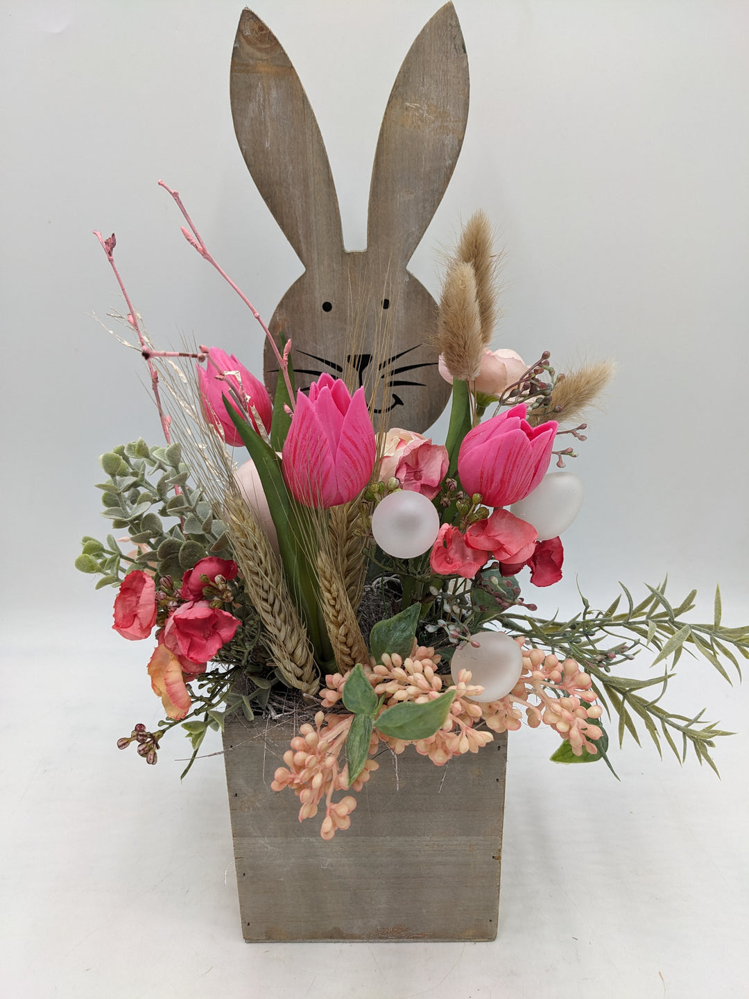 Ostergesteck Frühlingsgesteck Tulpen Gräser Eier rosa