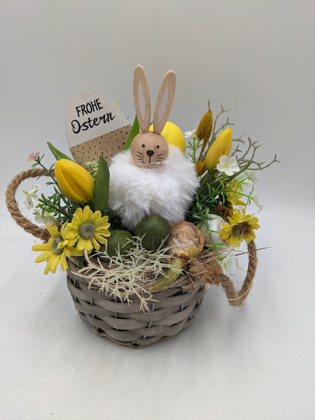 Ostergesteck Frühlingsgesteck Tulpen Gräser Hase gelb