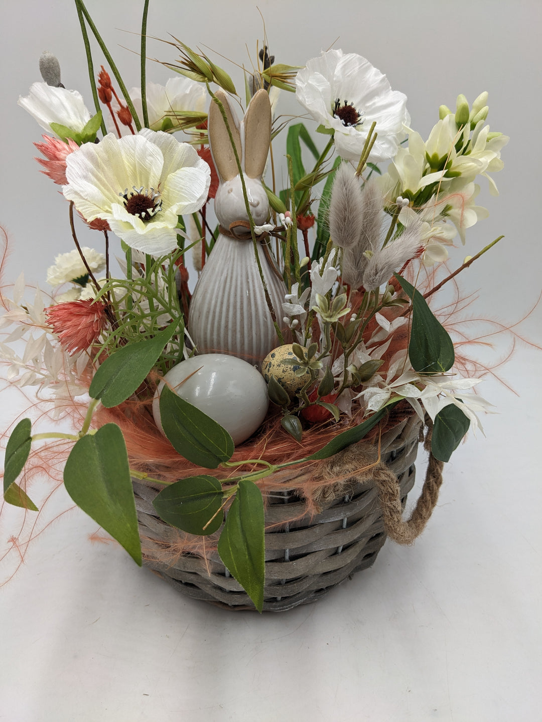 Ostergesteck Frühlingsgesteck Hase gräser weiss apricote