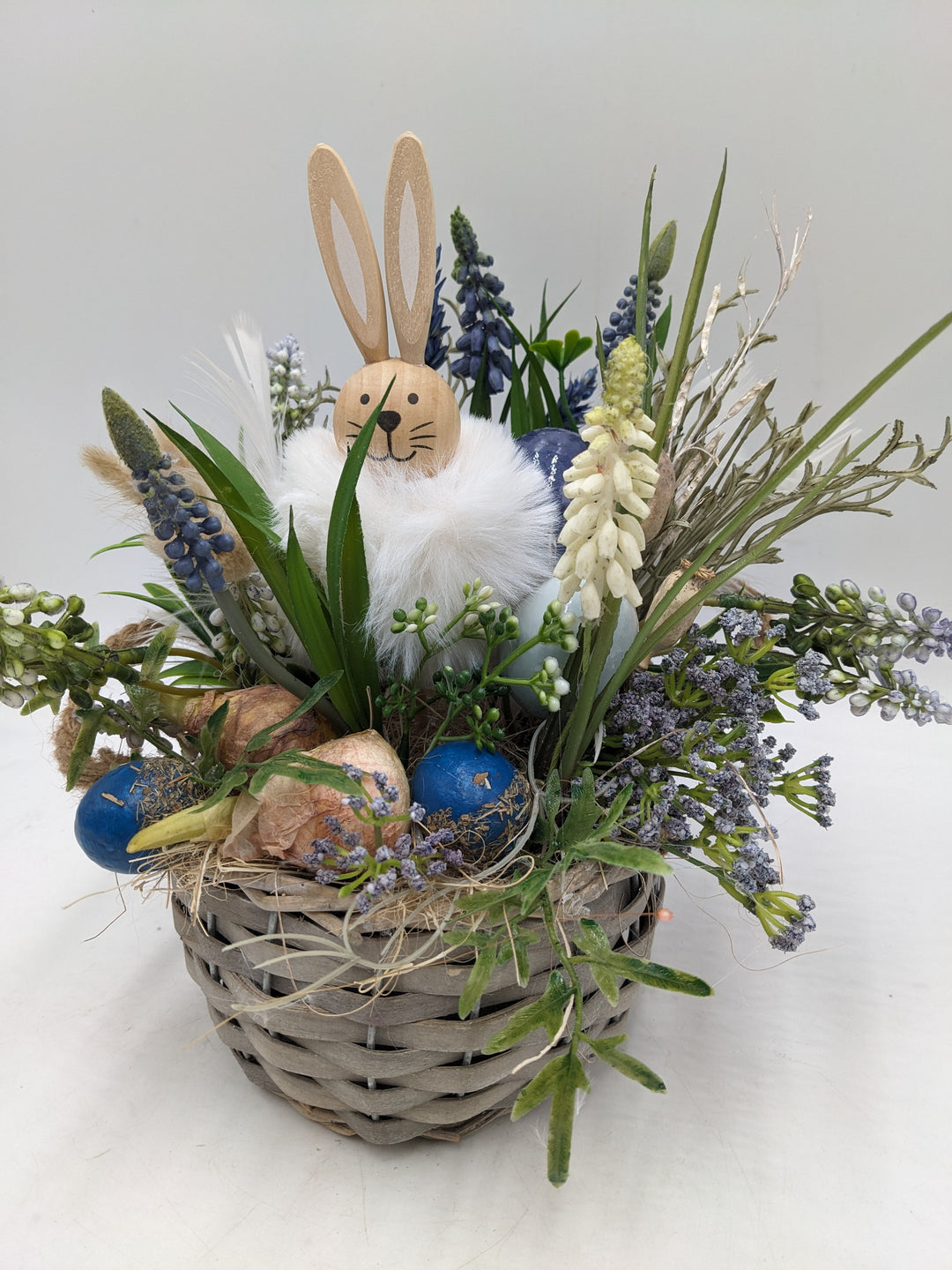 Ostergesteck Frühlingsgesteck Gräser Hase Hyazinthen blau weiss