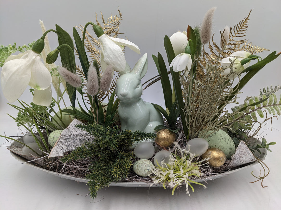 Ostergesteck Frühlingsgesteck Blumenarrangement Krokusse Hase Eier Gerbera weiß gold