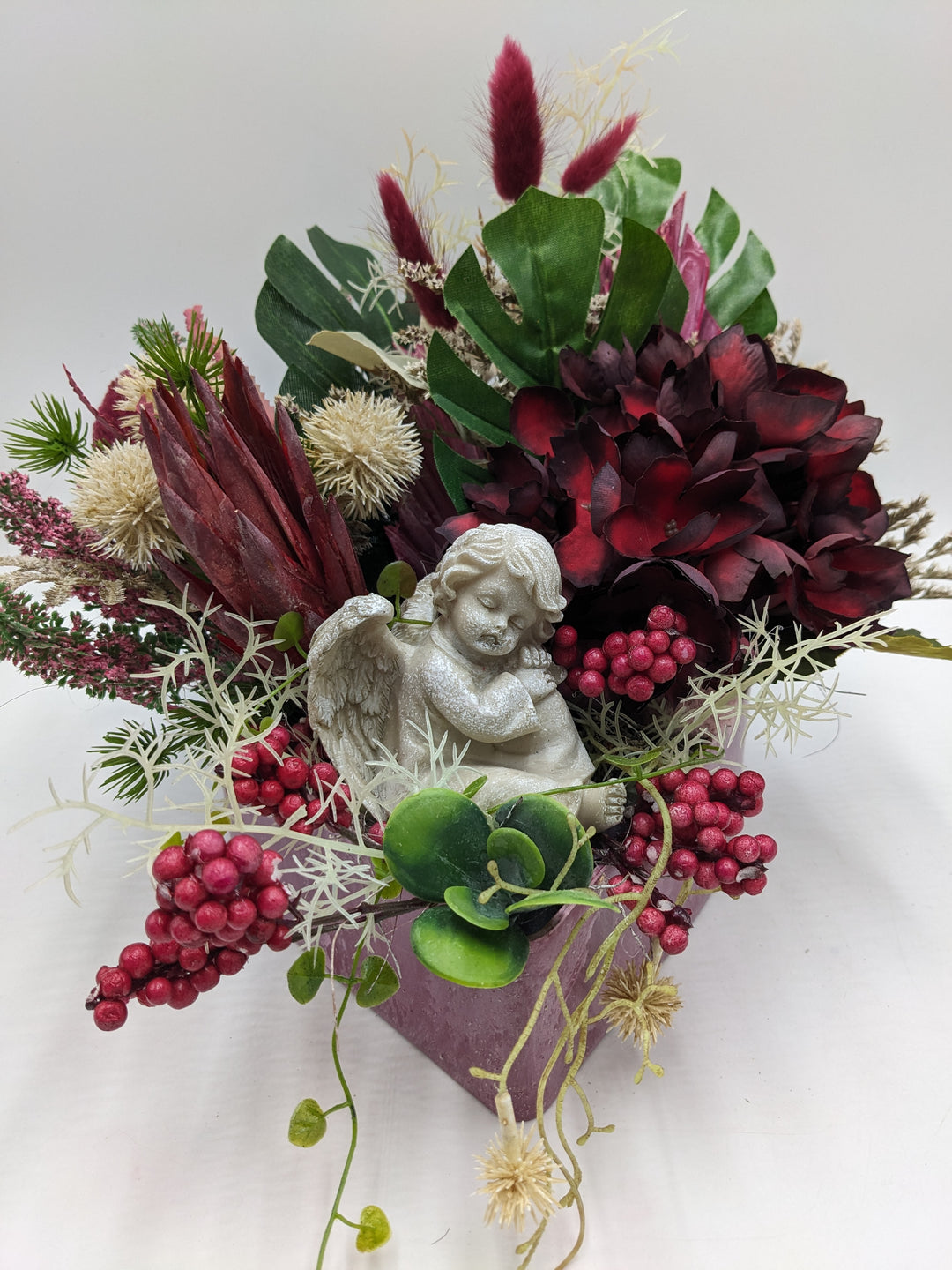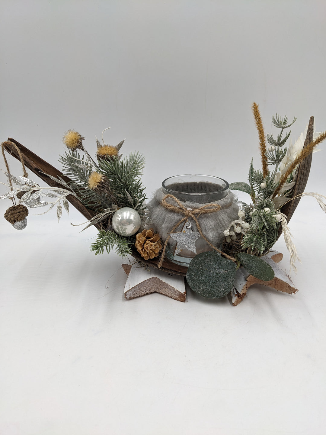 Weihnachtsgesteck Kugel Reh Beeren grün