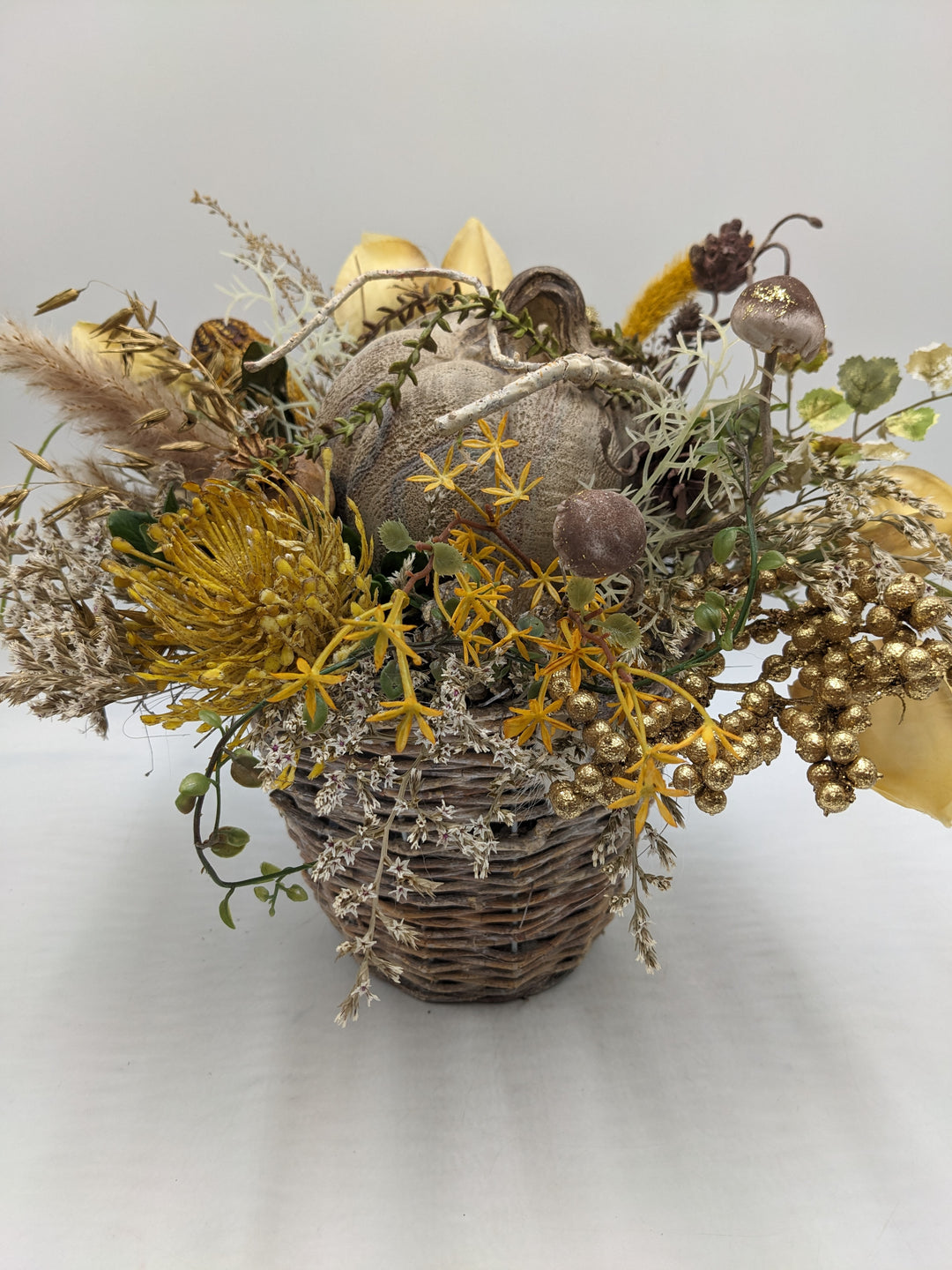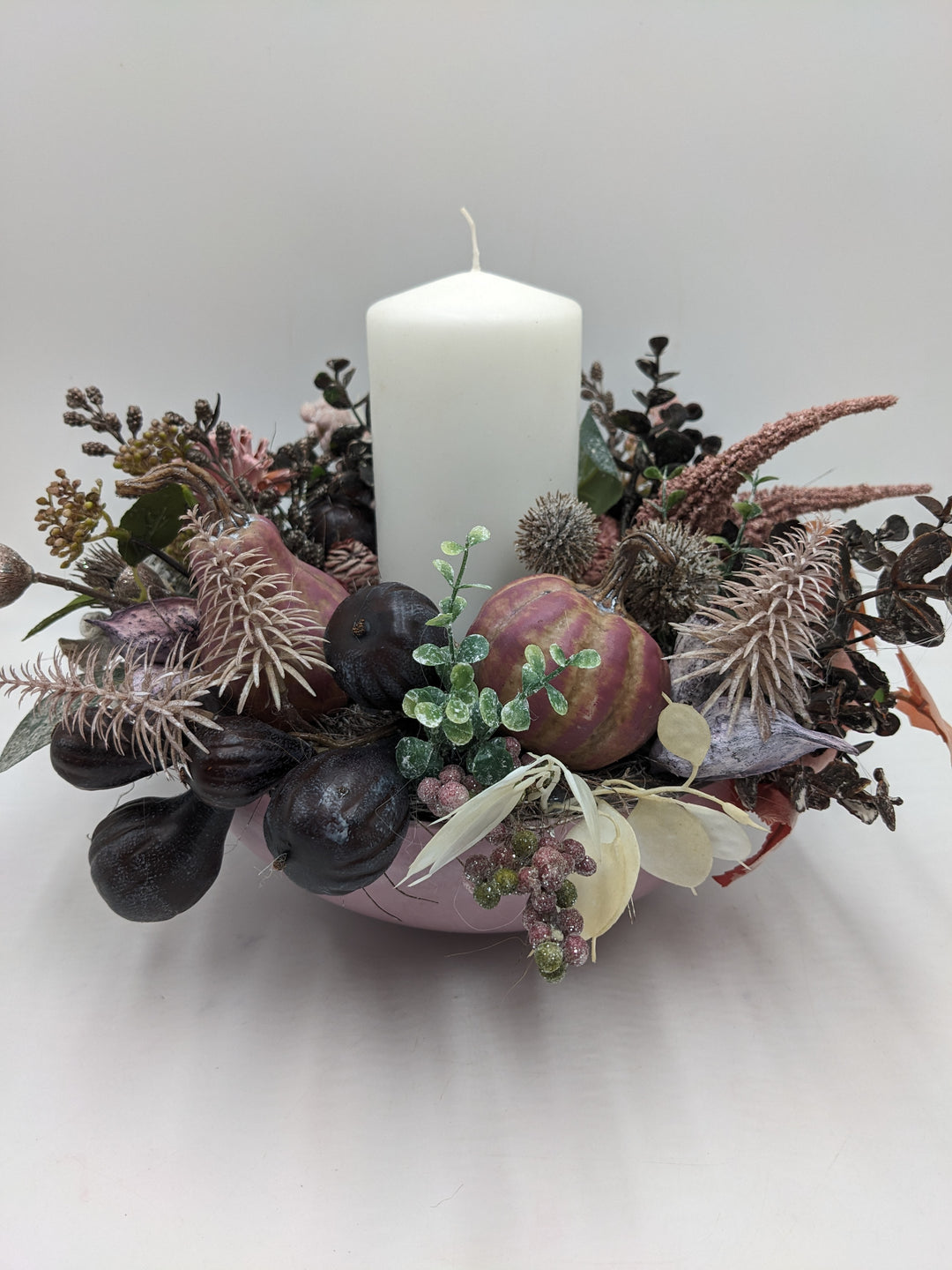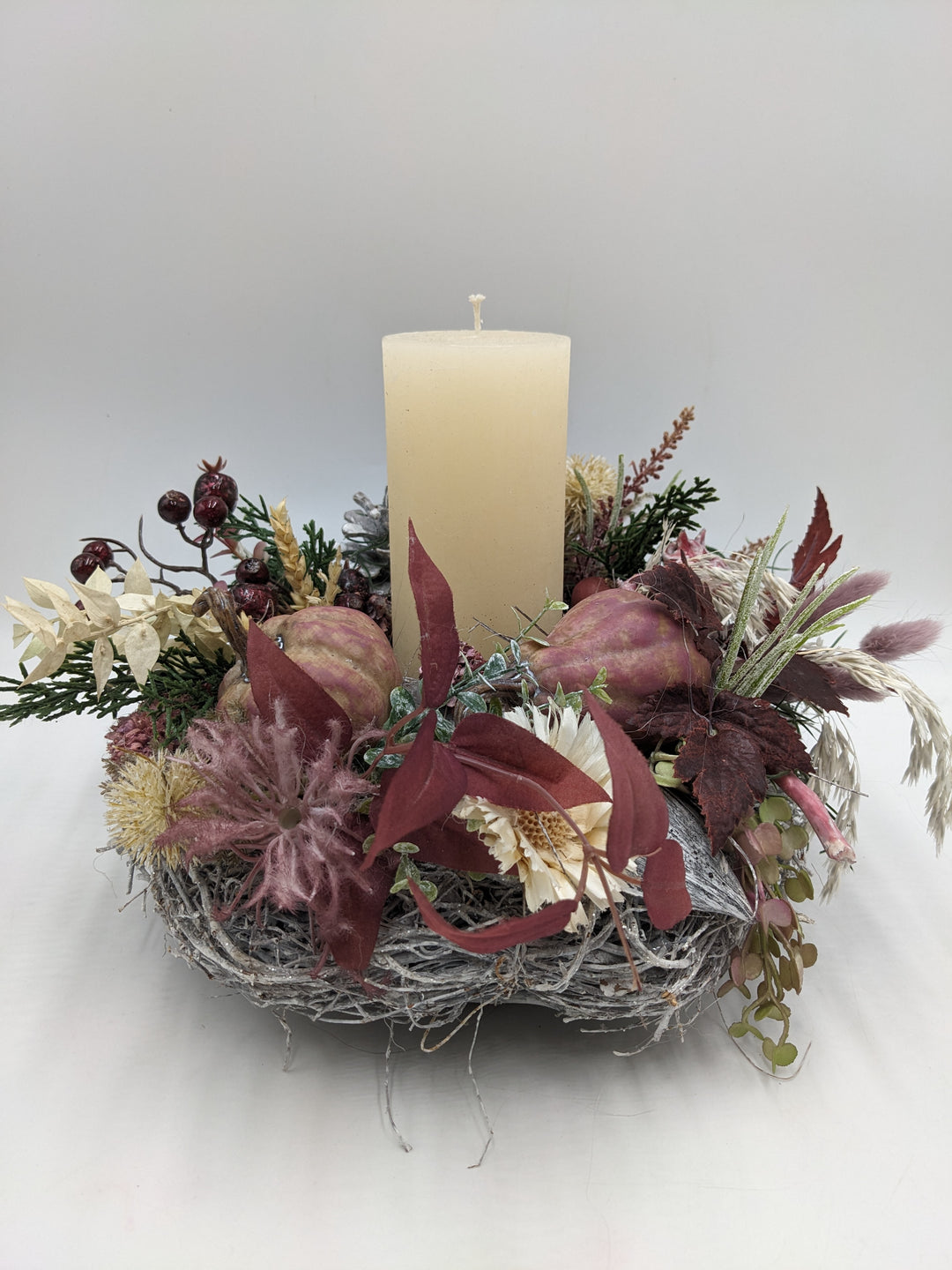 Herbstgesteck Kürbis Zapfen Craspedia weiß