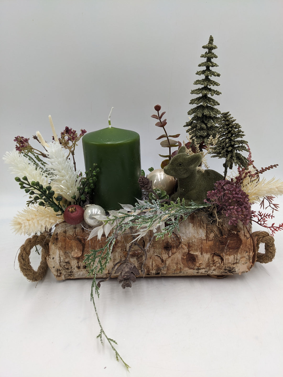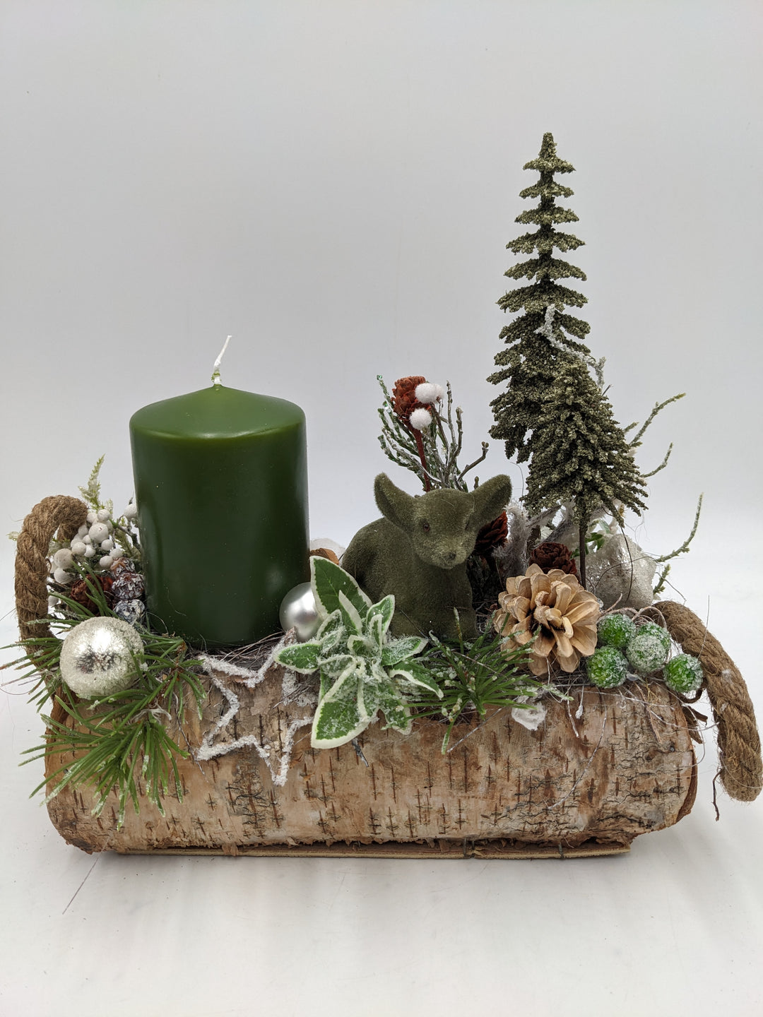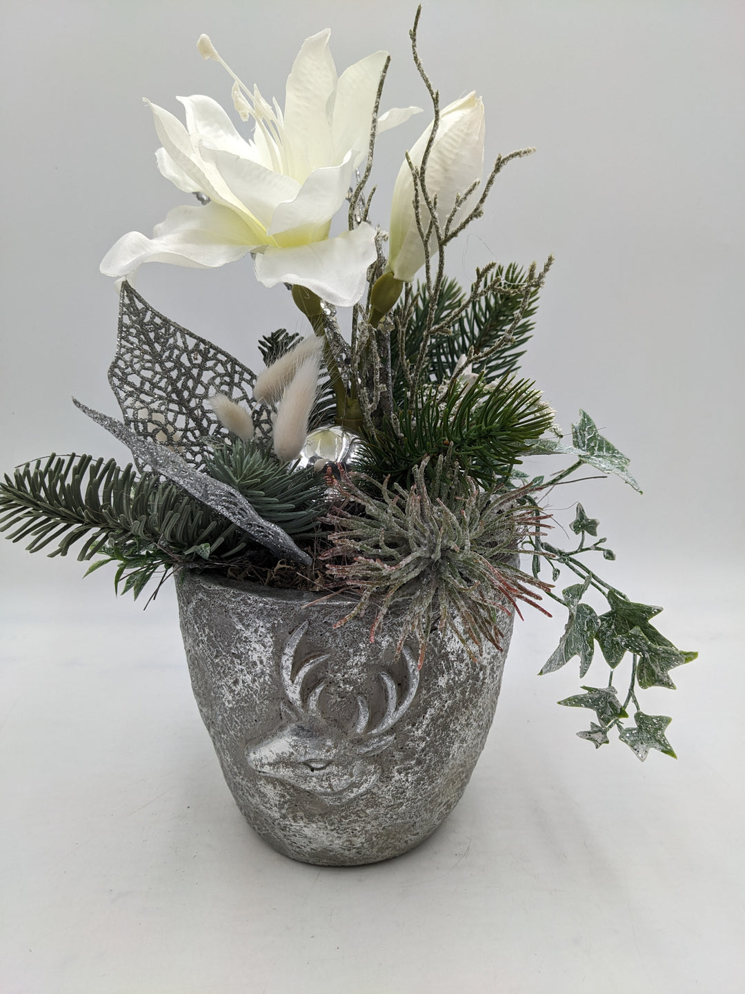 Weihnachtsgesteck Kugel Reh Tannenbäumchen grün