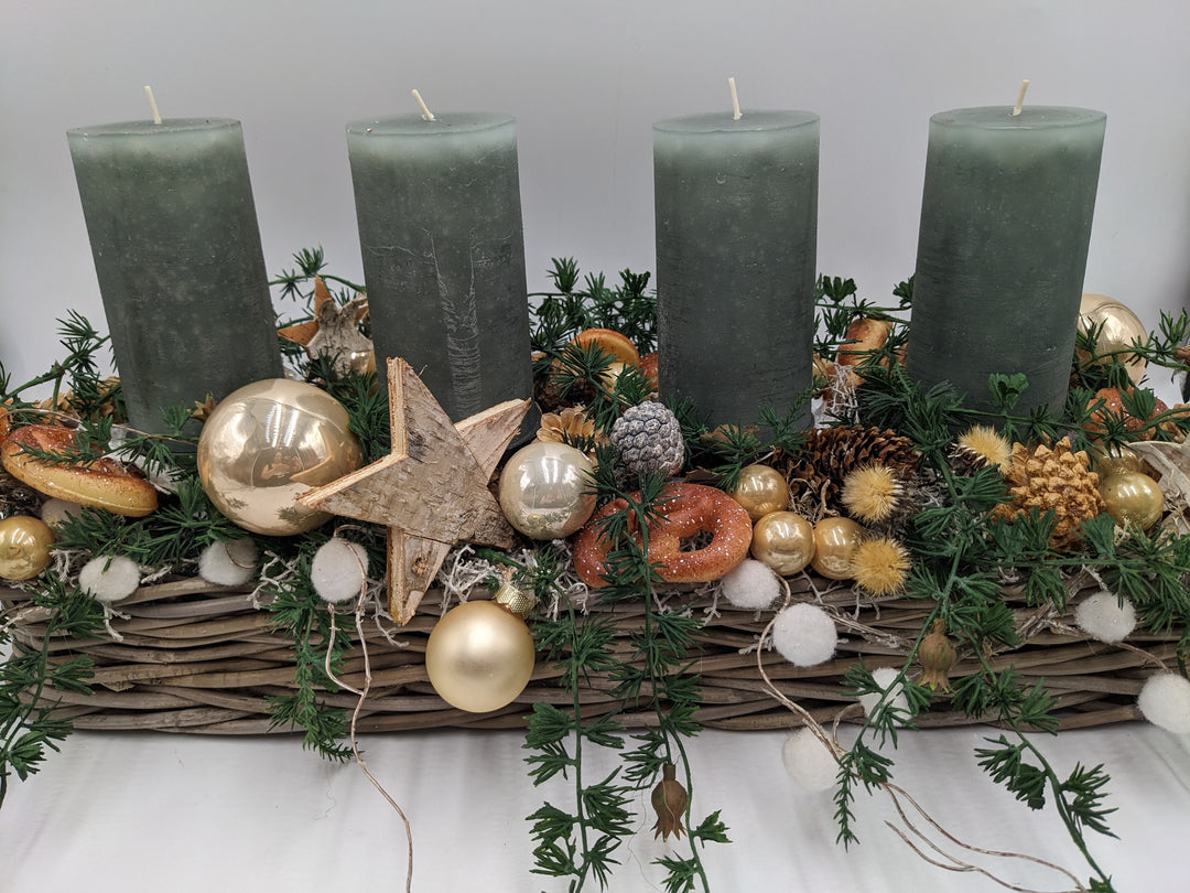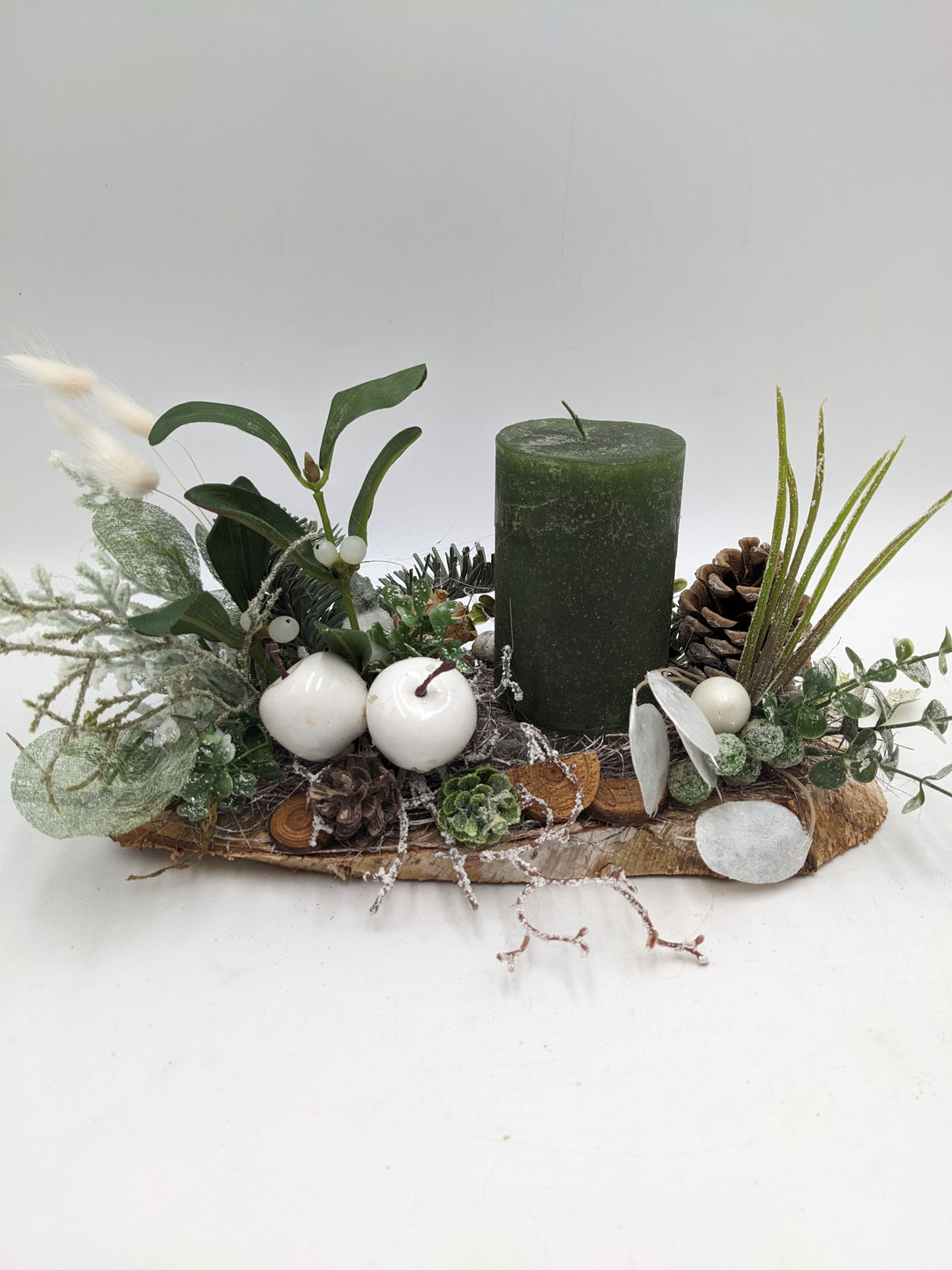 Weihnachtsgesteck Kugel Apfel Baumscheibe grün