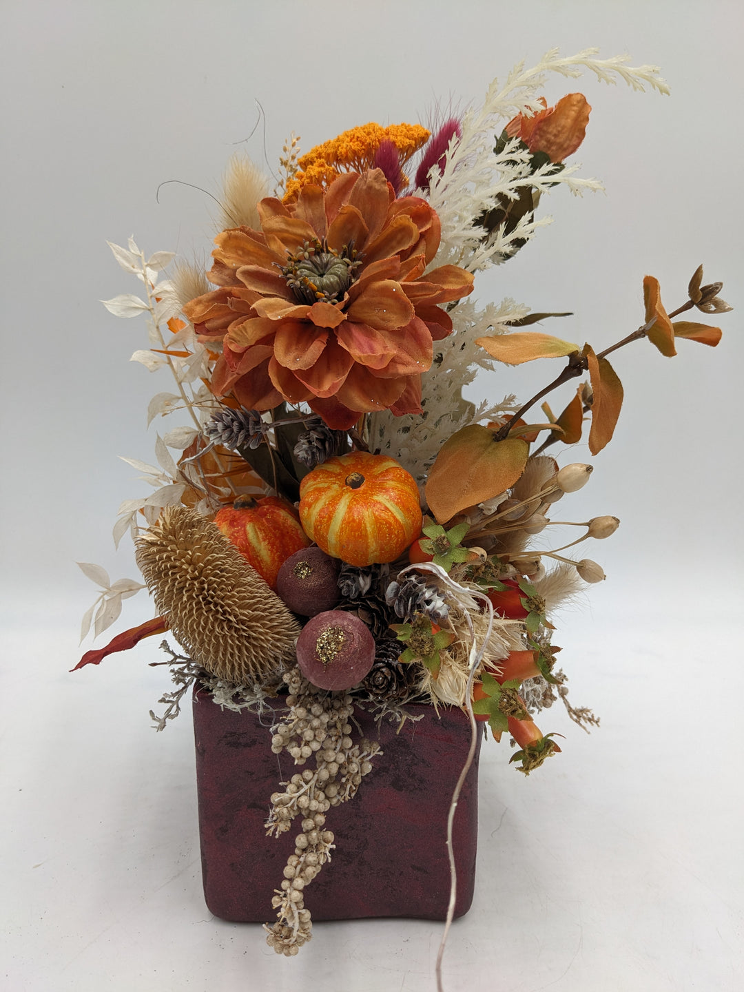 Herbstgesteck Kürbis Zapfen Chrysantheme orange