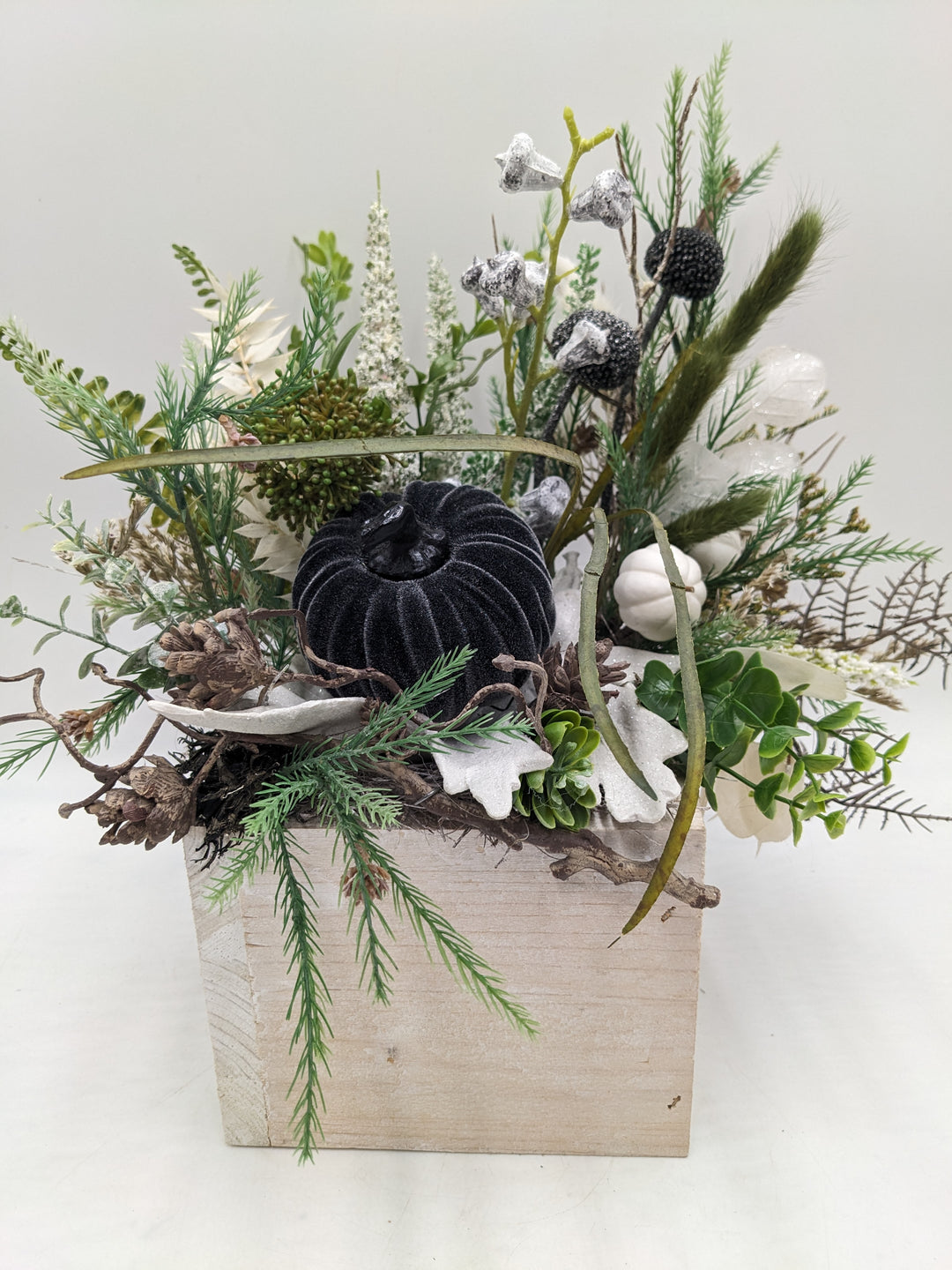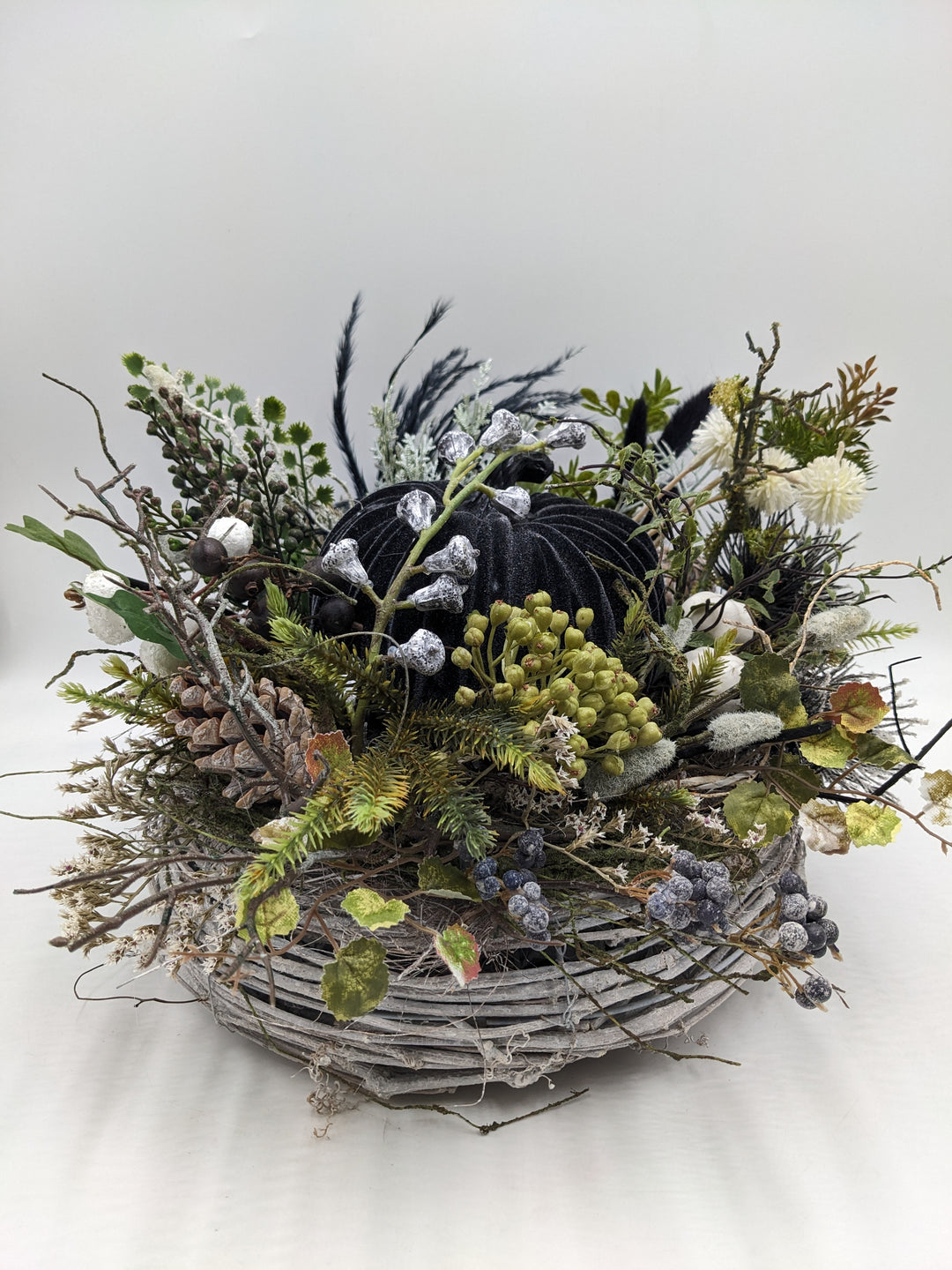 Herbstgesteck Kürbis Zapfen Beeren schwarz